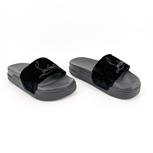 Christian Louboutin "Navy Pool" Logo Embroidered Slide Sandals in Black Velvet Size 37