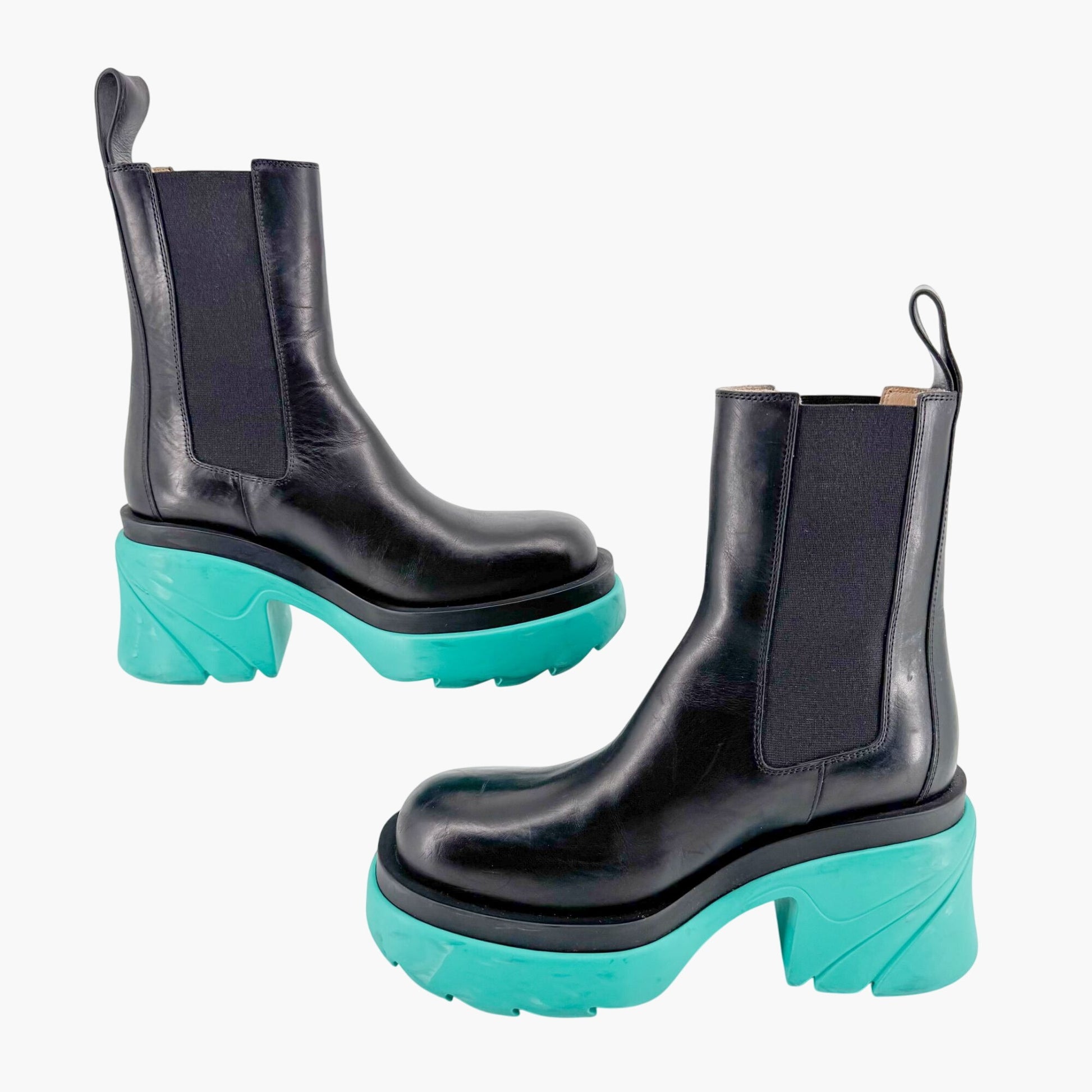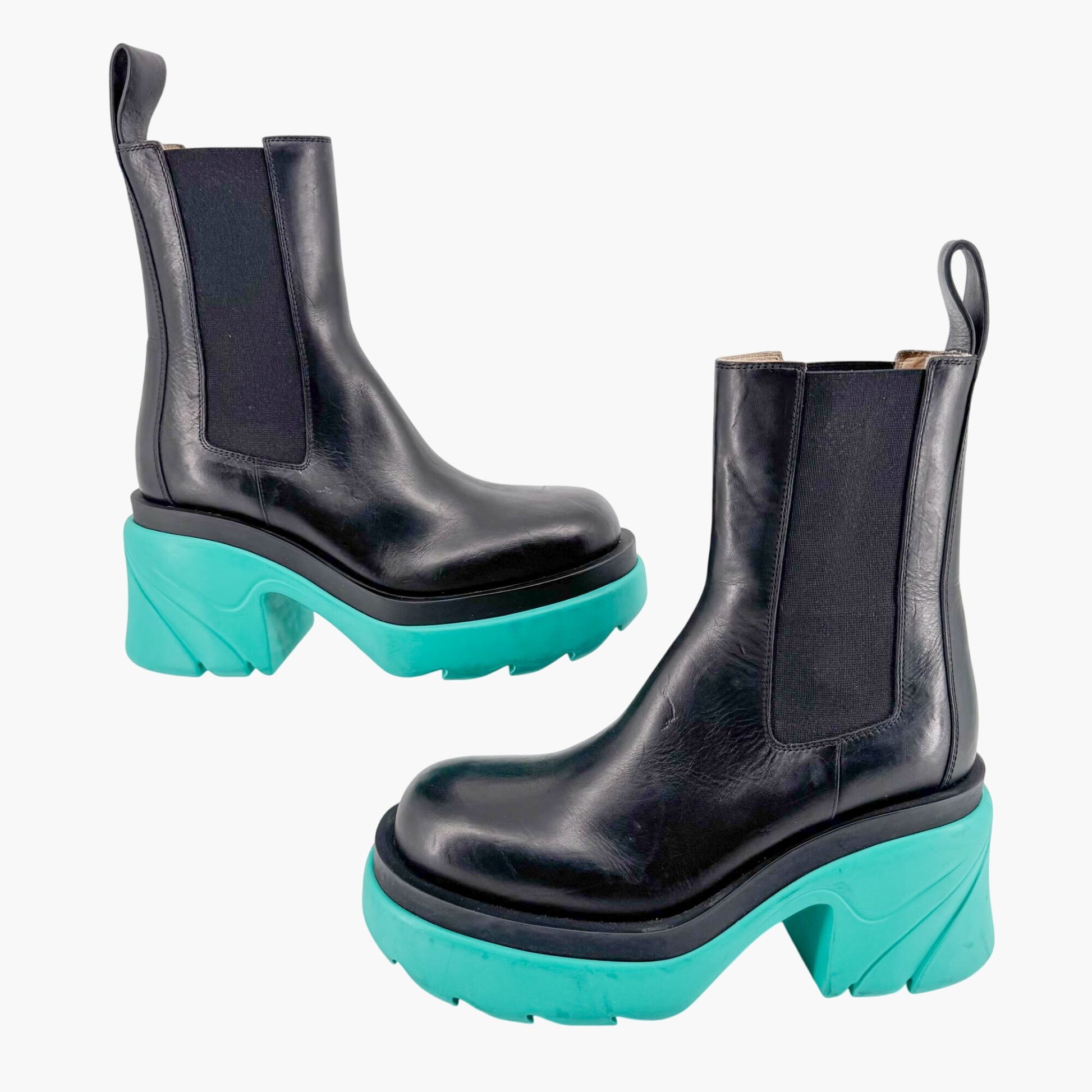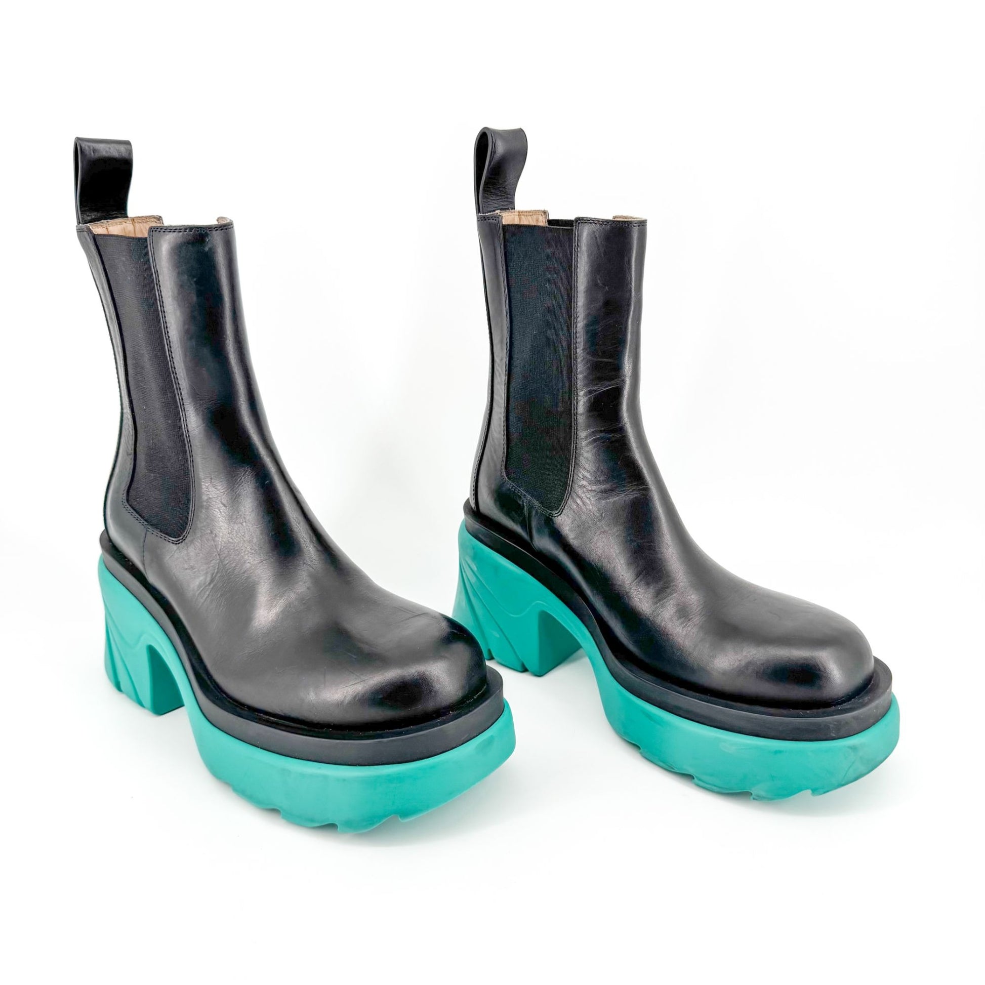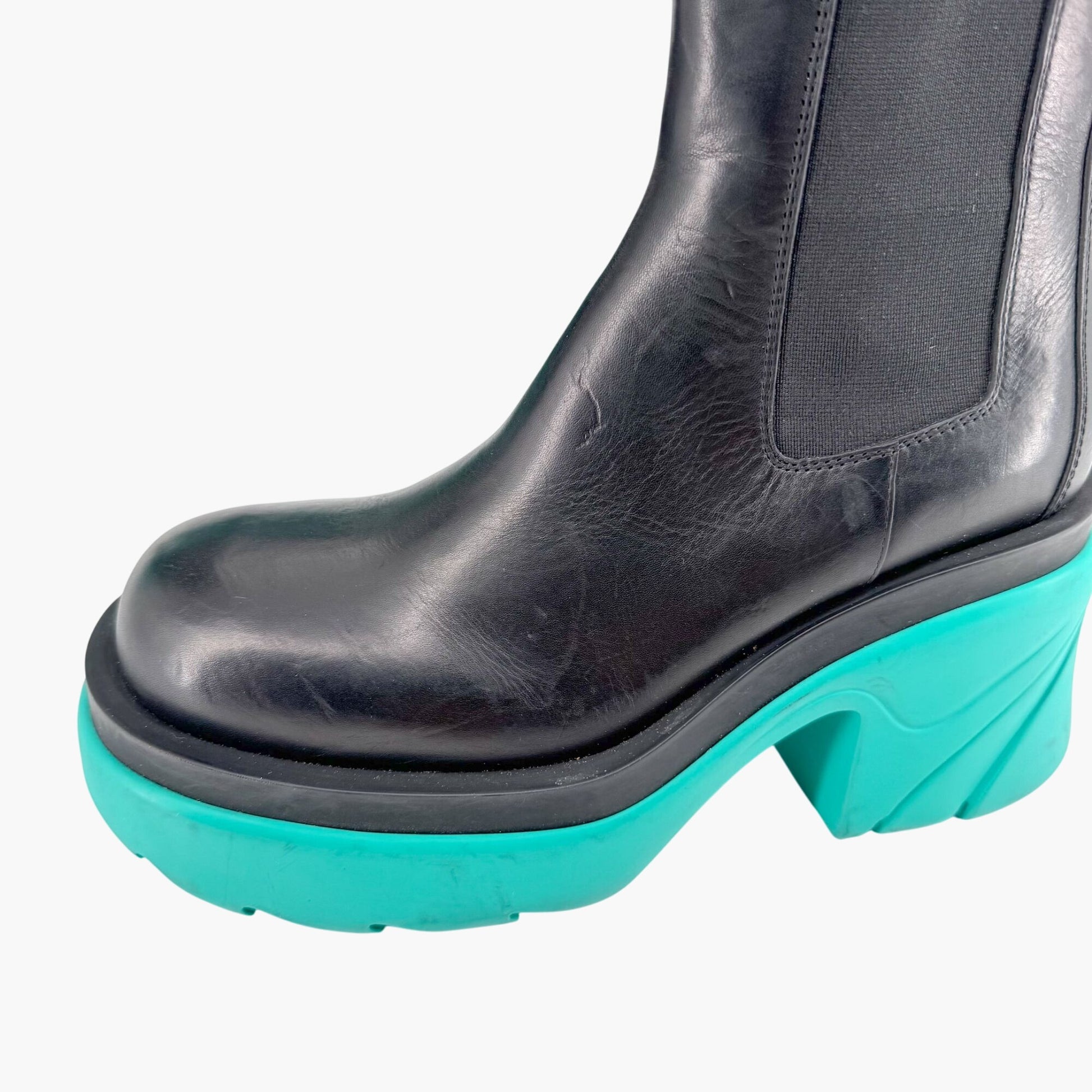 Bottega Veneta Flash Chelsea Ankle Boots EU 38 US 8 Black Leather Teal Heel Tire