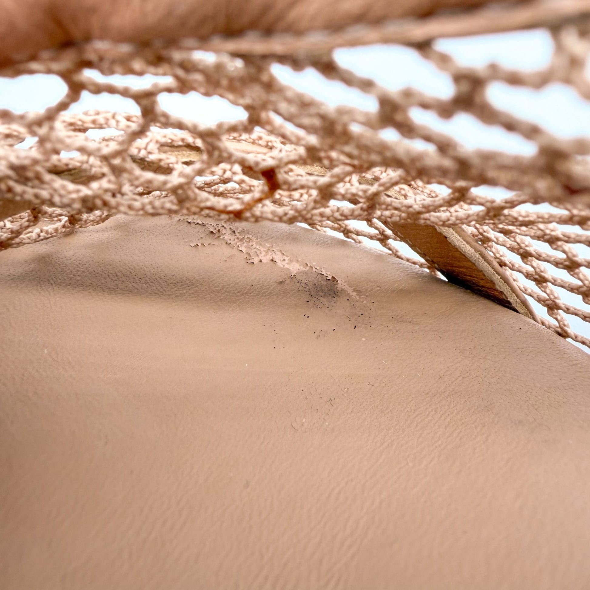 These Bottega Veneta Trim Mesh Chain sandals feature beige fishnet mesh uppers framed in leather with gold-tone ankle chains. Set on high 3.9-inch stiletto heels with padded leather footbeds, they showcase the brand’s bold craftsmanship and sculptural design — a refined choice for evening or event wear.