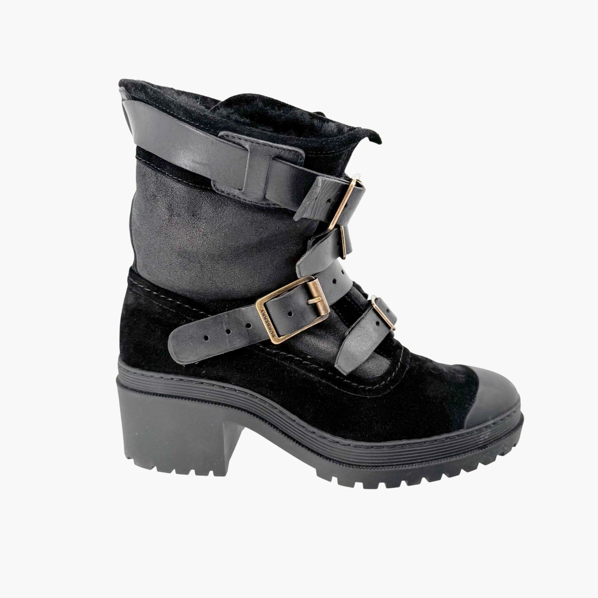 Make a bold statement with these Burberry Aviator motorcycle boots. Featuring a black suede upper, these pull-on boots showcase four leather straps with buckle accents for a true moto look. The rubber cap toe and chunky block heel provide durability and style, while the fur lining offers warmth and comfort, making them ideal for winter. Set on a rubber lug sole, these boots are ready for any rugged adventure. Perfect for those who want to add an edge to their wardrobe or channel their inner biker chic.