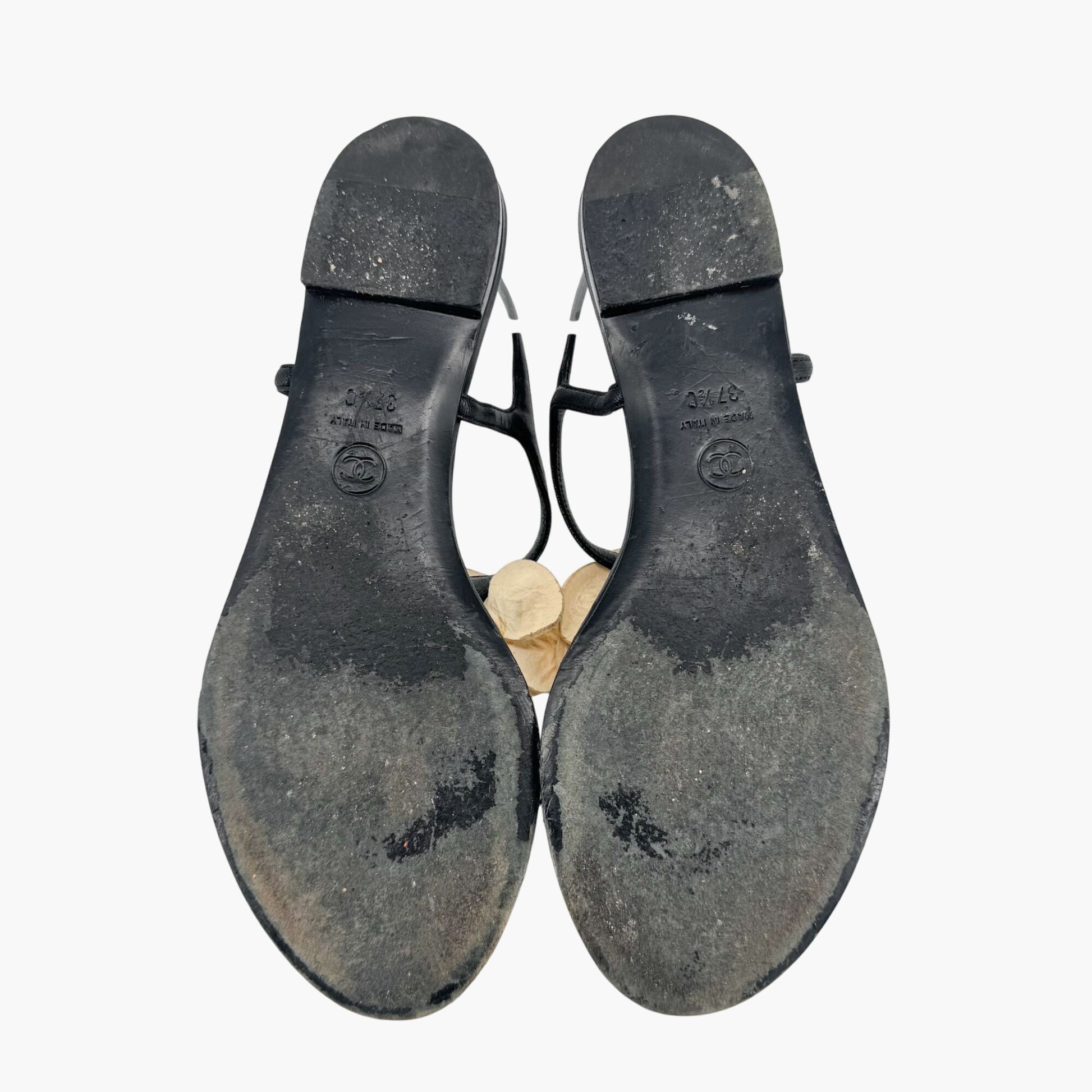 Chanel Camellia Flower CC Sandals Size 37.5C US 6.5-7 Black Leather Flat T-Strap