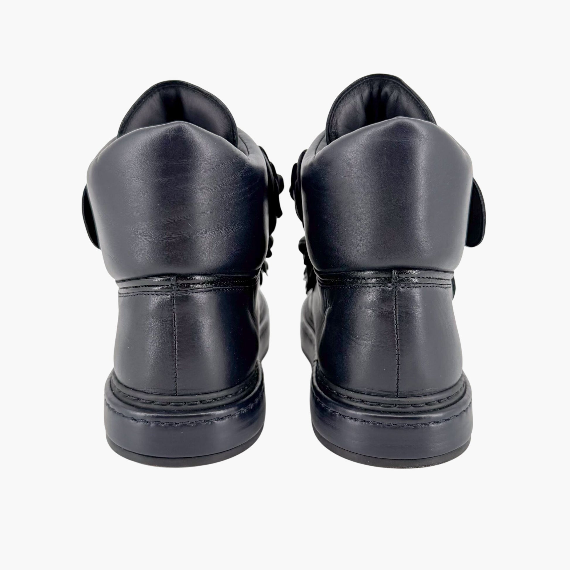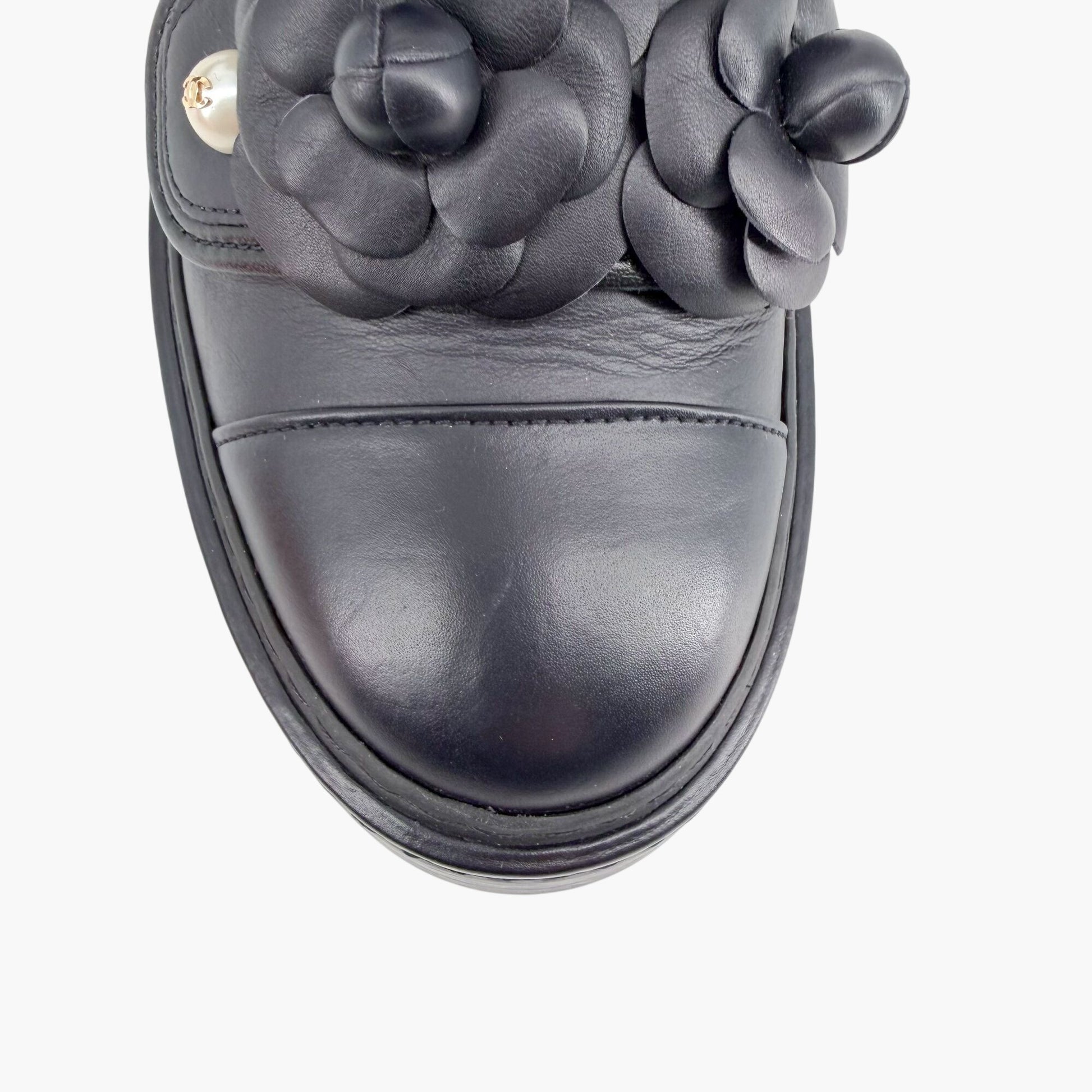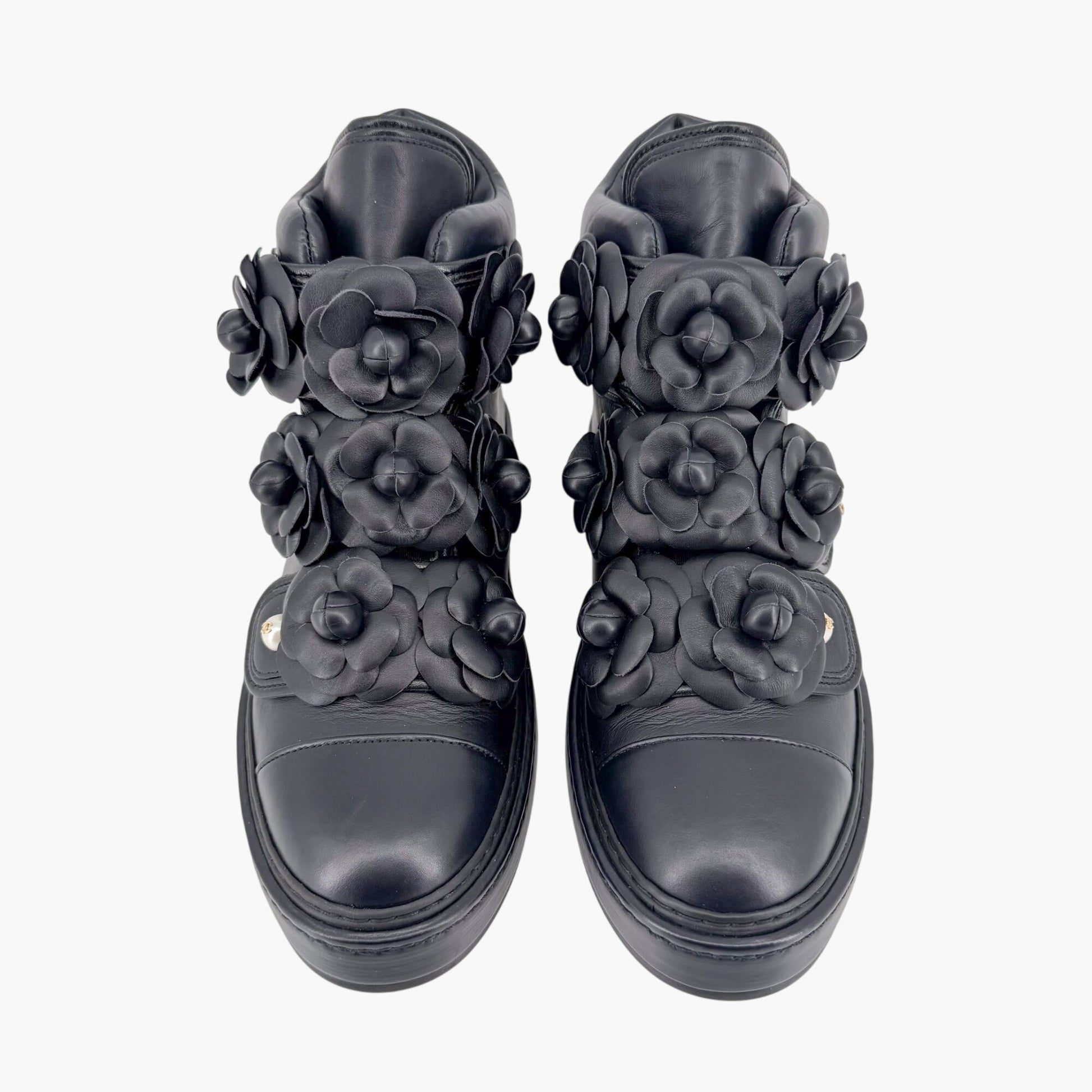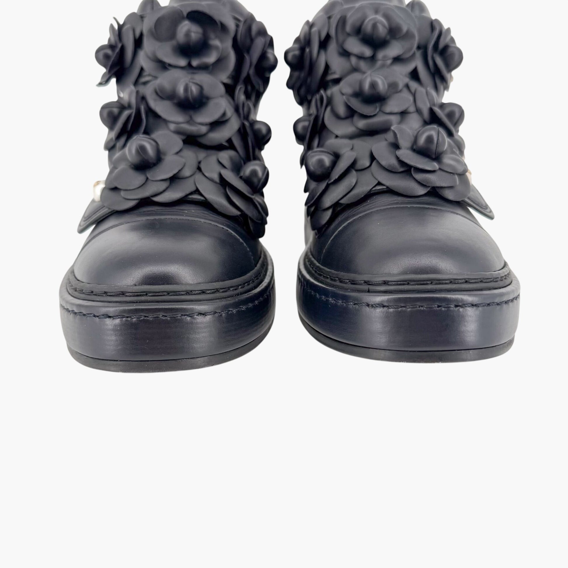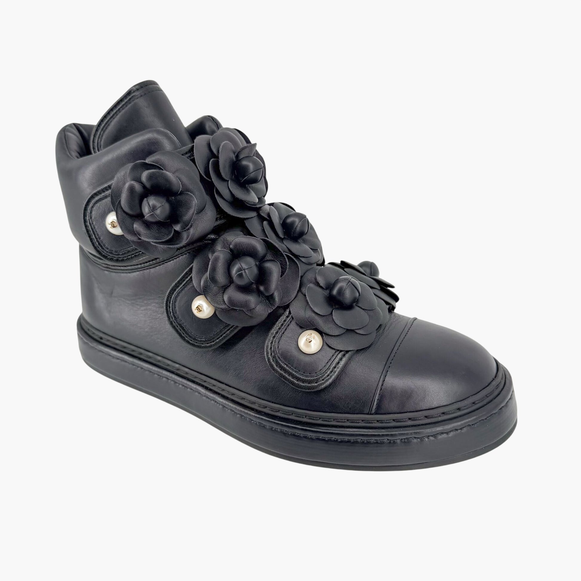 These Chanel high top sneaker boots feature smooth deep navy blue (nearly black) leather uppers accented with signature Camellia flower embellishments and pearl CC logo details. Designed with a padded ankle shaft, multi-strap construction, and flat rubber soles, they blend sporty structure with iconic Chanel detailing, ideal for elevated casual wear and statement street style.