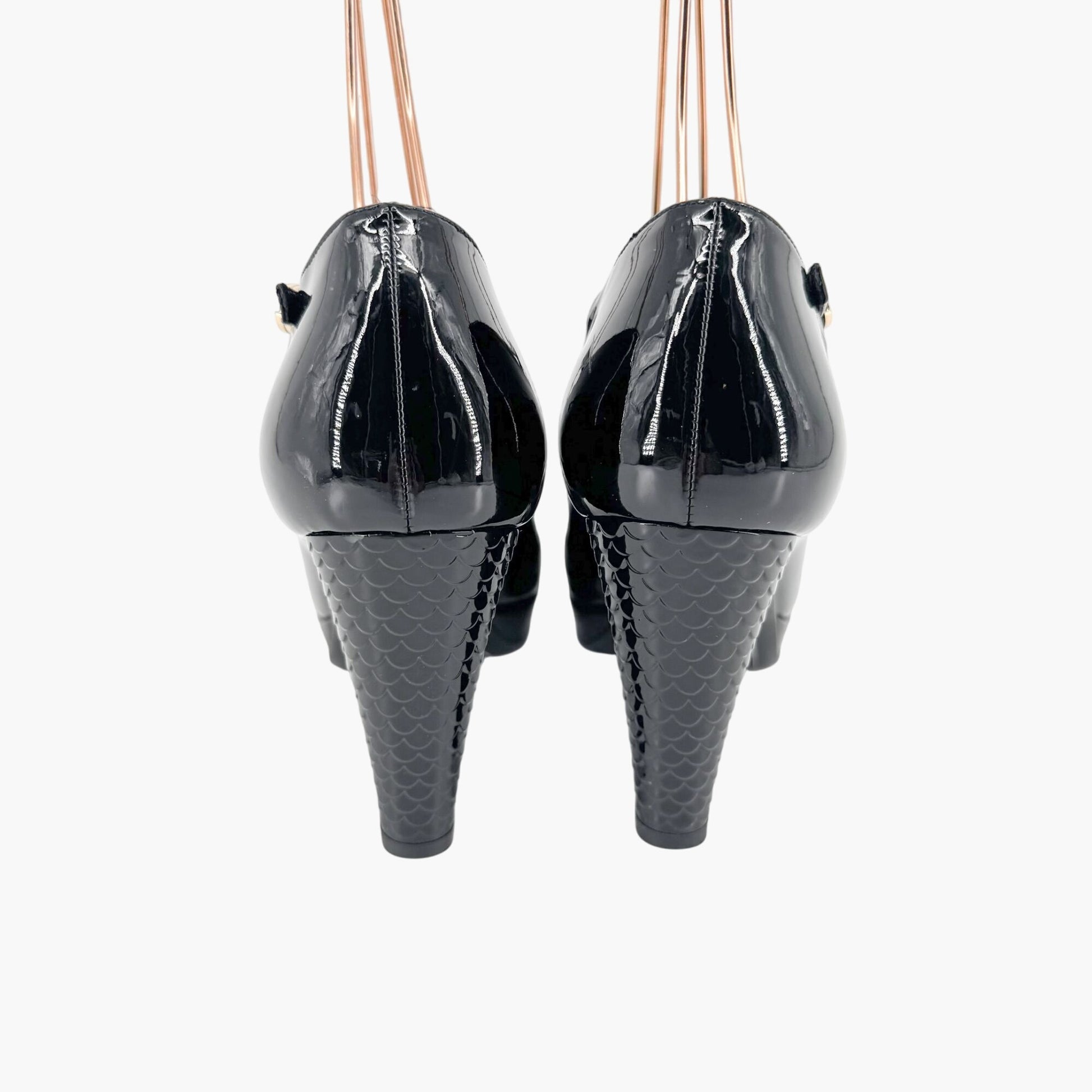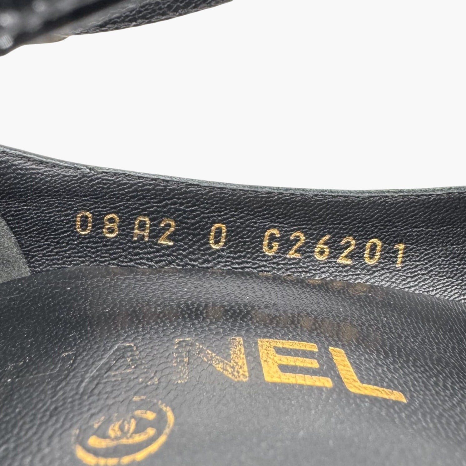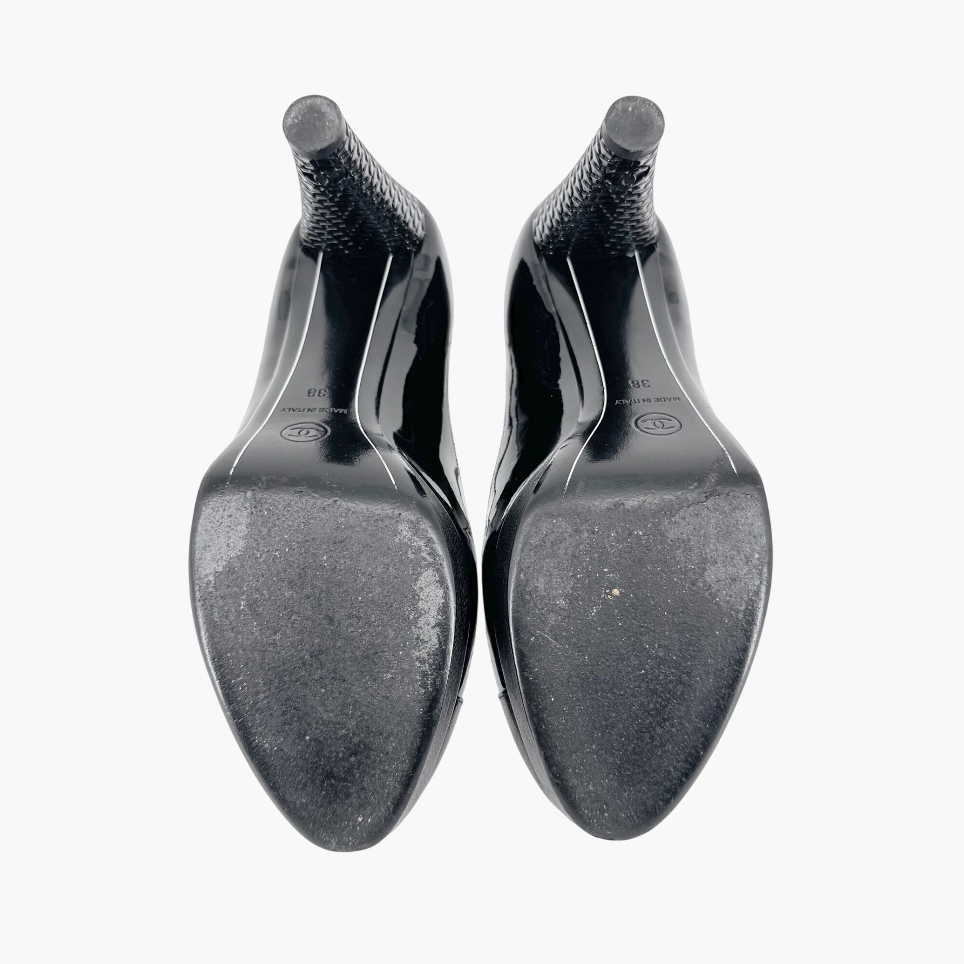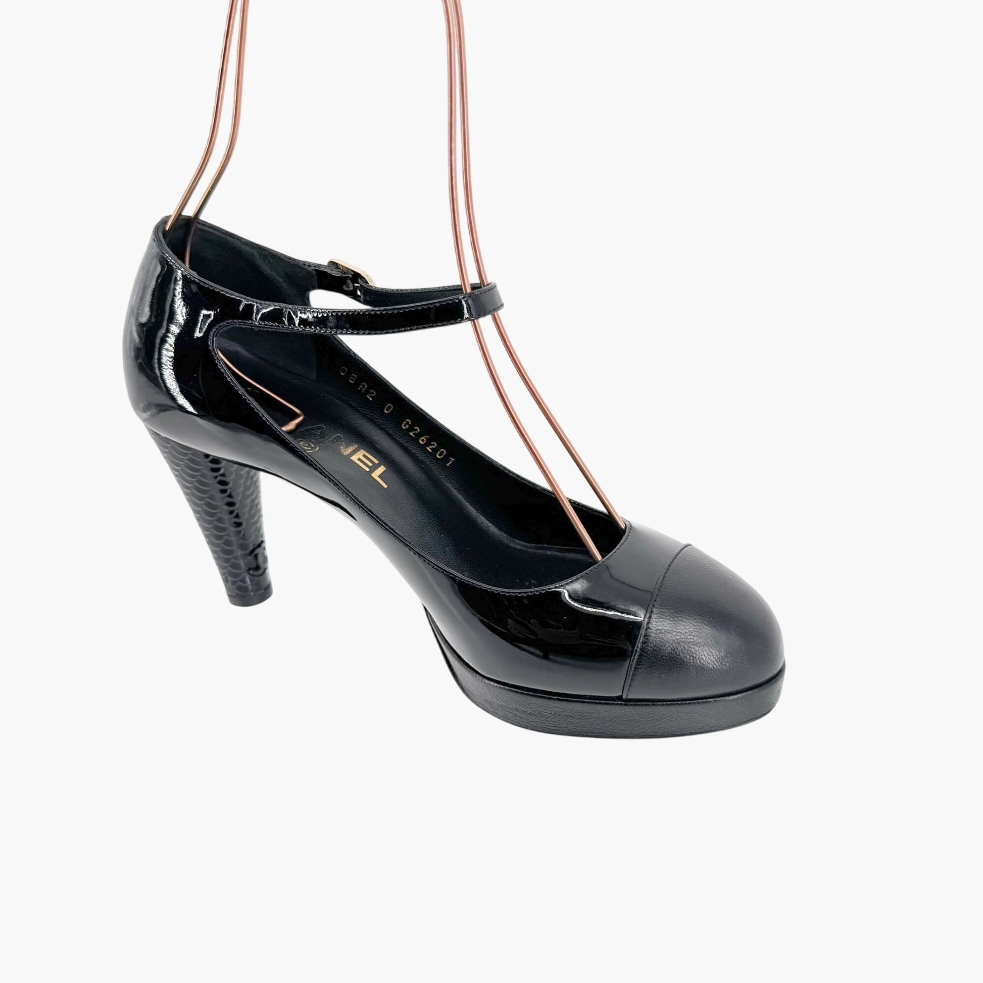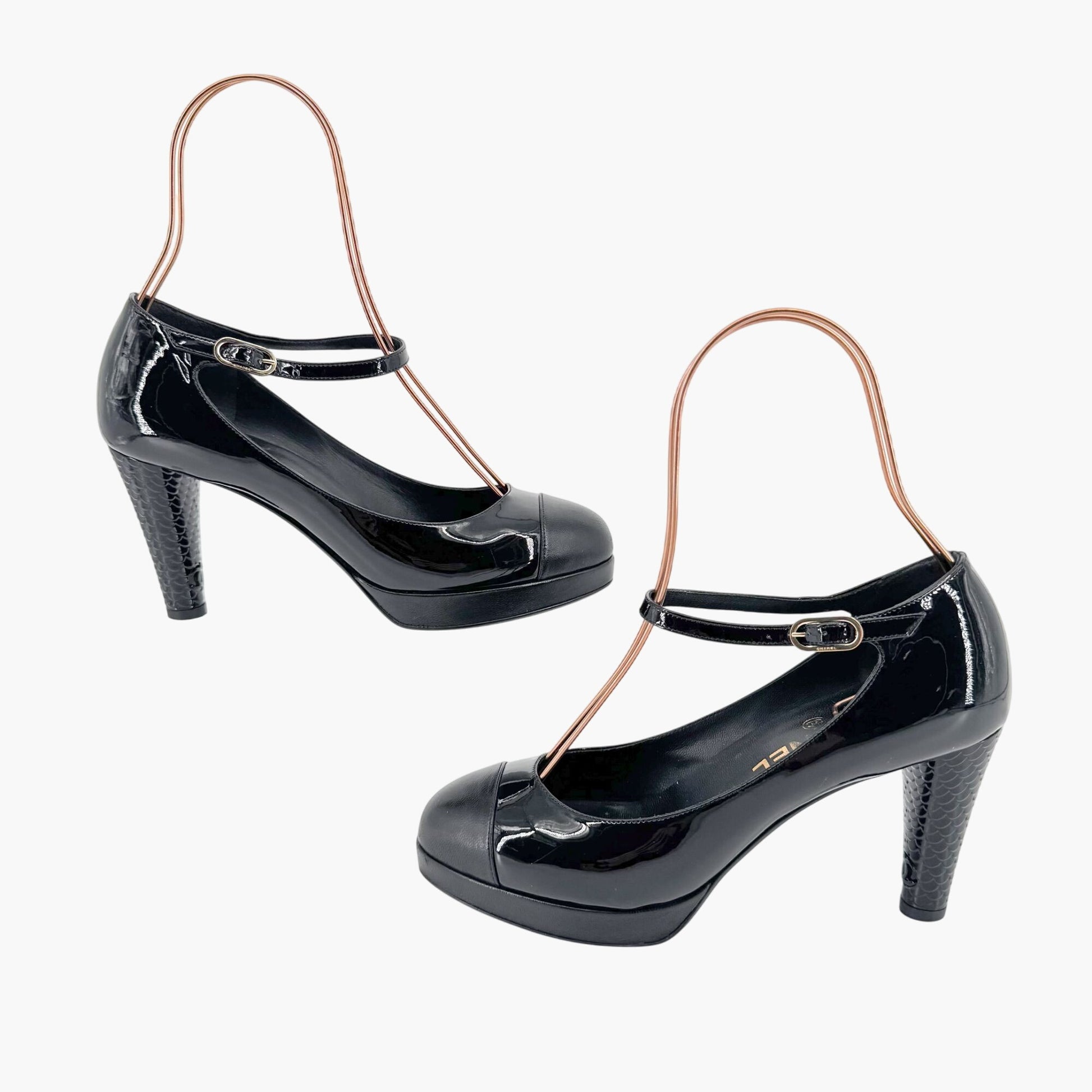 These Chanel pumps balance timeless elegance with subtle edge. The glossy round-toe silhouette is anchored by a platform sole and a textured mid-height block heel, finished with the signature CC logo for a touch of house heritage. A slim ankle strap provides a secure fit, making them perfect for evening occasions, dinner parties, or a polished day-to-night office look. Comes with the original box and one dust bag.