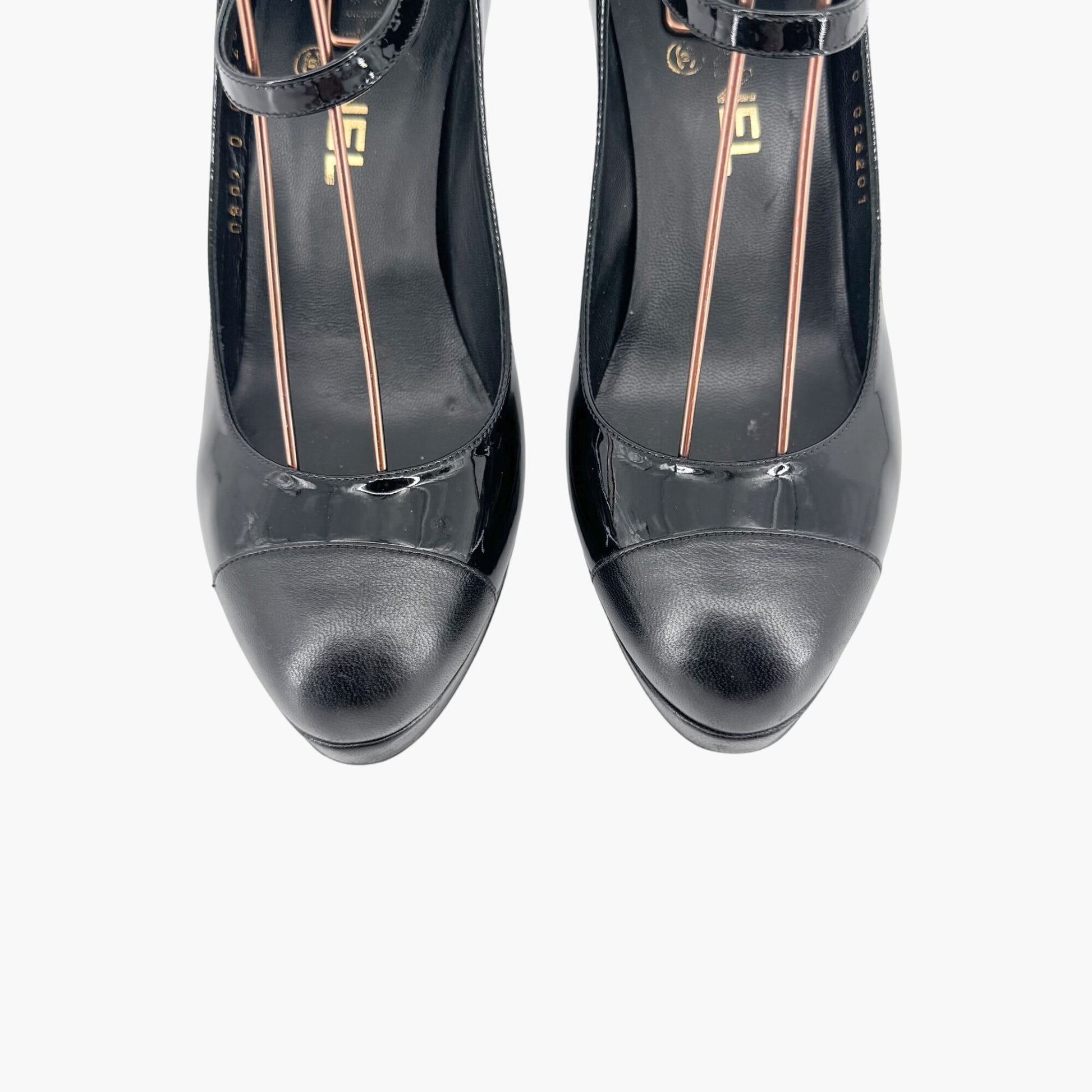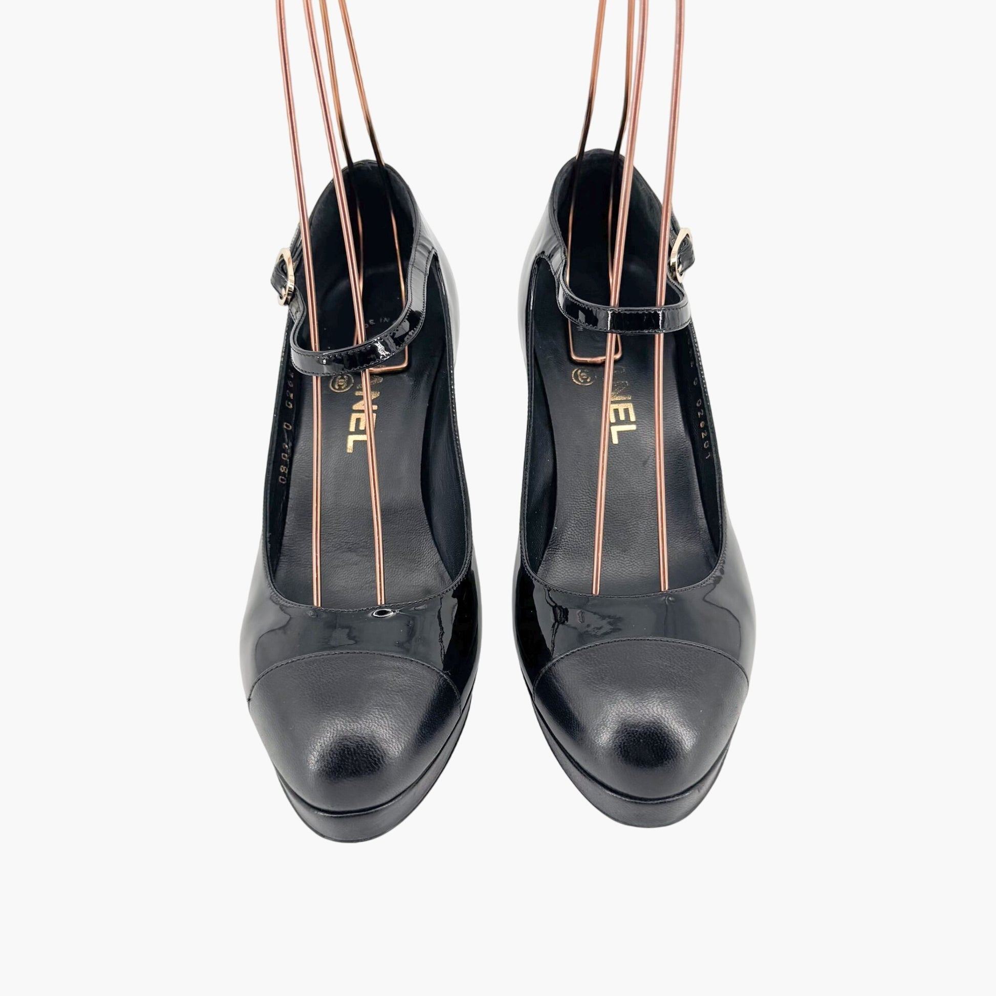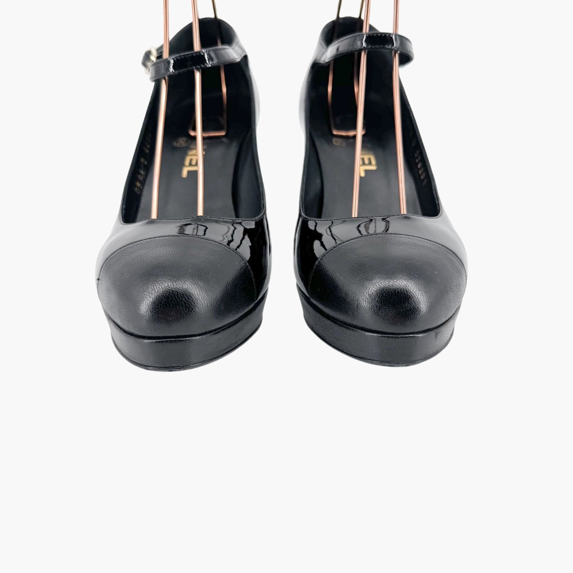 Chanel Platform Pumps Size 38 US 7-7.5 Black Patent Cap Toe Mary Jane Mid Heel