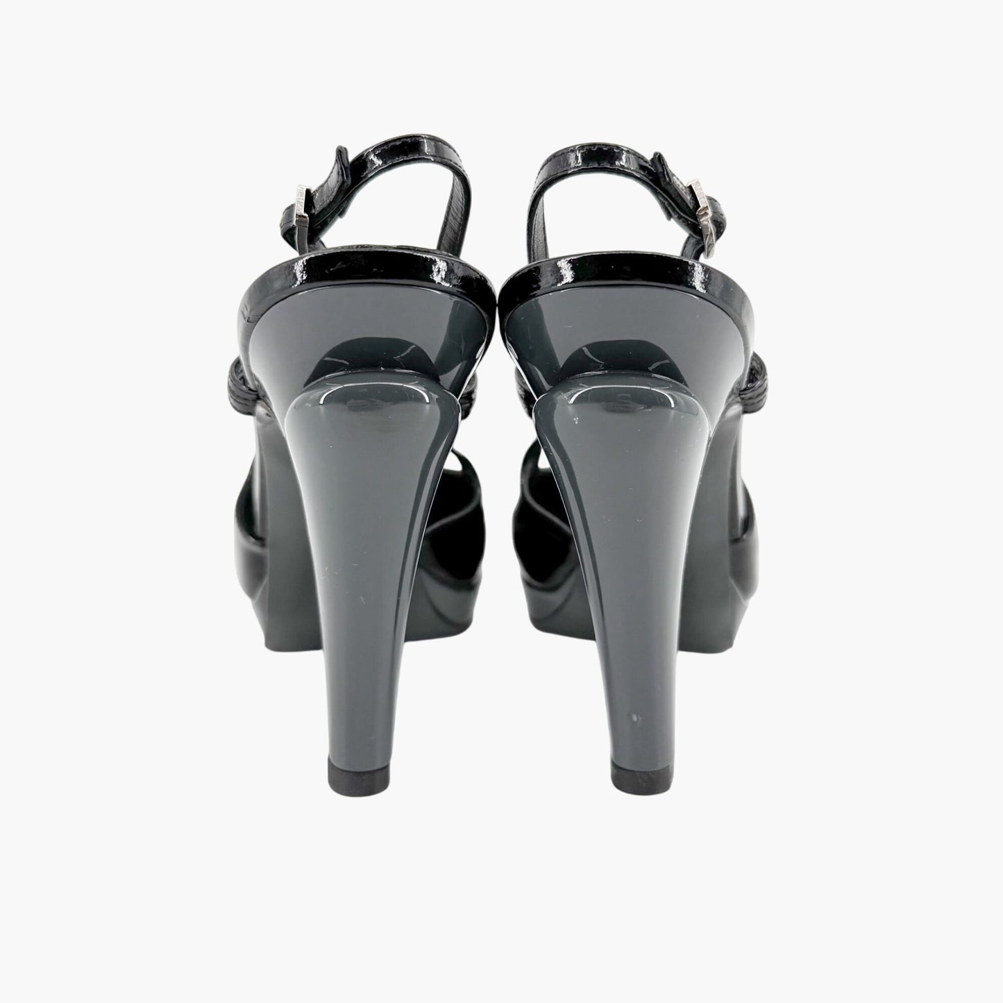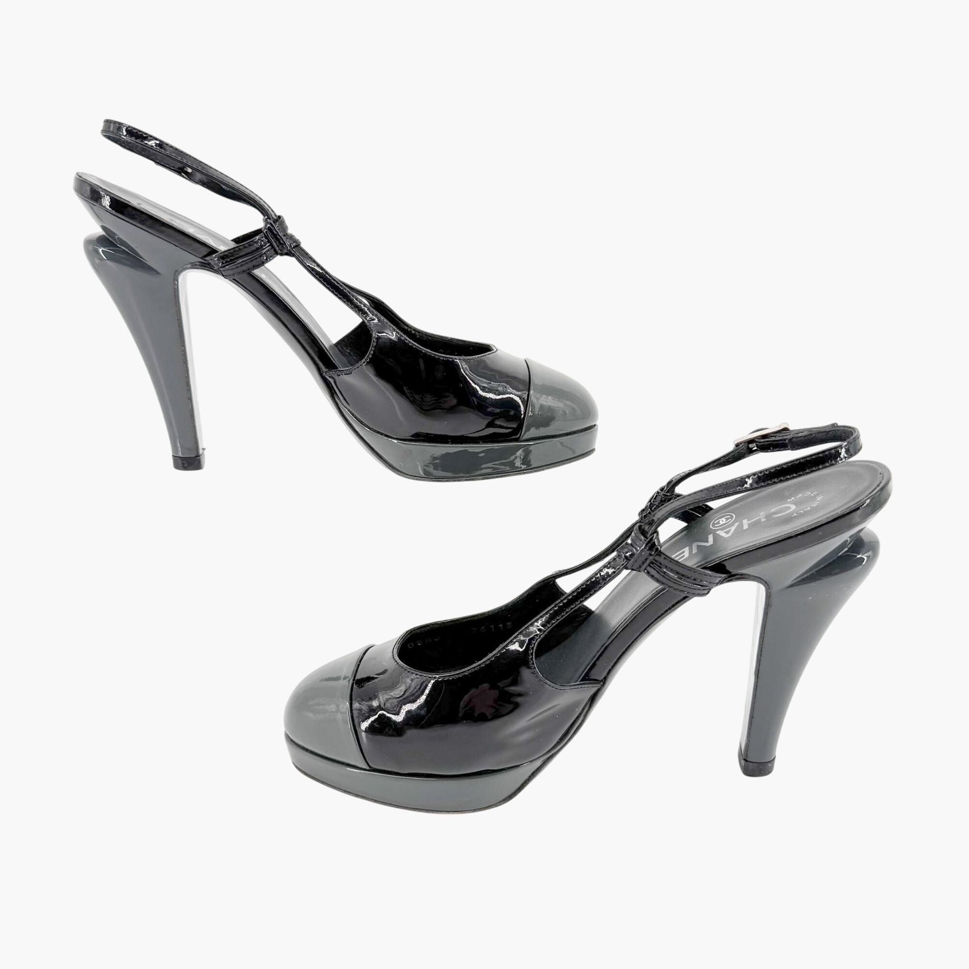 A sophisticated wardrobe staple, these Chanel slingback pumps seamlessly blend classic elegance with a modern edge. The glossy black patent leather upper is contrasted by a gray patent almond cap toe, delivering an effortlessly chic two-tone design. The slingback strap with buckle closure ensures a secure and adjustable fit, while the low platform and high cutout block heel provide both height and comfort. Perfect for office wear, evening events, weddings, or effortlessly elevating casual outfits with a polished finish.