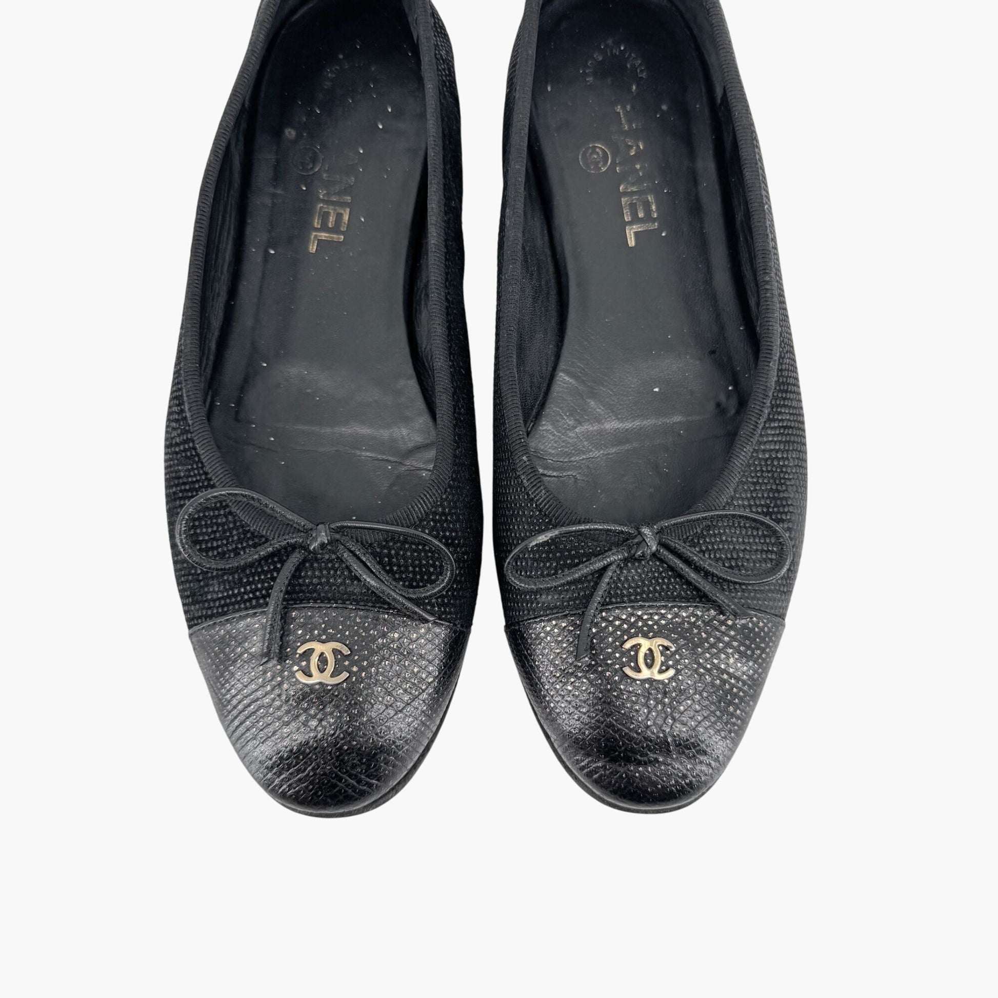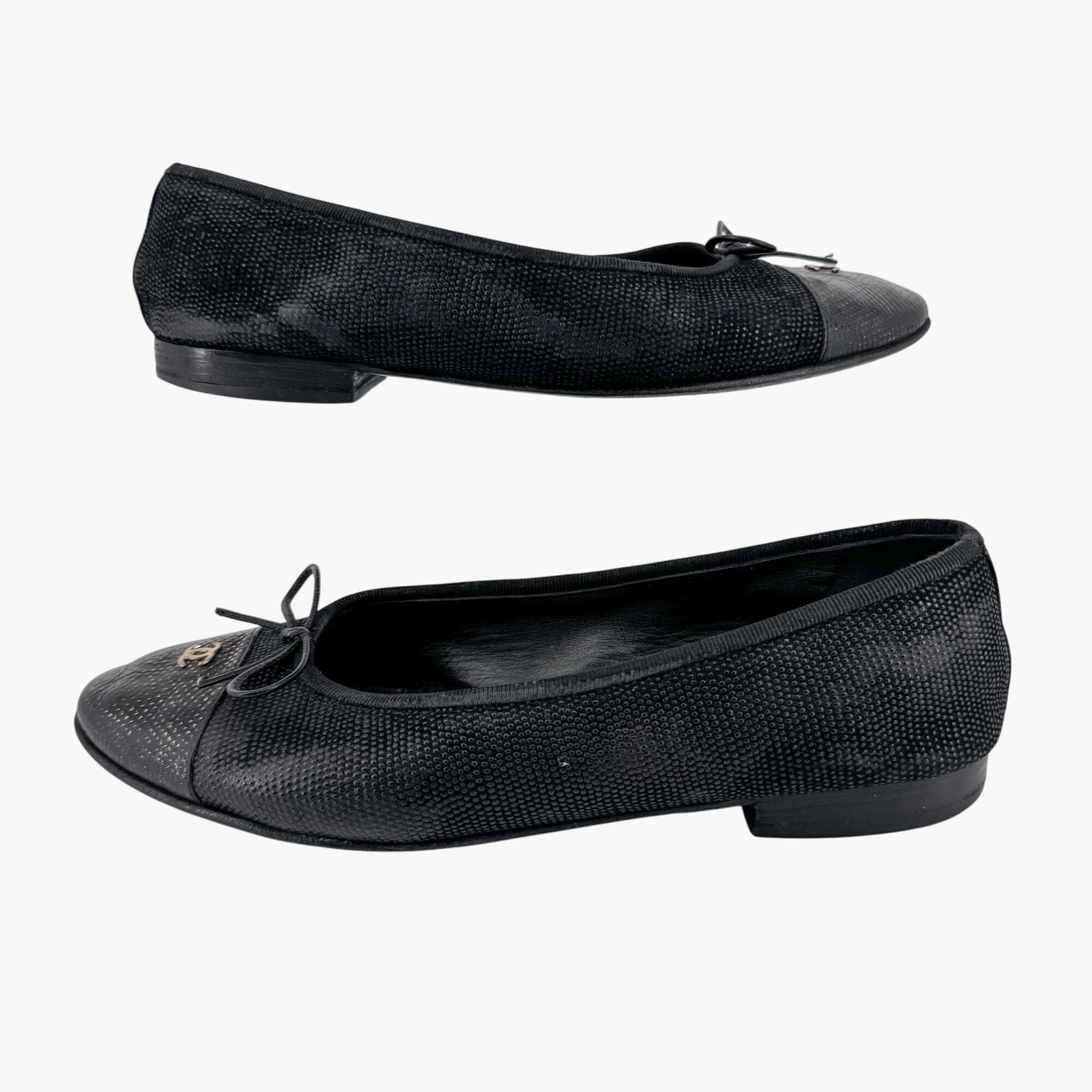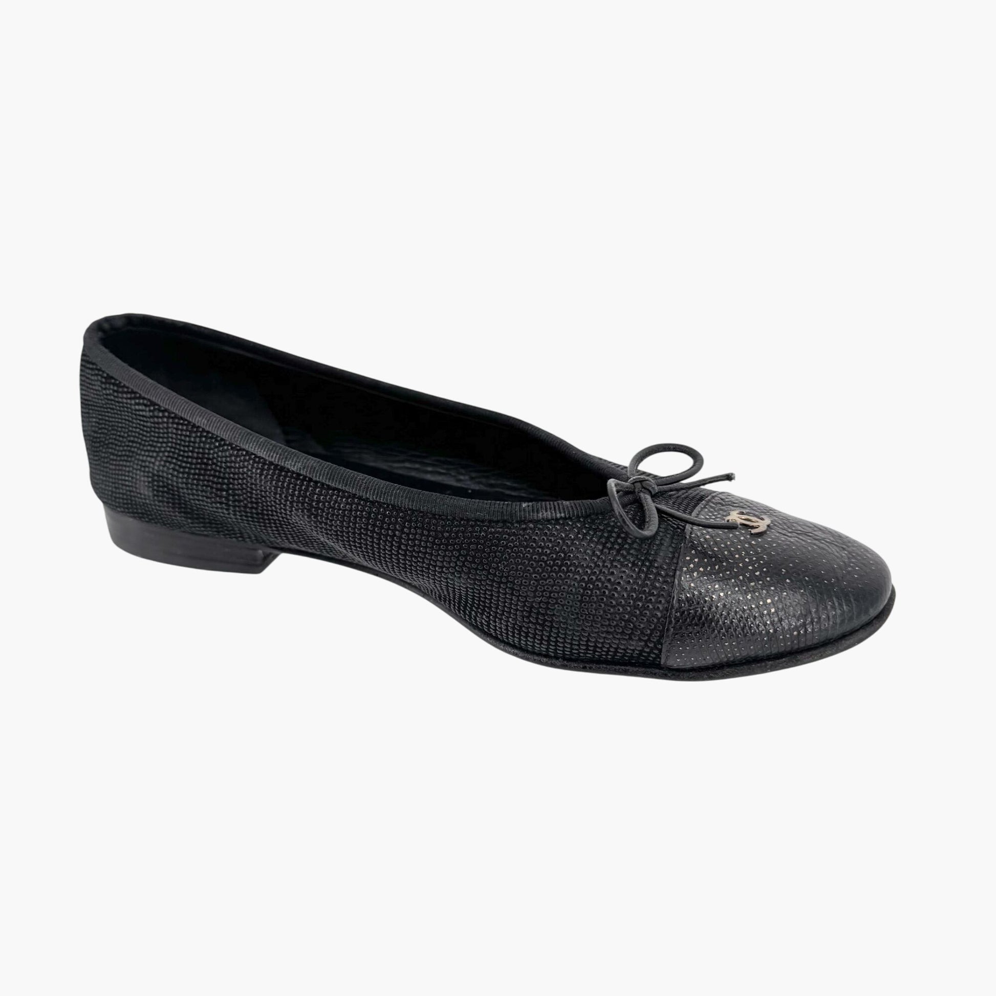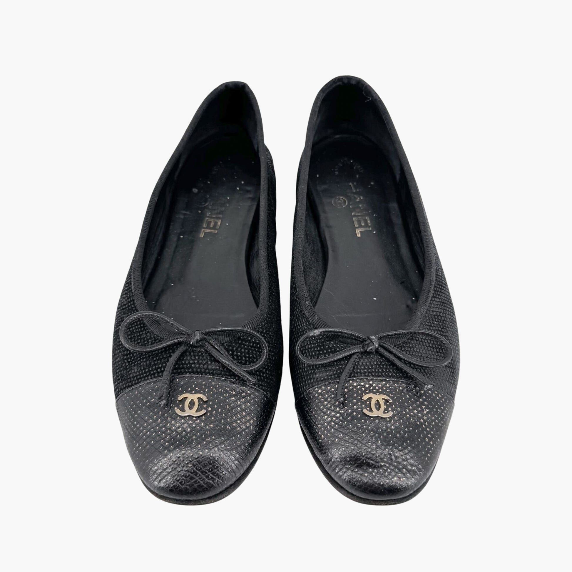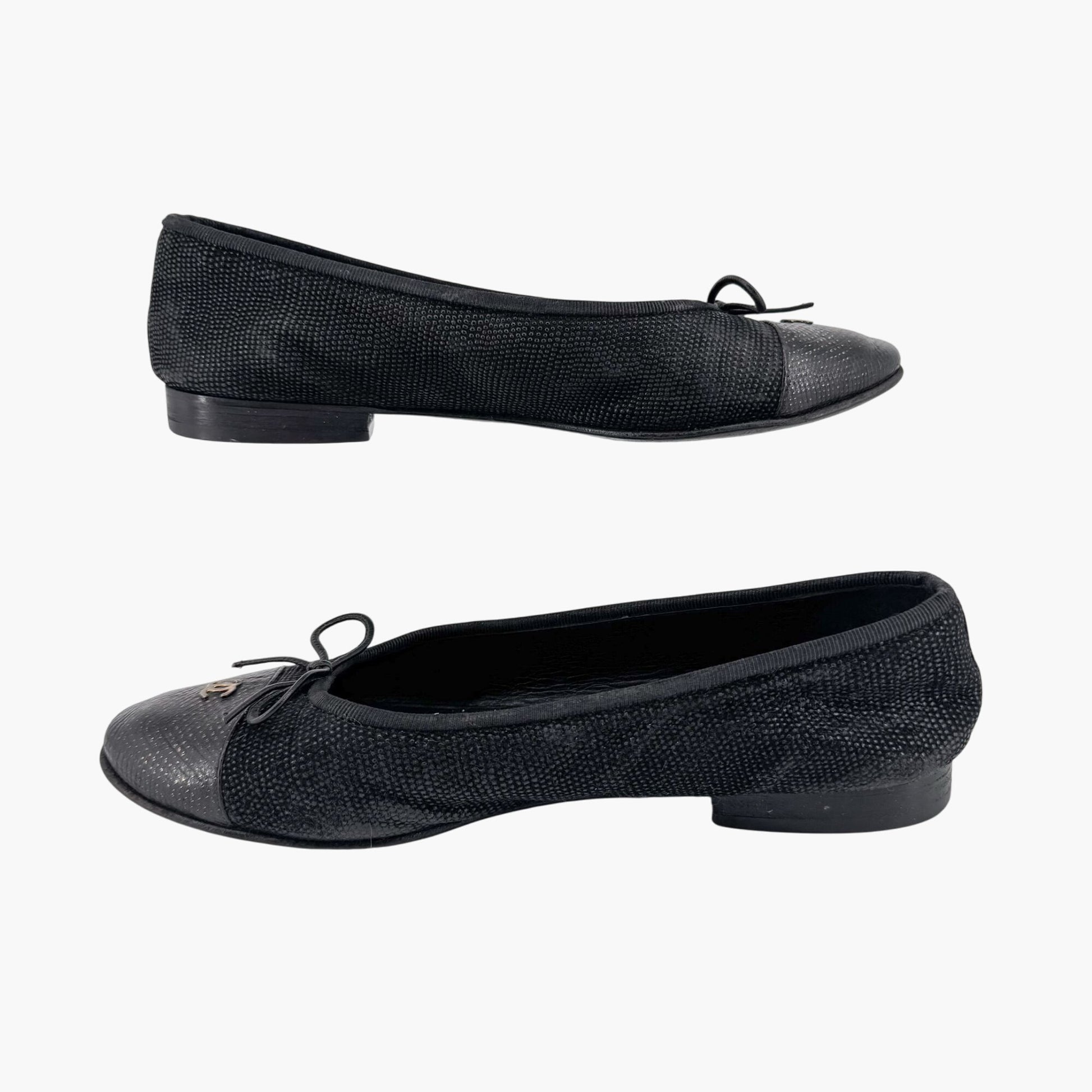 These Chanel ballet flats feature black textured uppers with metallic gold-specked leather cap toes, each finished with a gold CC logo and bow detail. Designed with leather lining and footbeds, they bring timeless sophistication and everyday versatility.