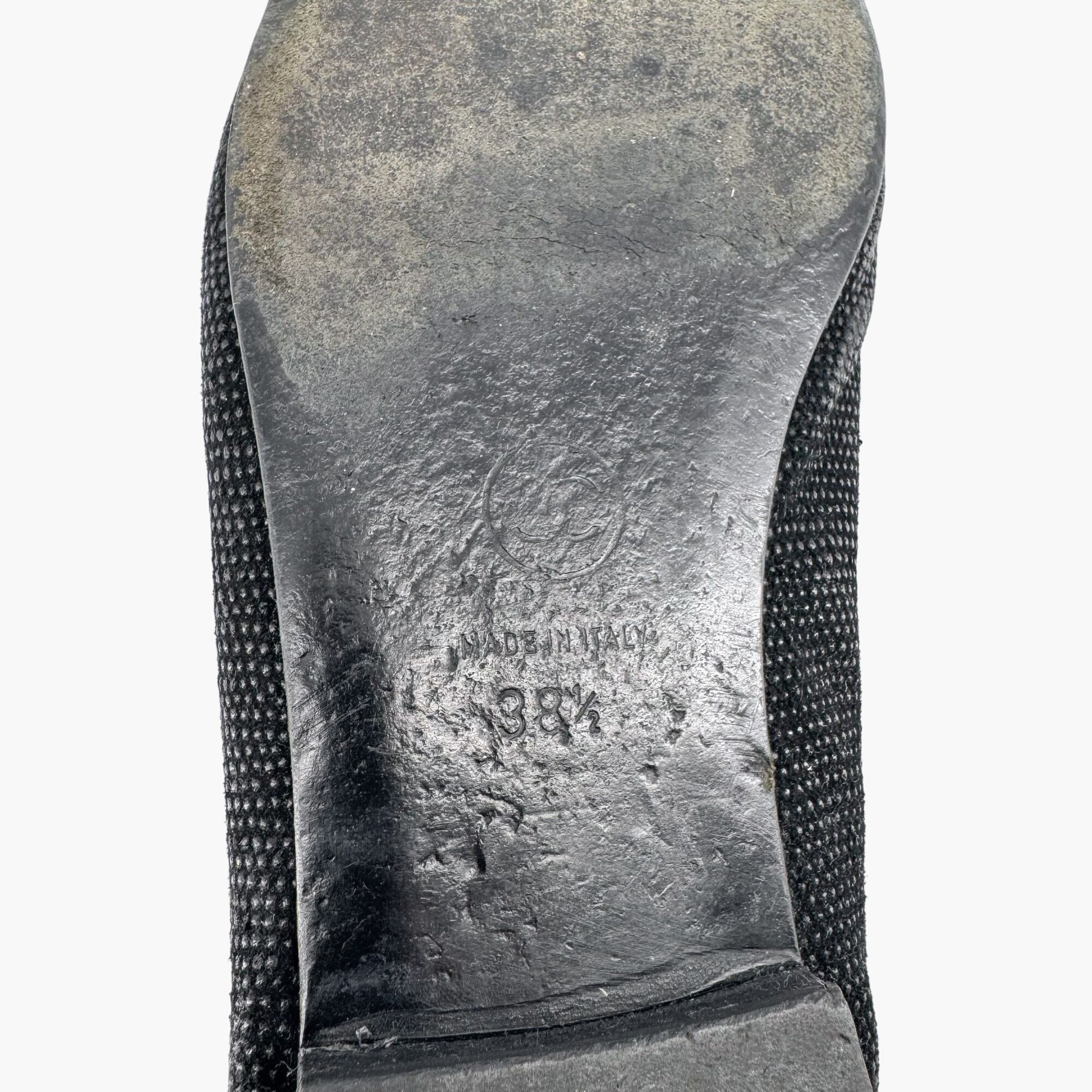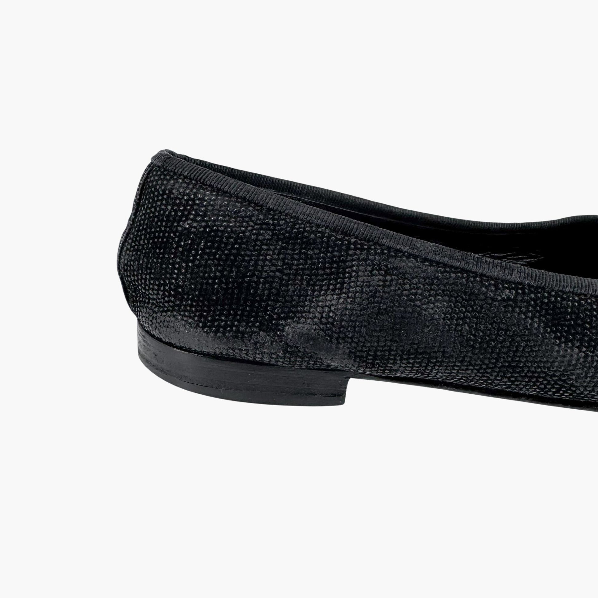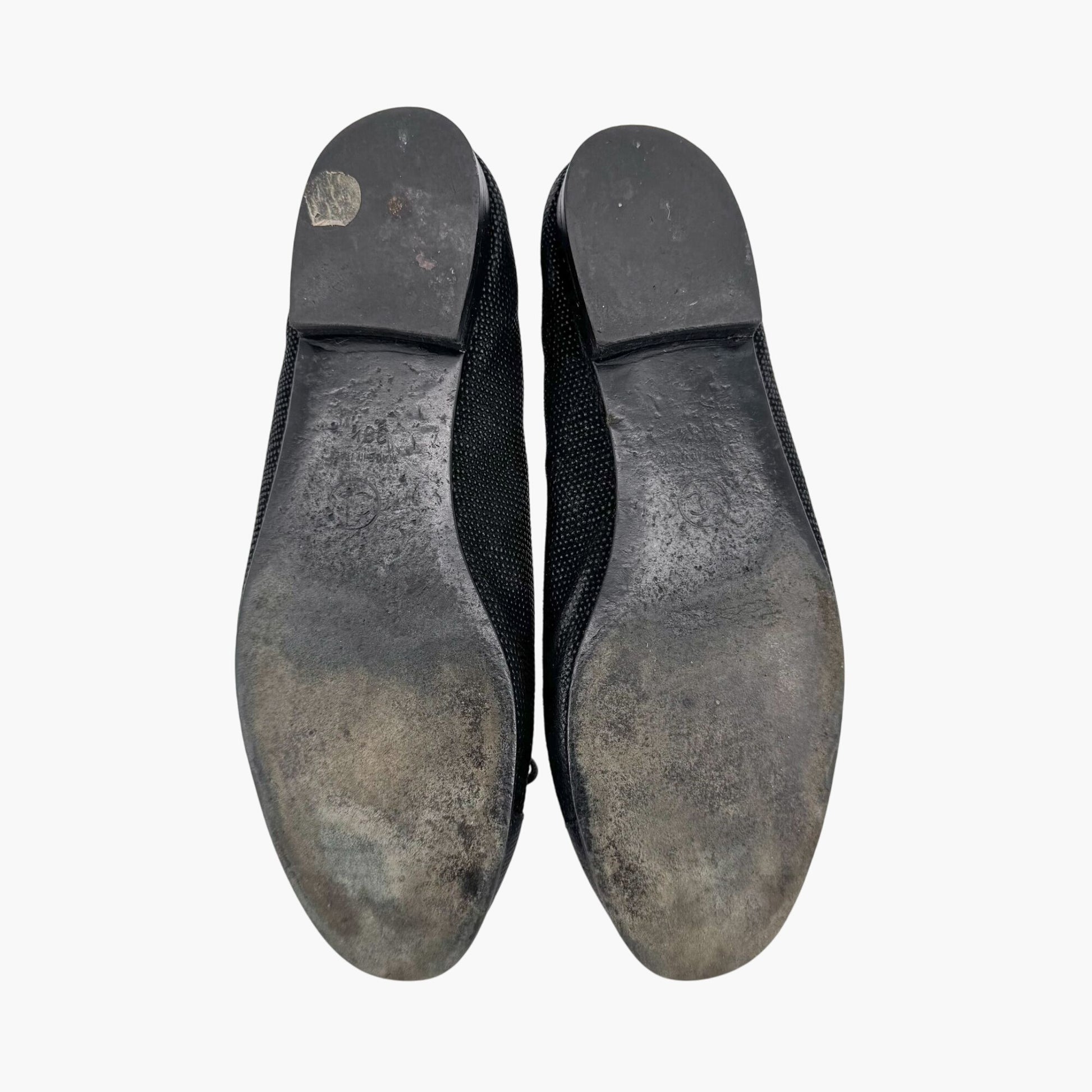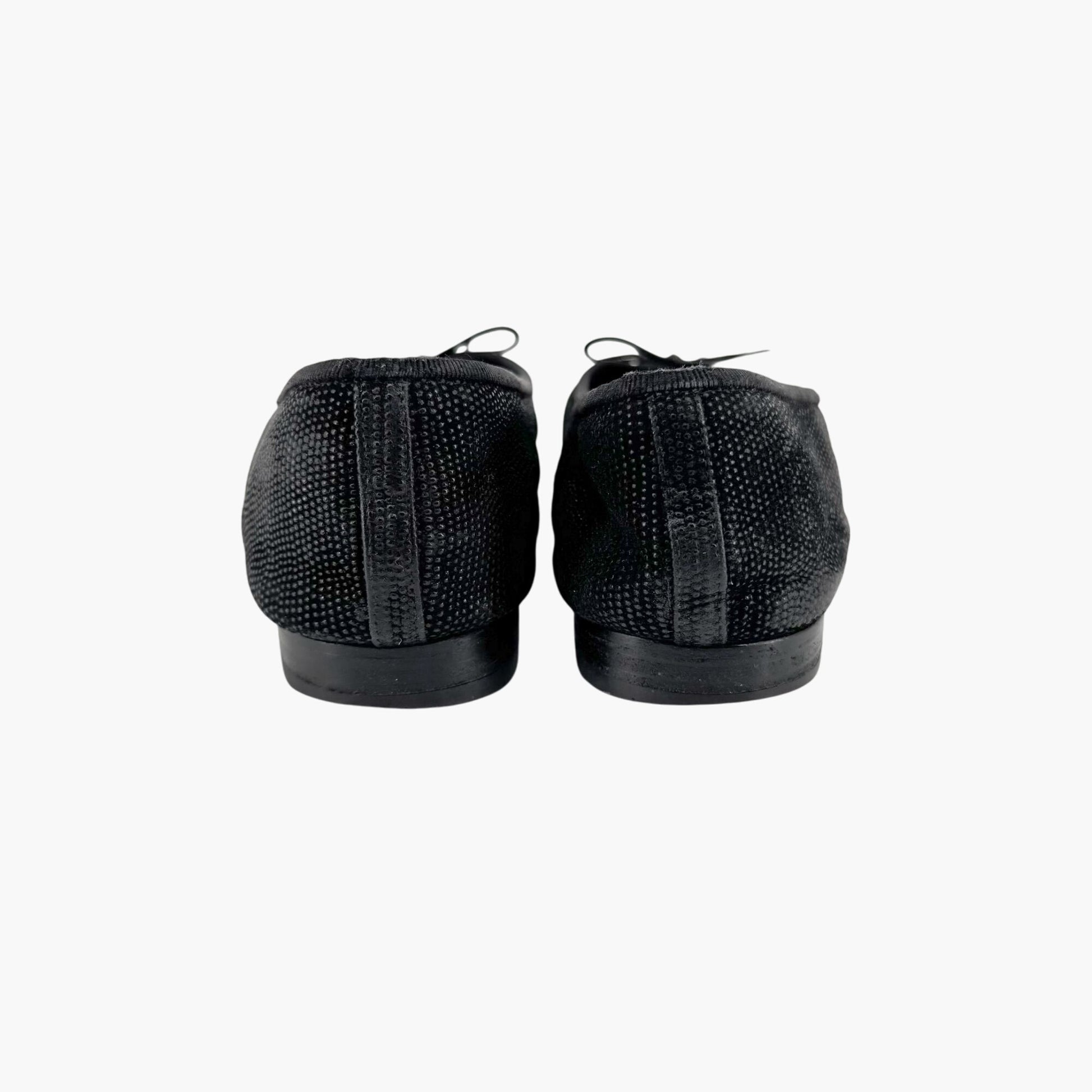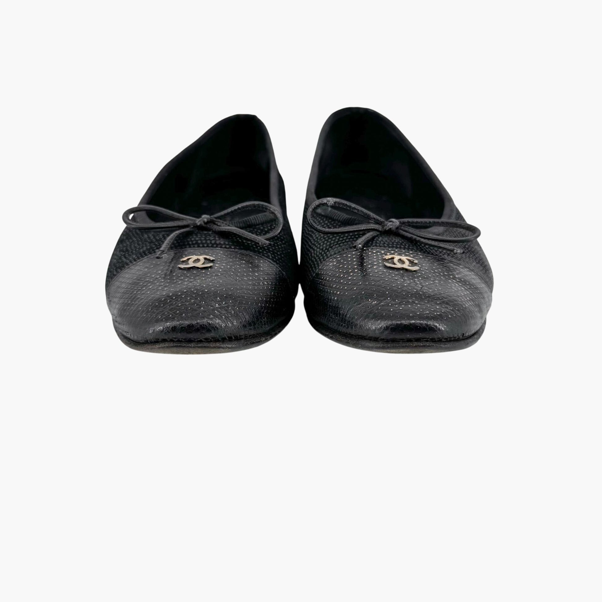 These Chanel ballet flats feature black textured uppers with metallic gold-specked leather cap toes, each finished with a gold CC logo and bow detail. Designed with leather lining and footbeds, they bring timeless sophistication and everyday versatility.