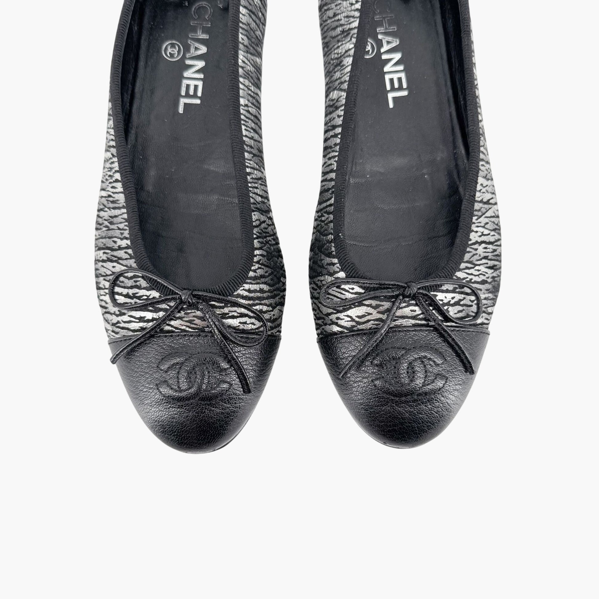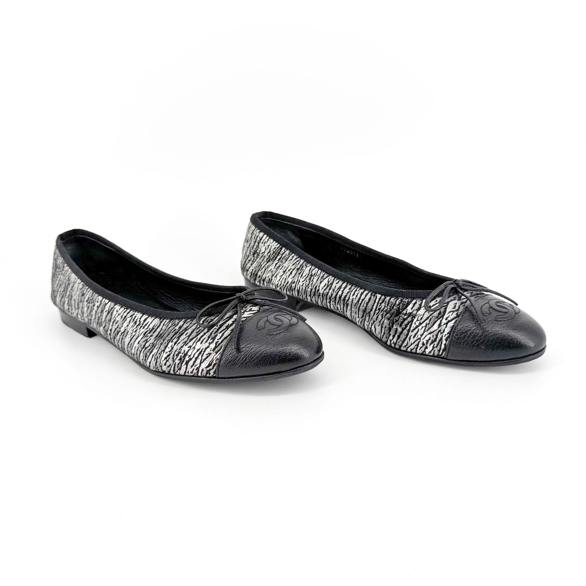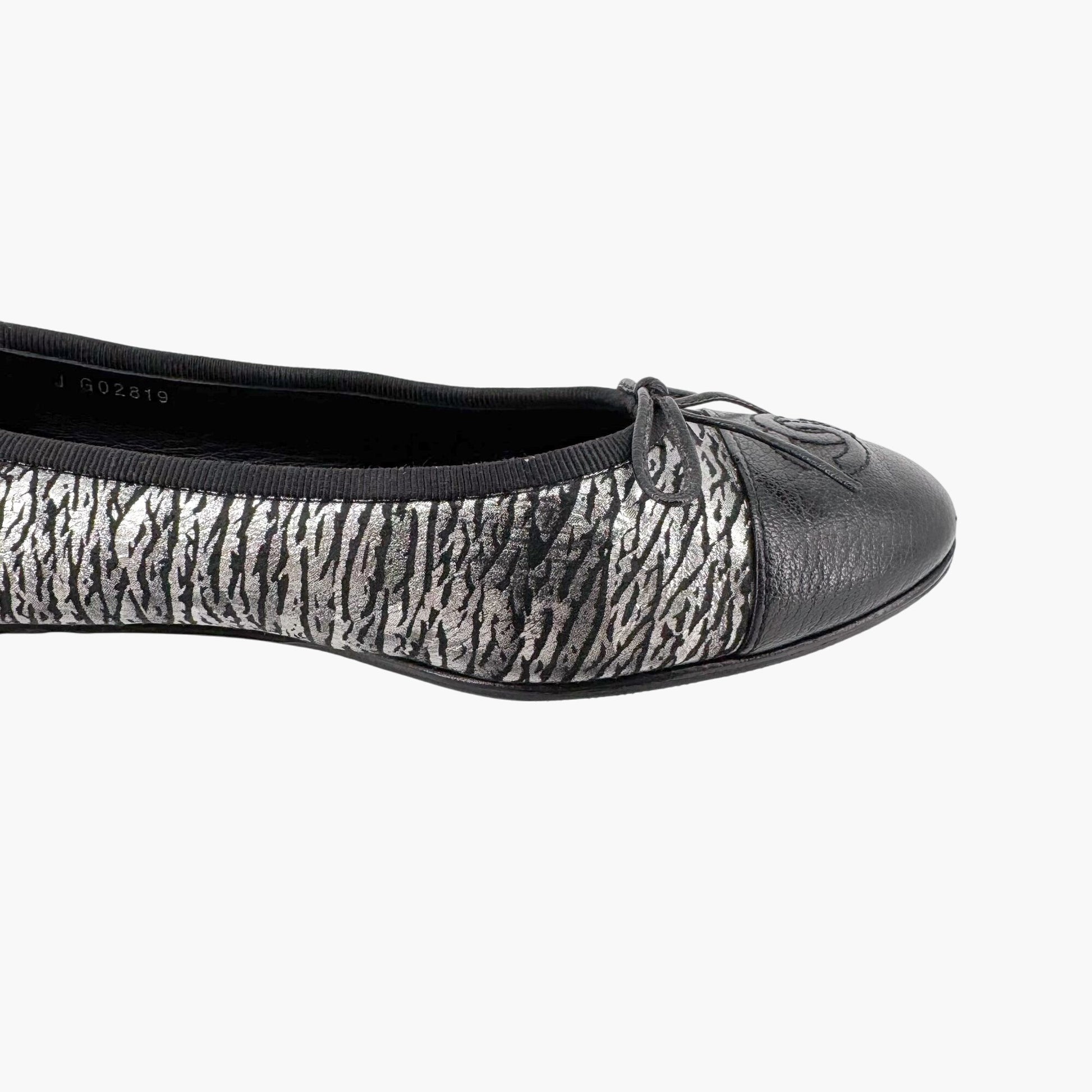 Chanel CC Cap Toe Ballet Flats in Metallic Silver & Black Size 38