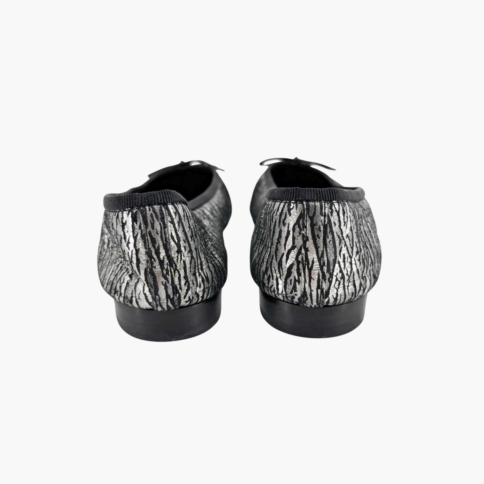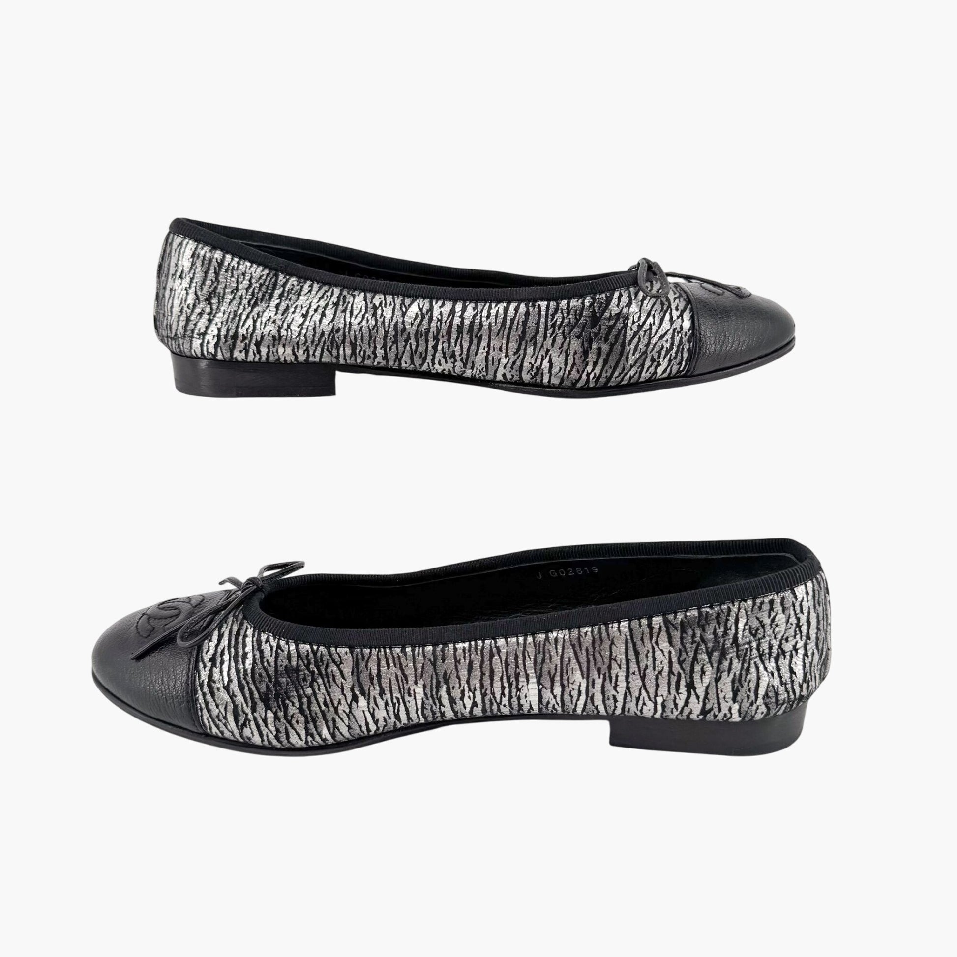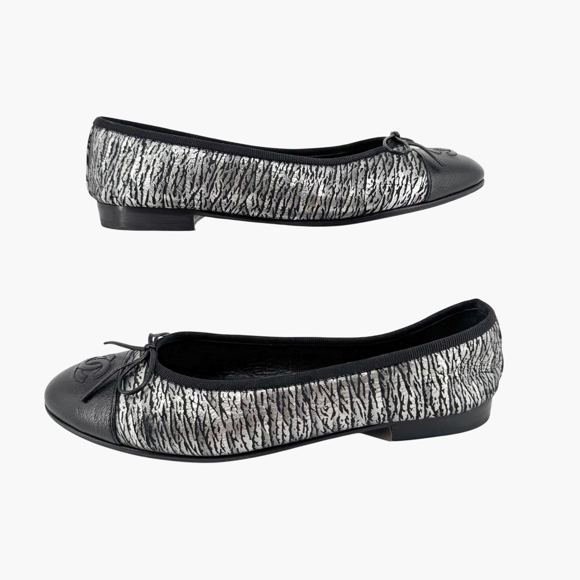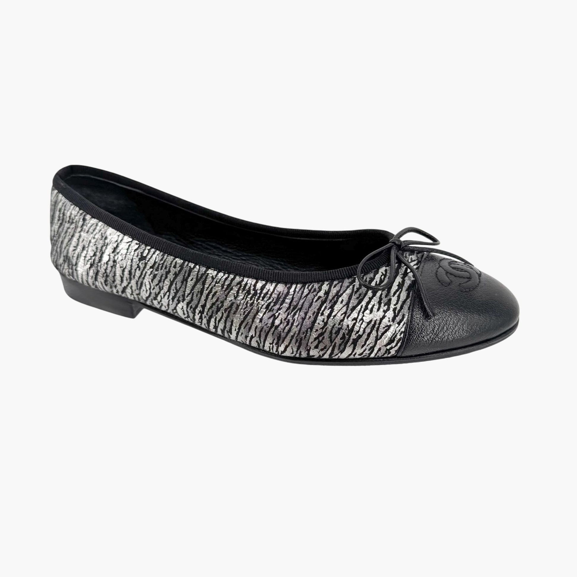These Chanel ballet flats offer a modern twist on a classic style. The slip-on ballerina silhouette features an abstract metallic silver upper, contrasted by a black leather cap toe detailed with the iconic CC logo and finished with a delicate bow accent. Designed with a round toe and flat heel, these flats provide effortless elegance and versatility. The leather footbed and lining ensure comfort, while the leather outsole offers durability. Perfect for adding a touch of shine to everyday outfits, office looks, or evening ensembles. Comes with a dust bag.