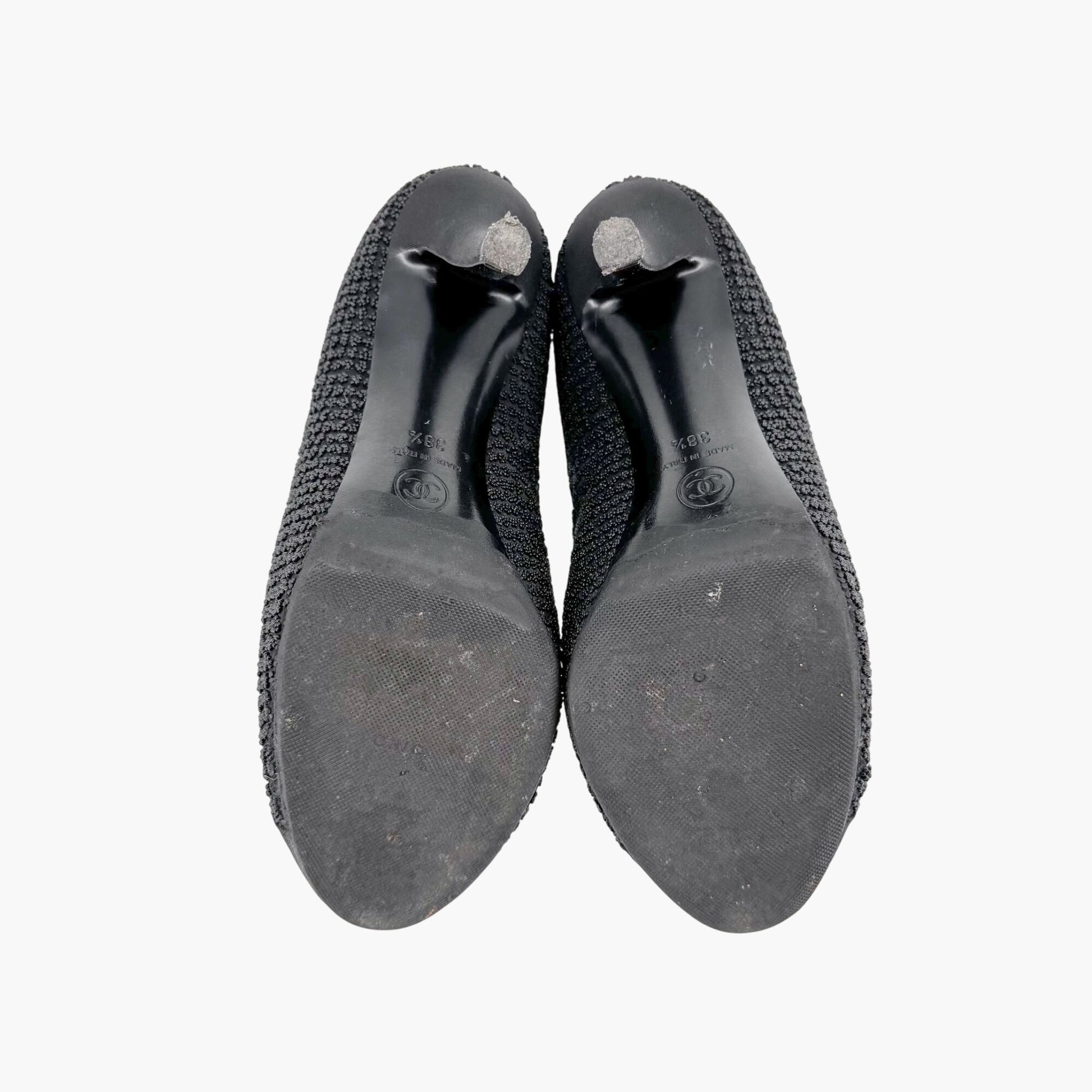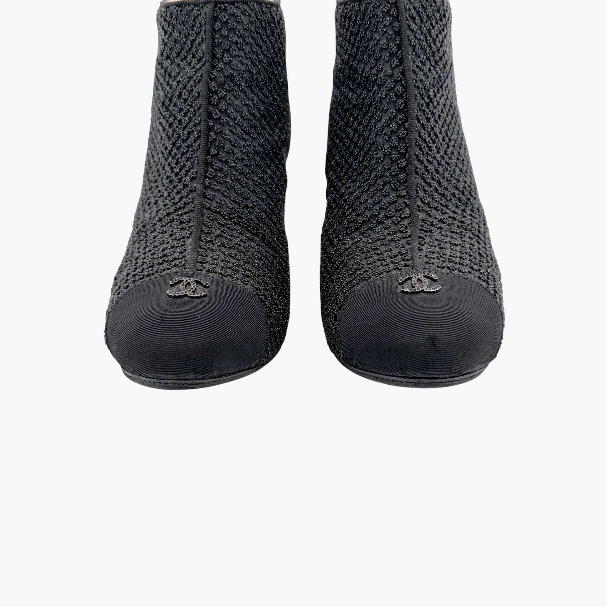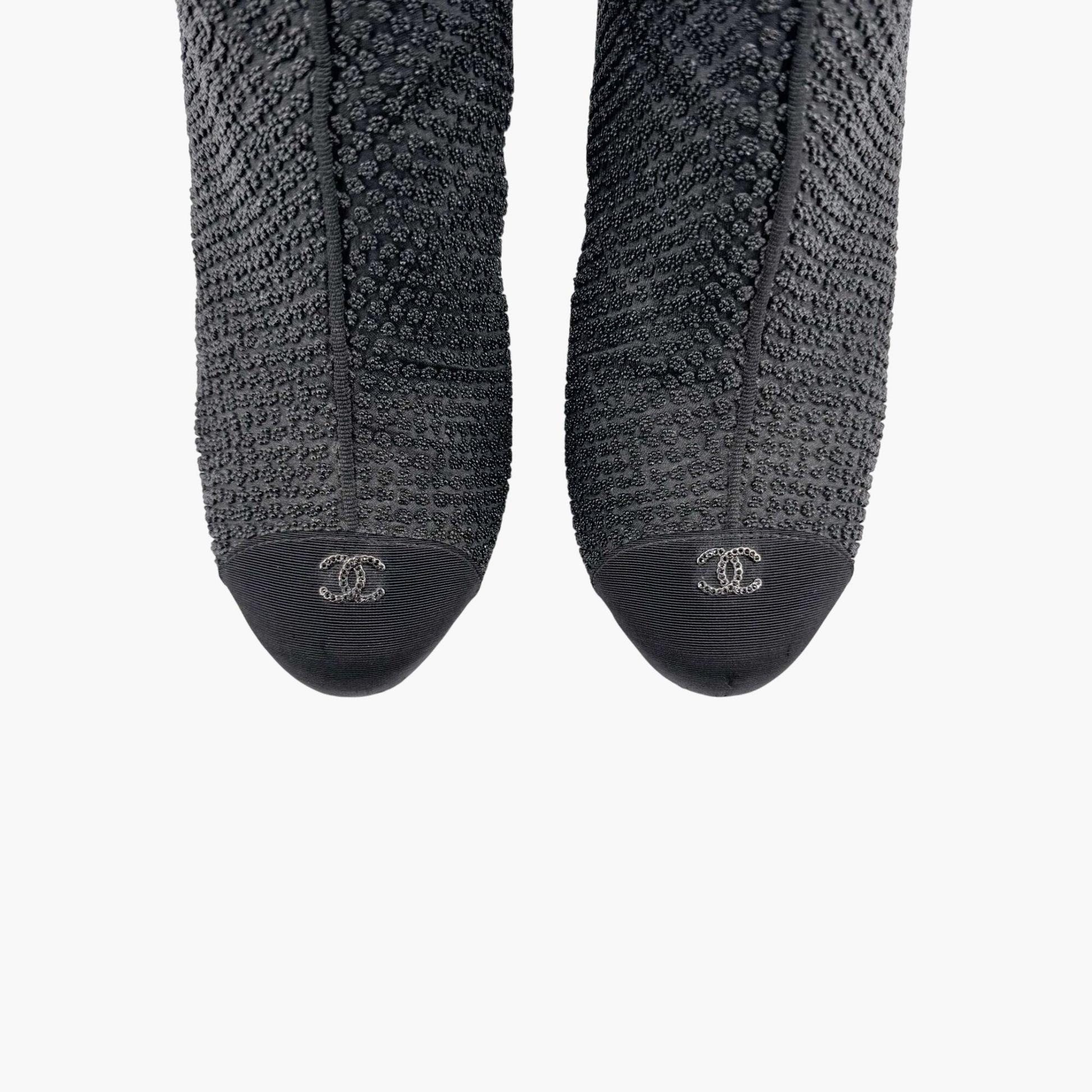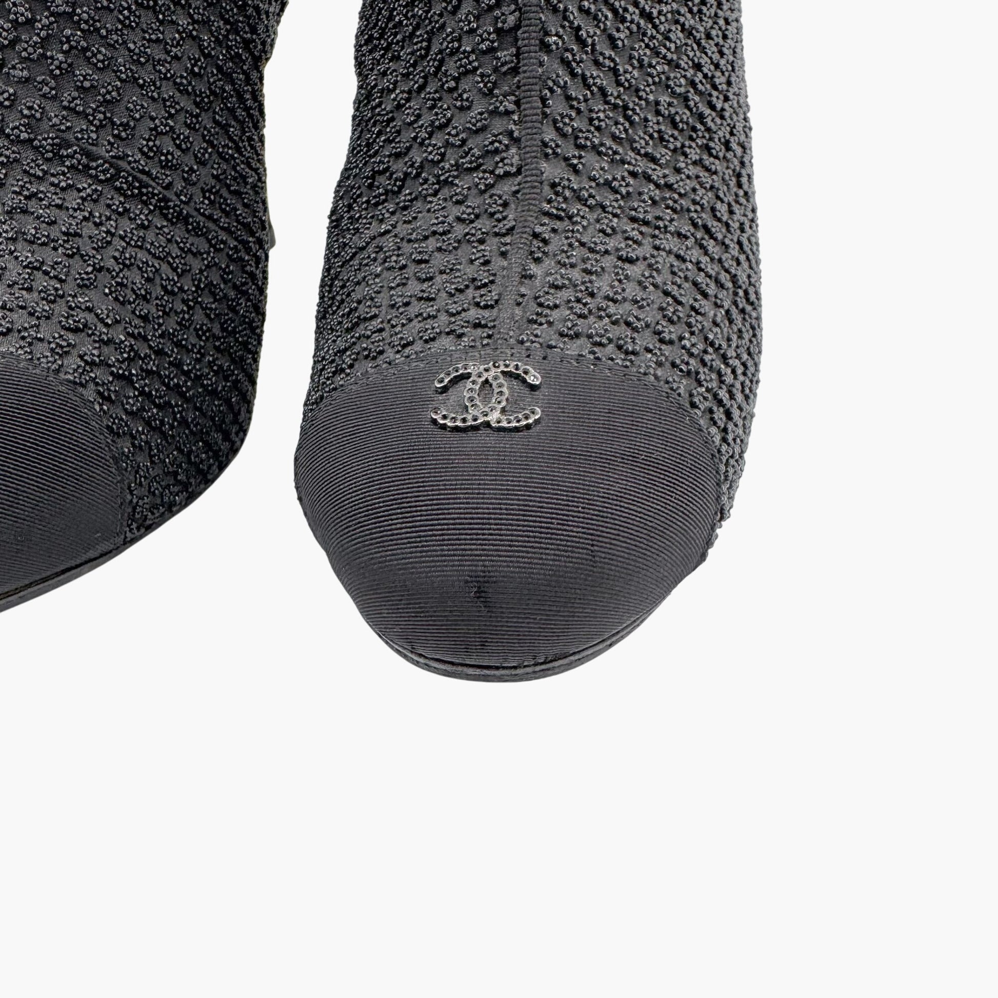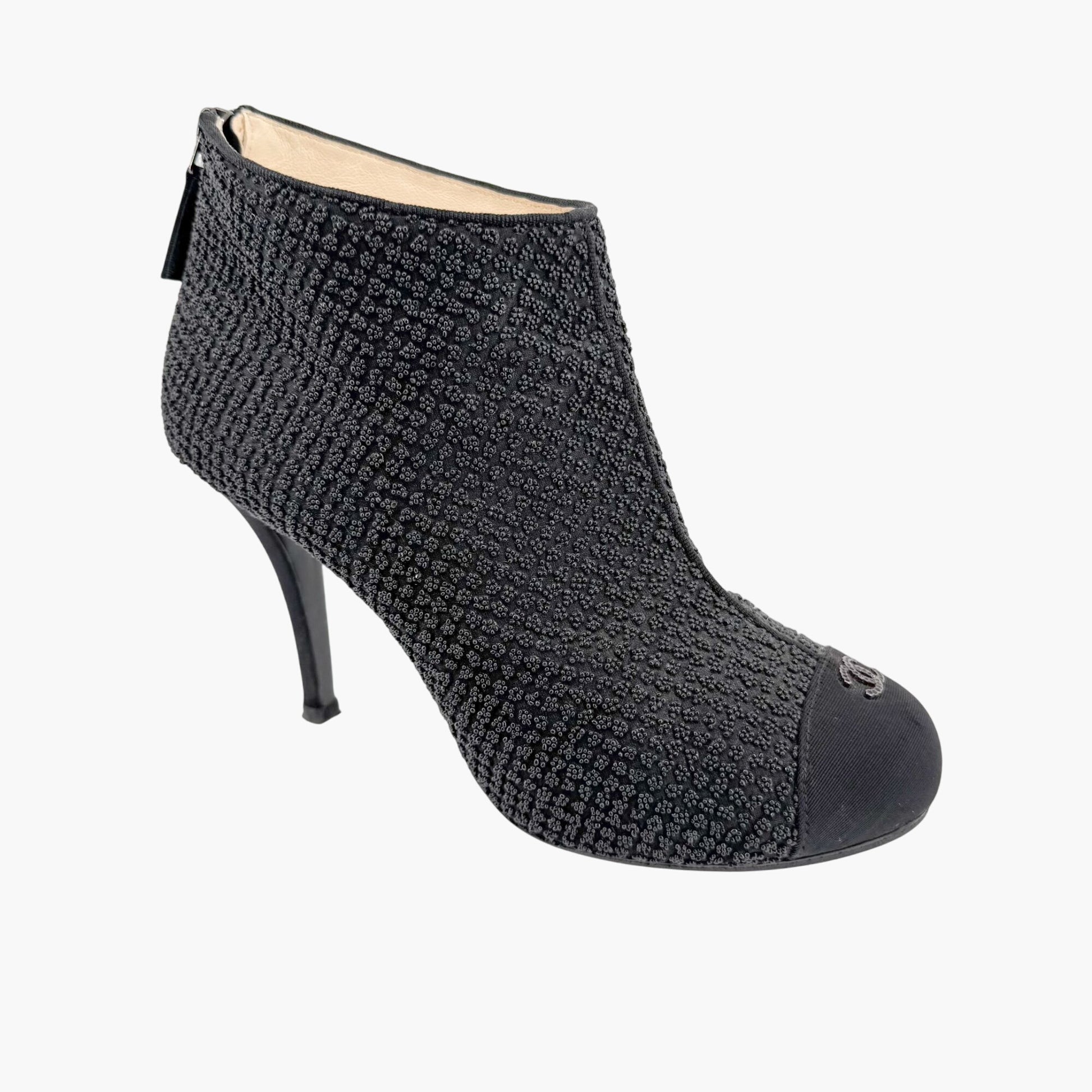 Chanel CC Cap Toe Ankle Booties Size 38.5 US 7.5-8 Black Beaded High Heel Boot