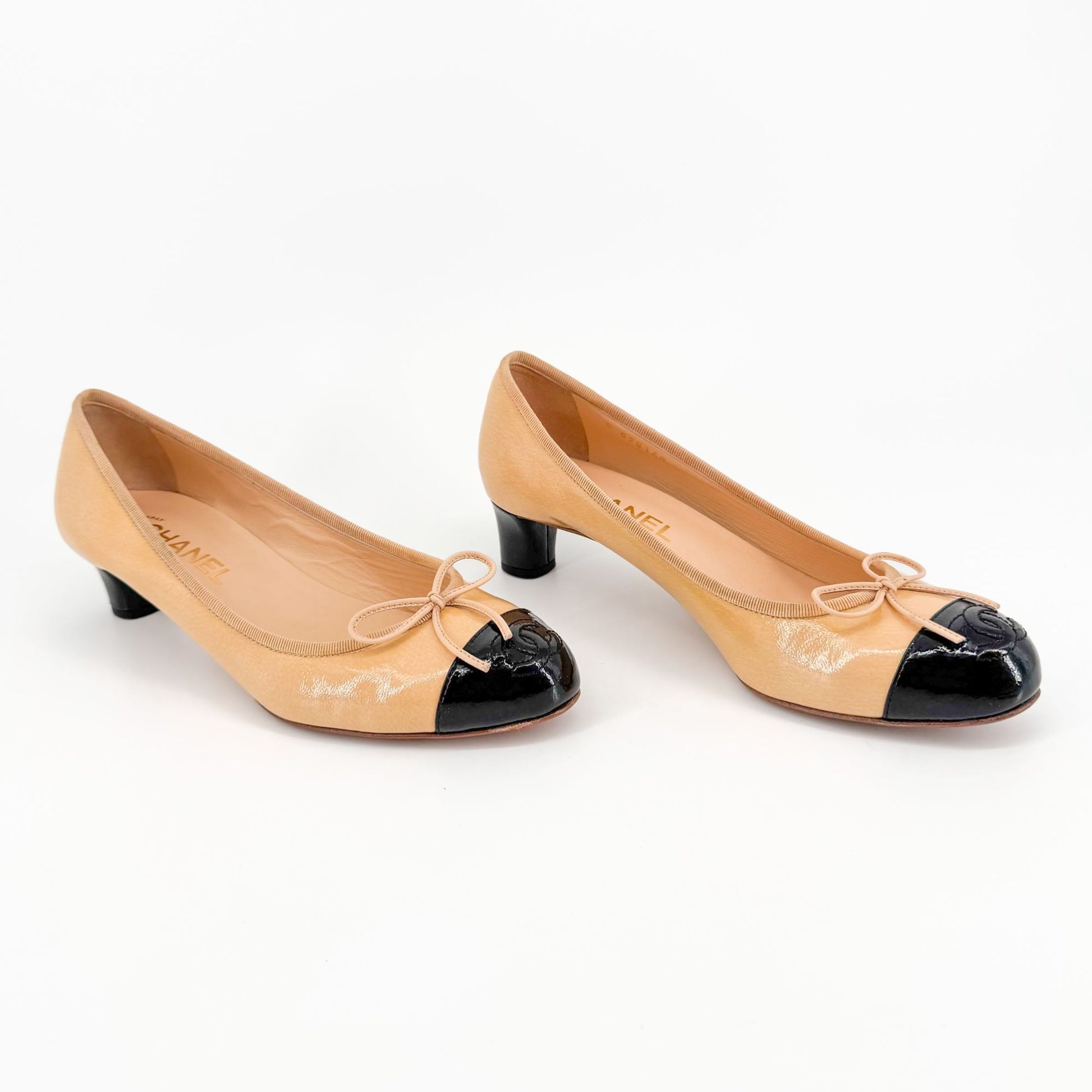 Chanel CC Cap Toe Kitten Pumps in Beige & Black Patent Leather