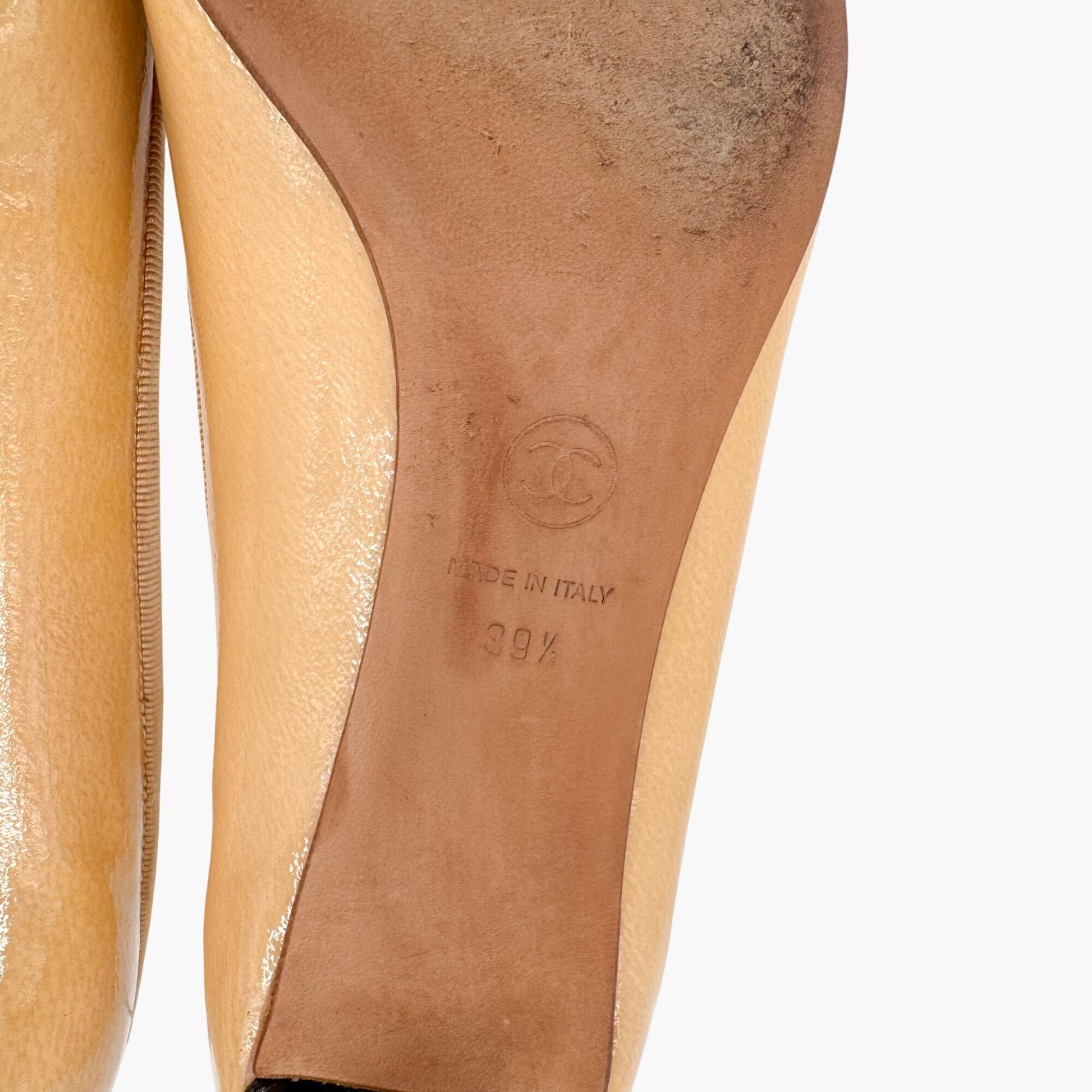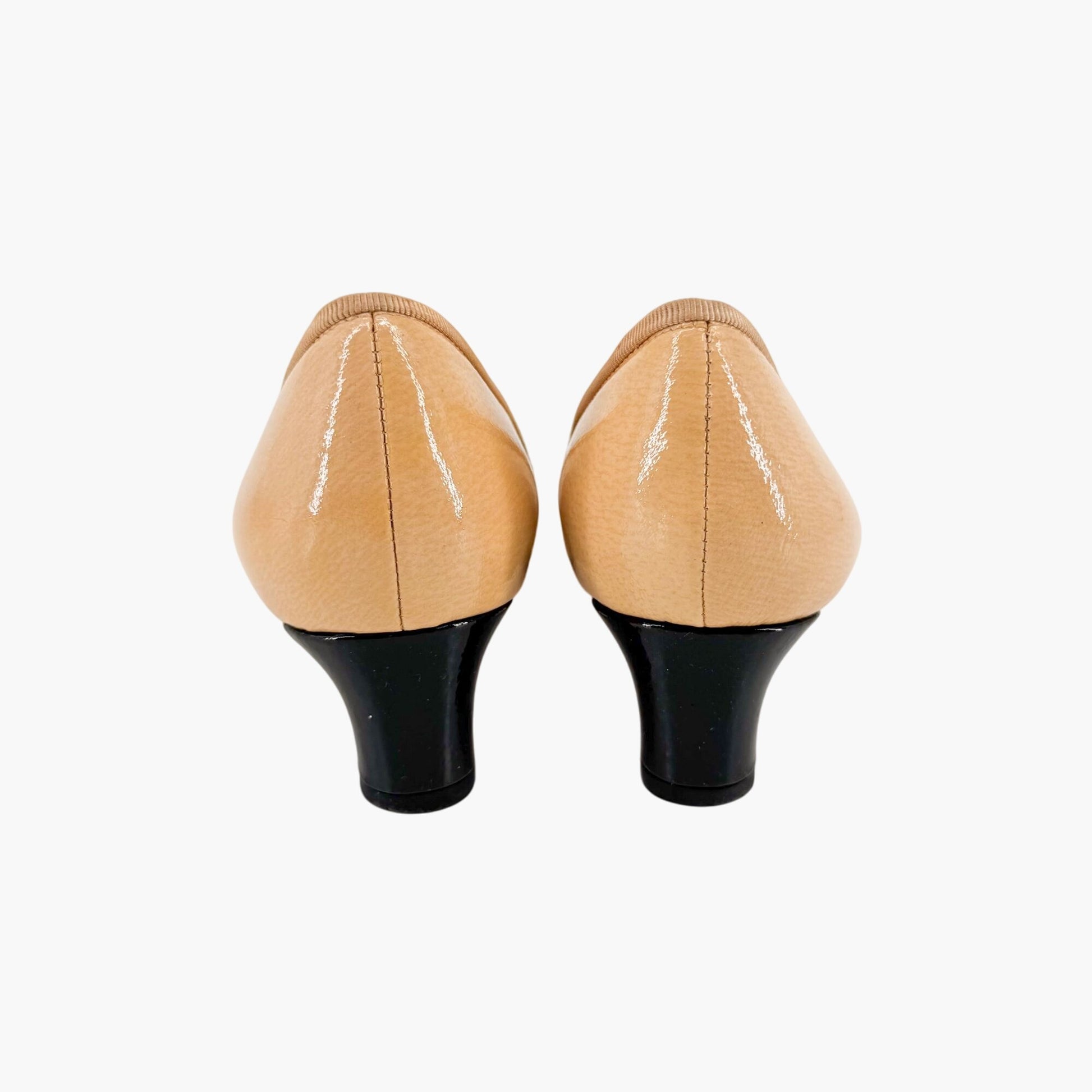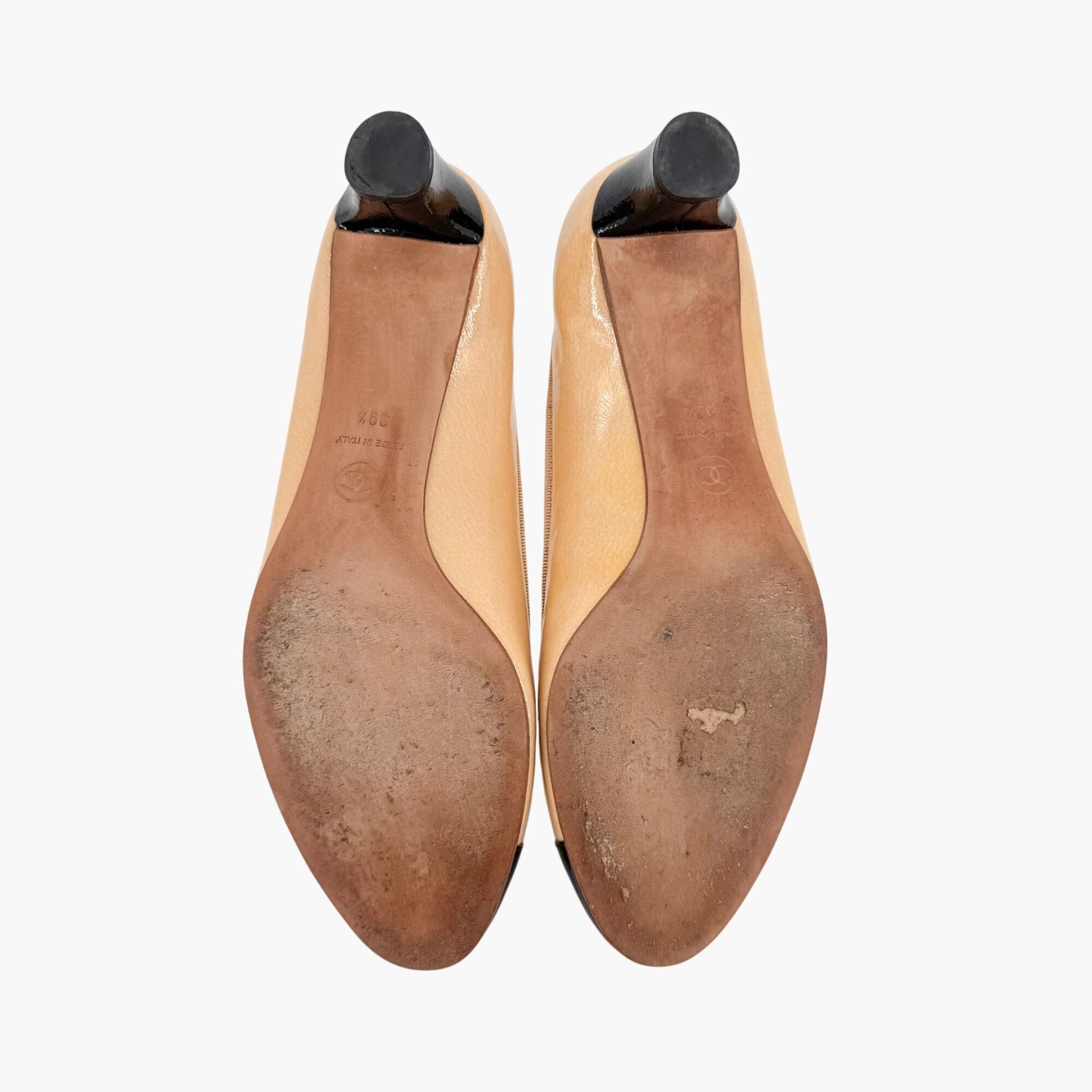 Chanel CC Cap Toe Kitten Pumps in Beige & Black Patent Leather Size 39.5