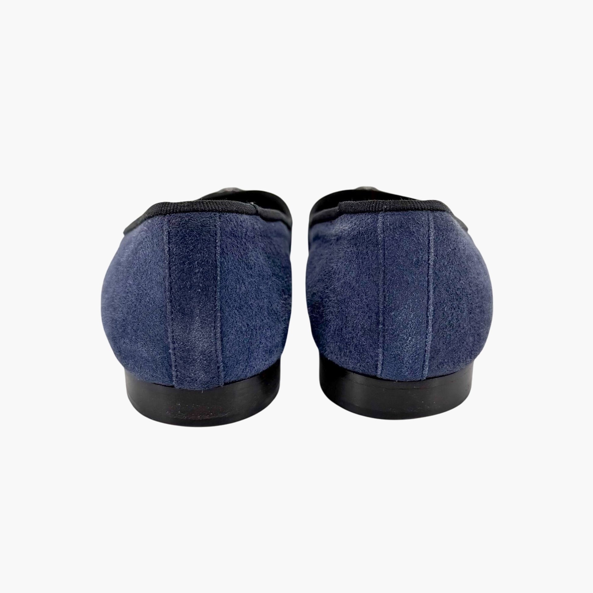 These Chanel CC Ballet Flats are crafted from navy blue suede with black suede cap toes and enamel CC logos. The round-toe silhouette and leather lining reflect Chanel’s signature elegance, offering a versatile option for refined casual wear or elevated everyday outfits.