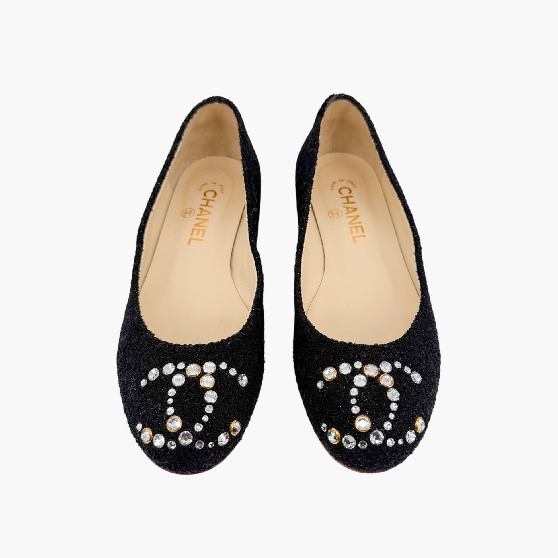 Chanel Crystal CC Ballet Flats Black Boucle Size 38