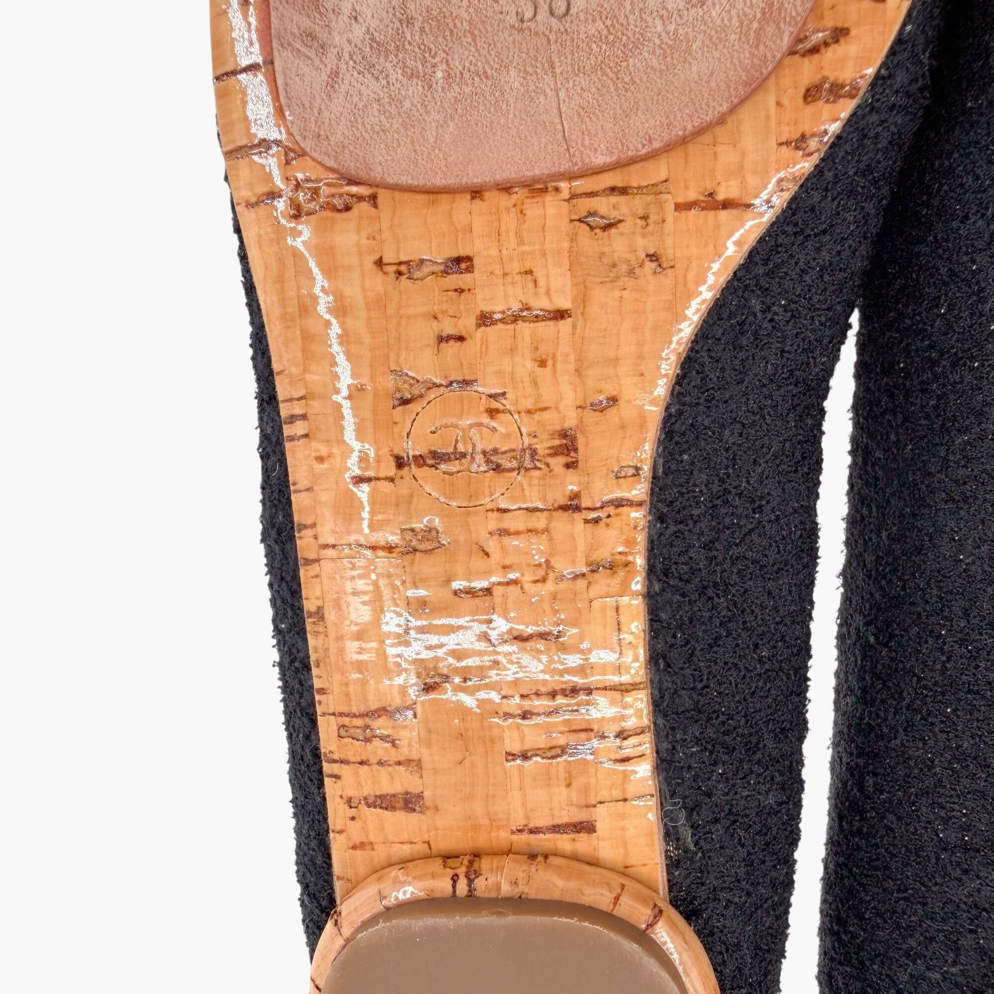These Chanel ballet flats feature textured black boucle fabric with subtle gold-tone shimmer and a crystal-embellished CC logo at the toe. Designed with a round toe and low cork block heel, they offer refined elegance with statement detail. Ideal for workwear, travel, and elevated everyday outfits.