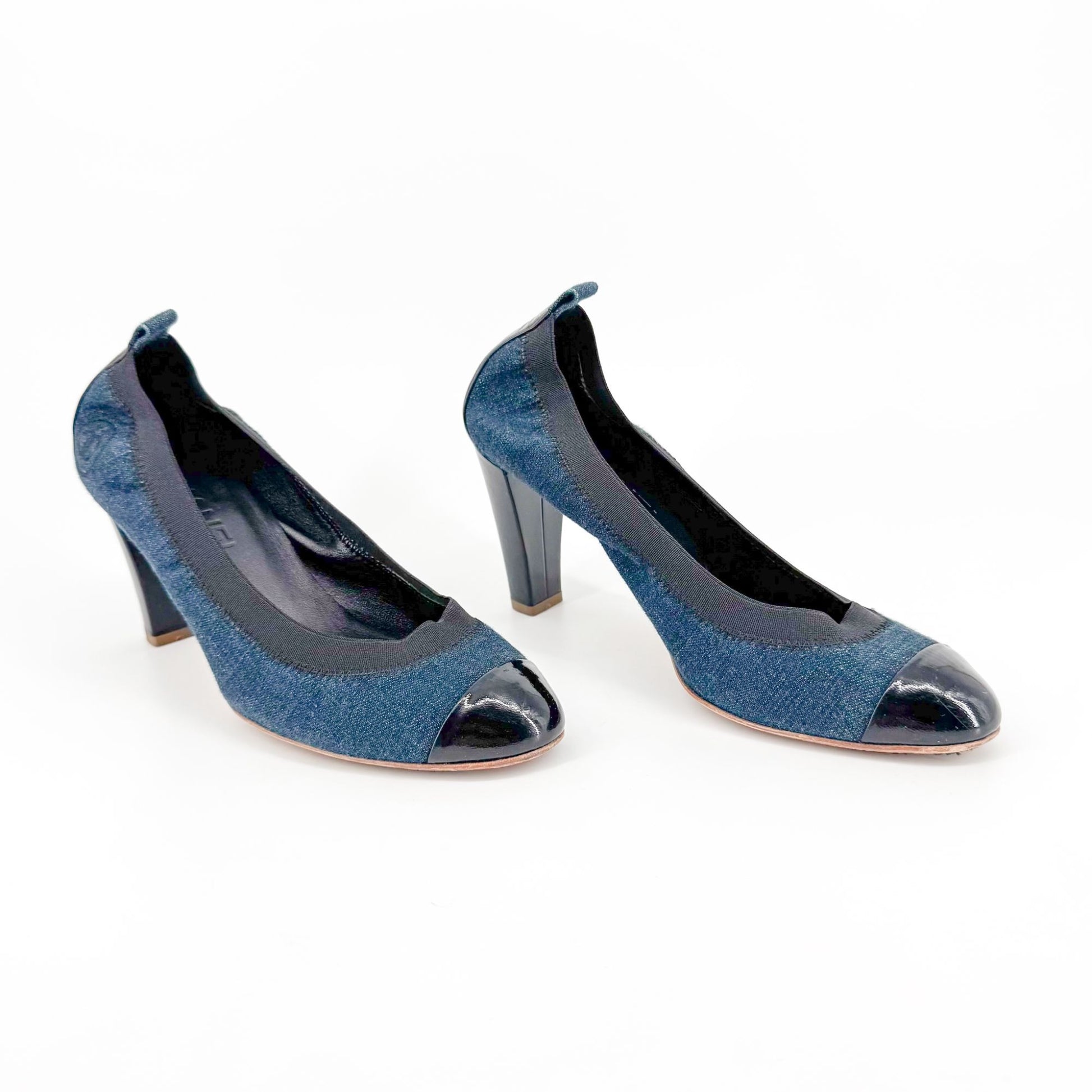 These Chanel pumps feature a navy blue denim upper with a black patent leather cap toe and mid-height block heel. The elasticized opening provides a flexible, slip-on fit, while the embroidered CC logo on the heel adds signature branding. A versatile silhouette ideal for office wear or elevated casual looks.