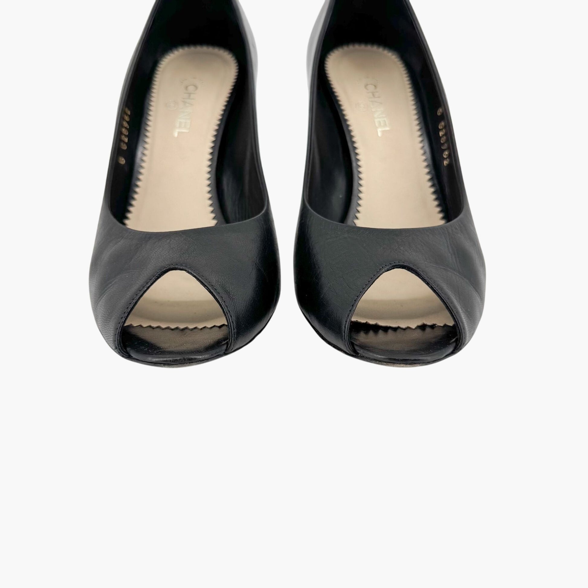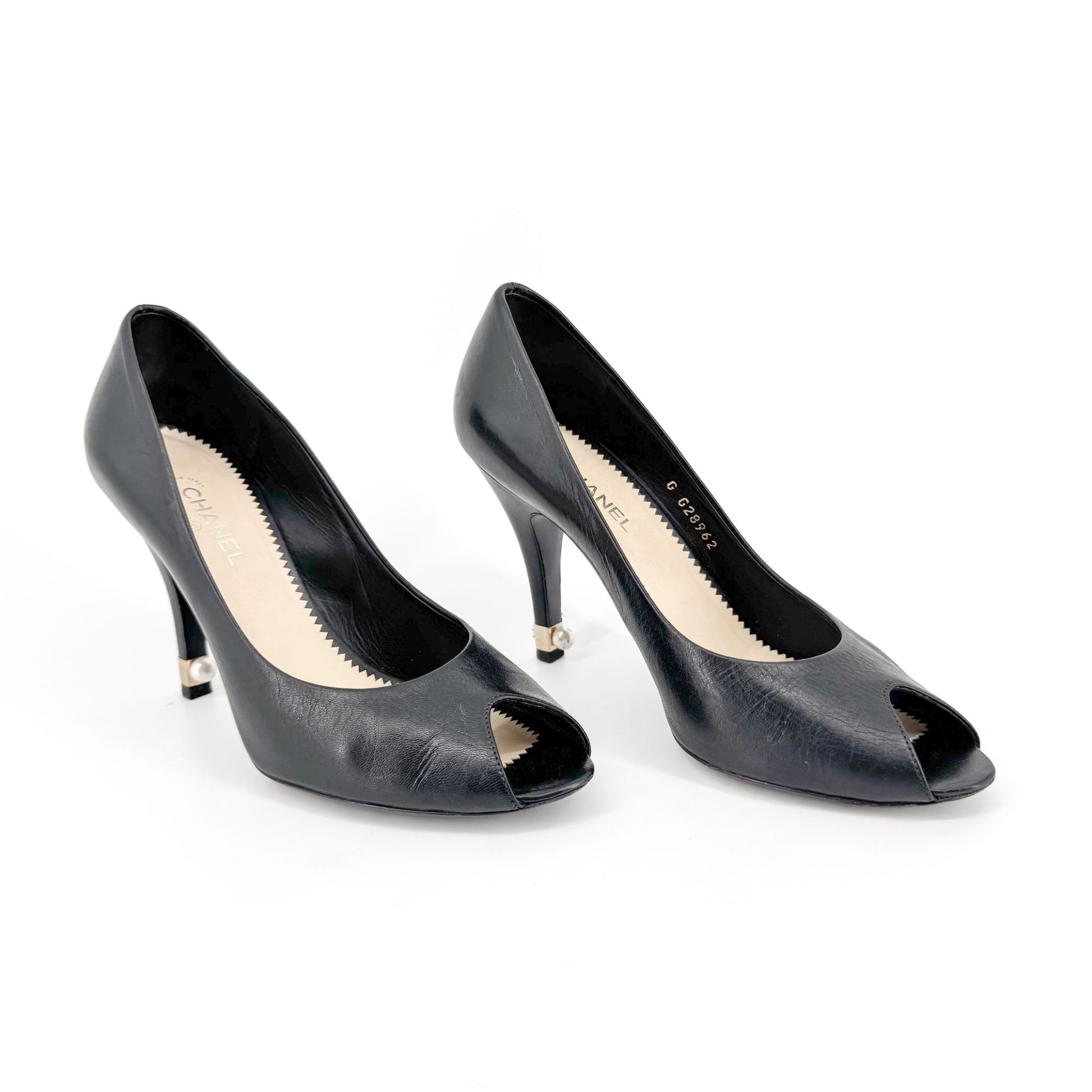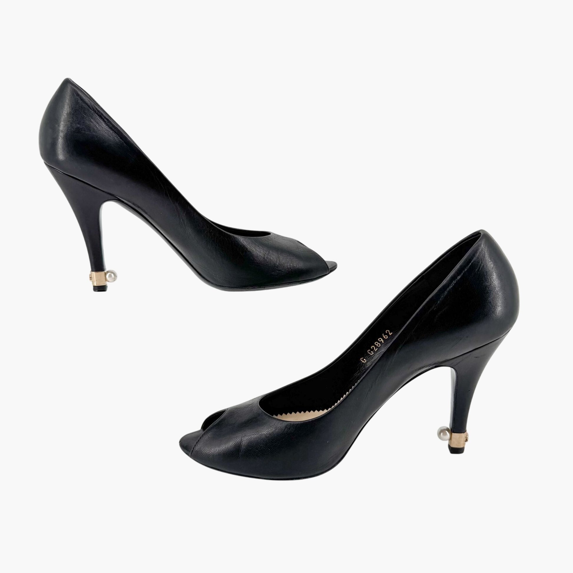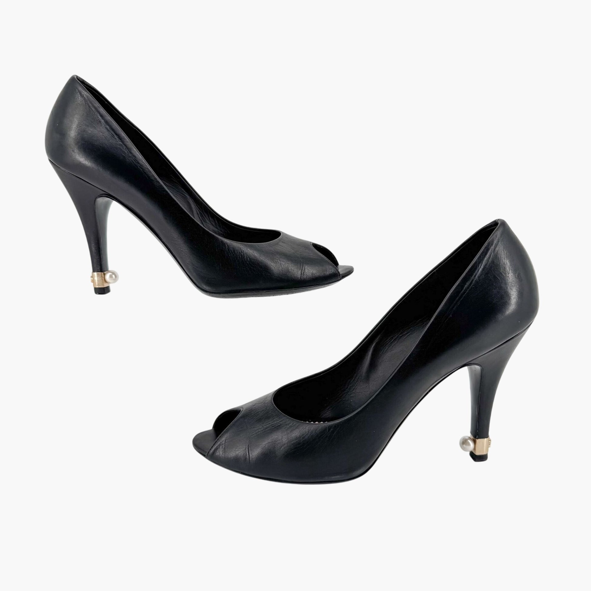Chanel Peep Toe Pumps in Black Leather with Pearl CC Heel – Size 38.5