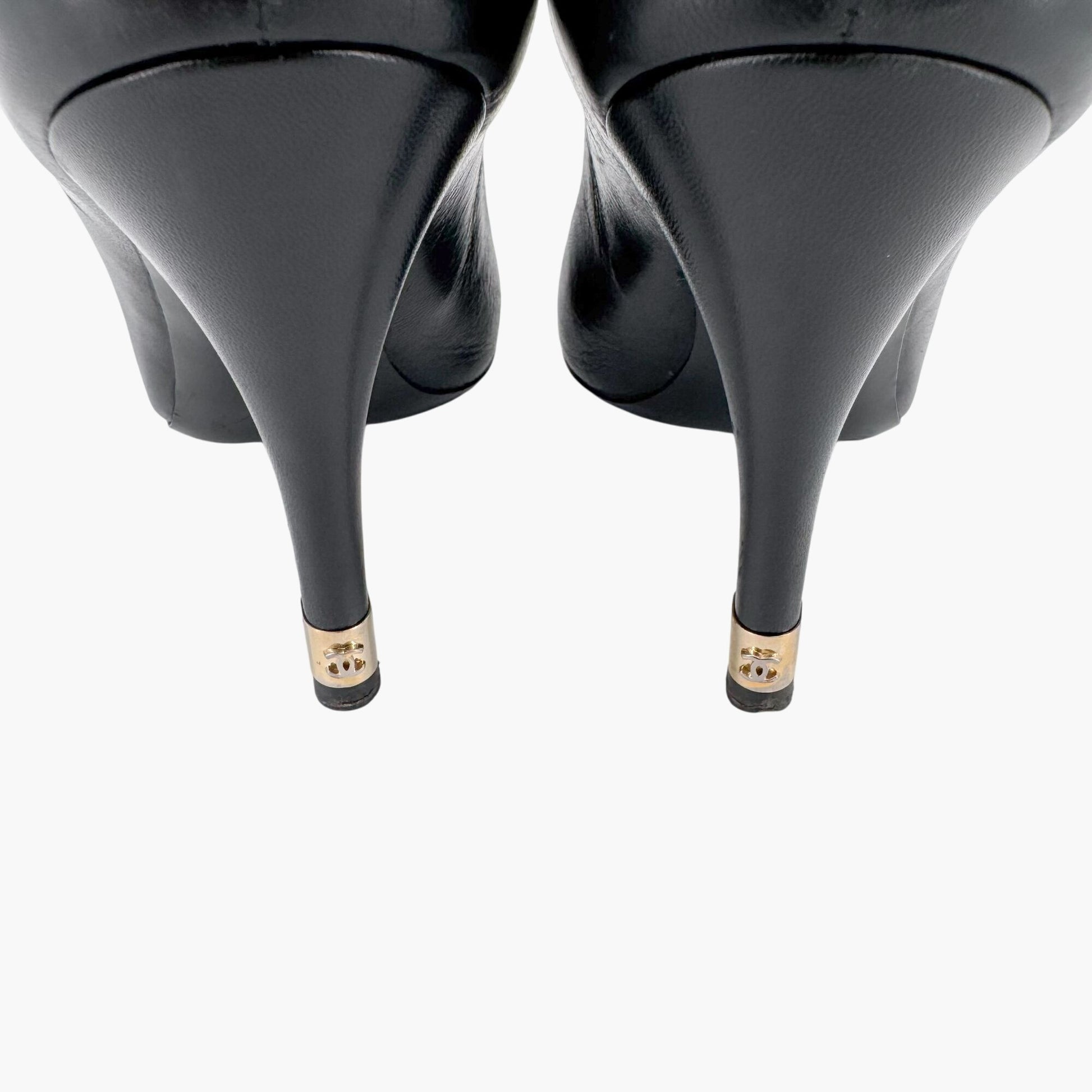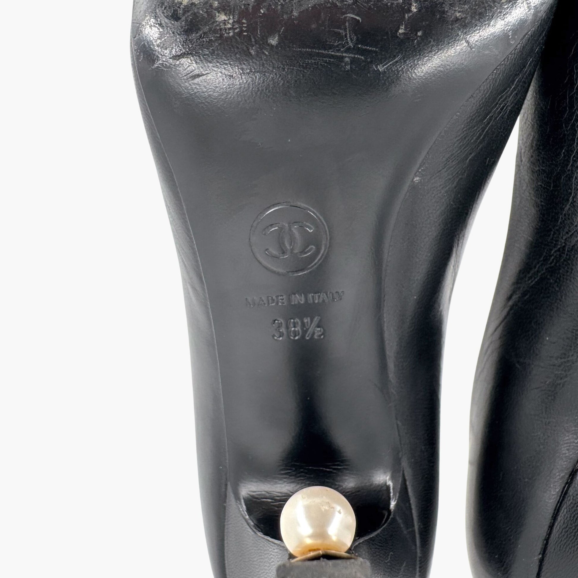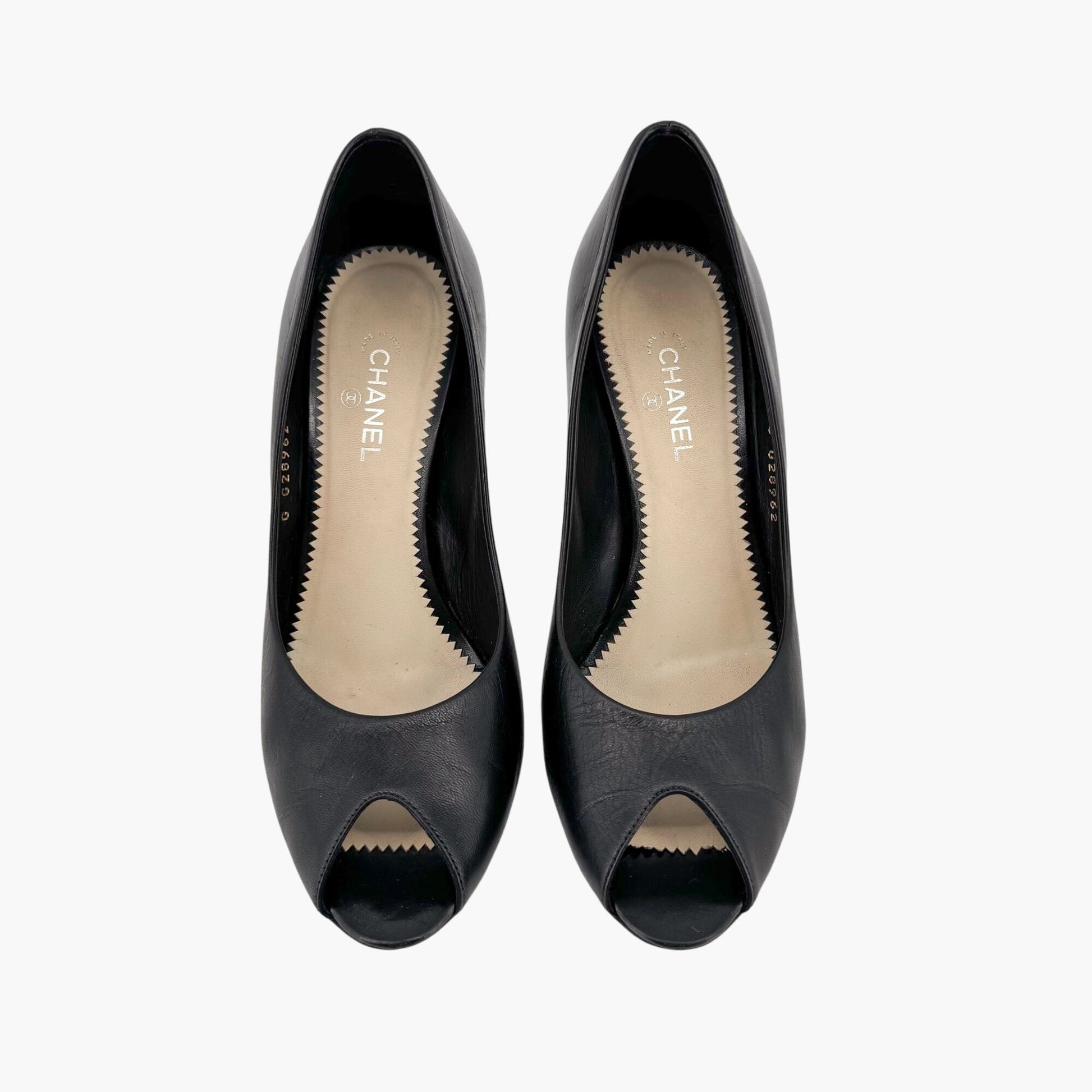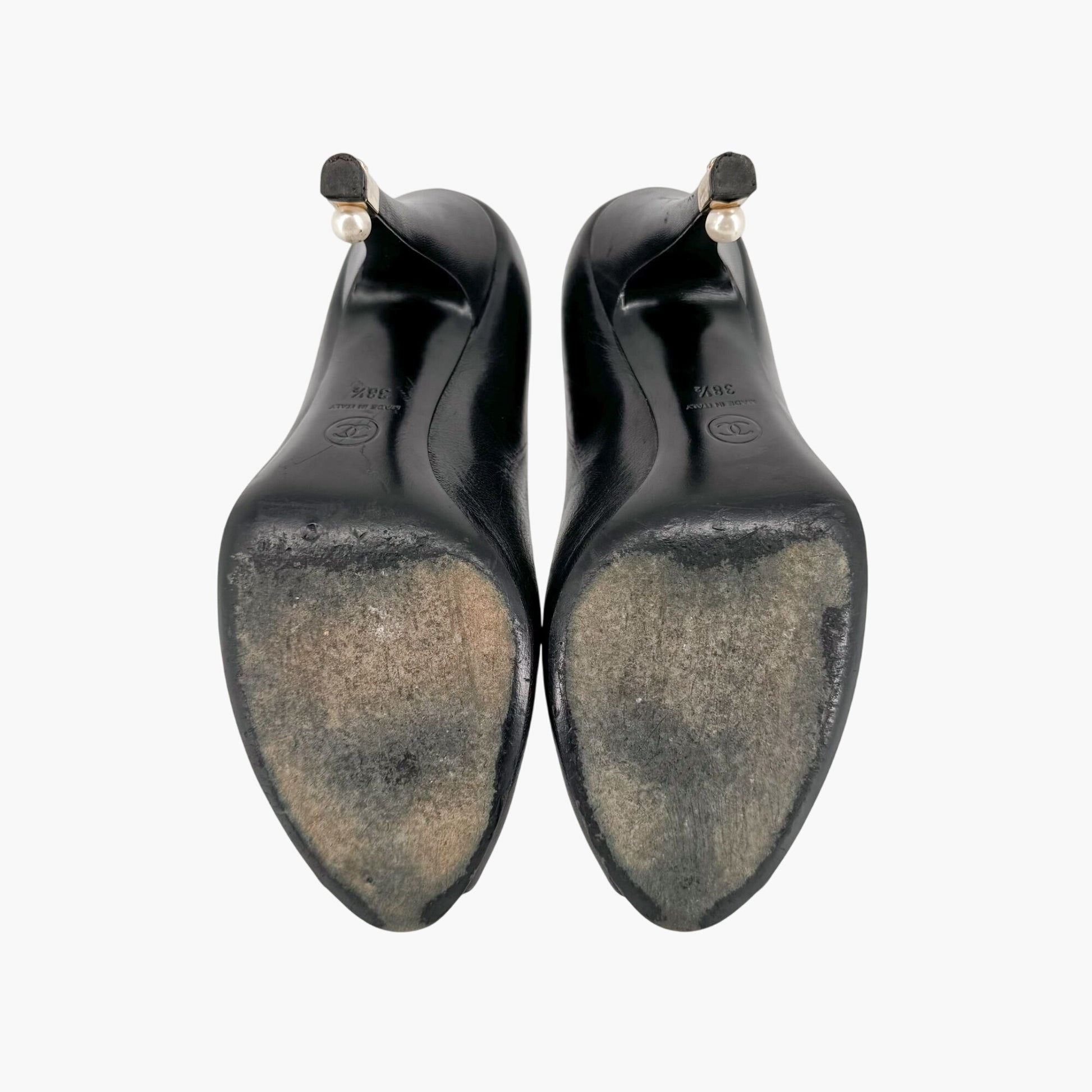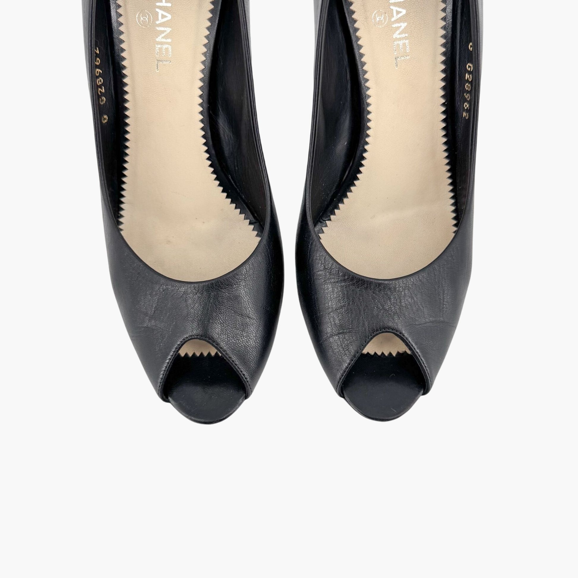 Chanel Peep Toe Pumps in Black Leather with Pearl CC Heel – Size 38.5