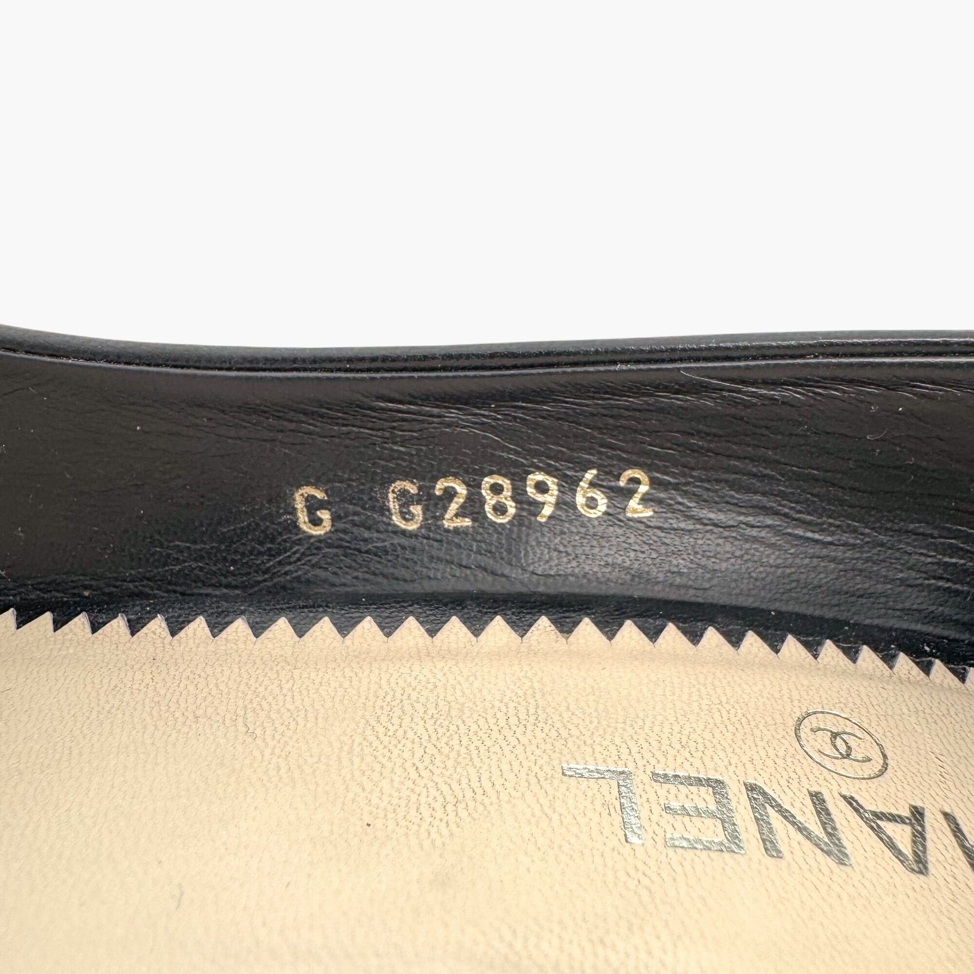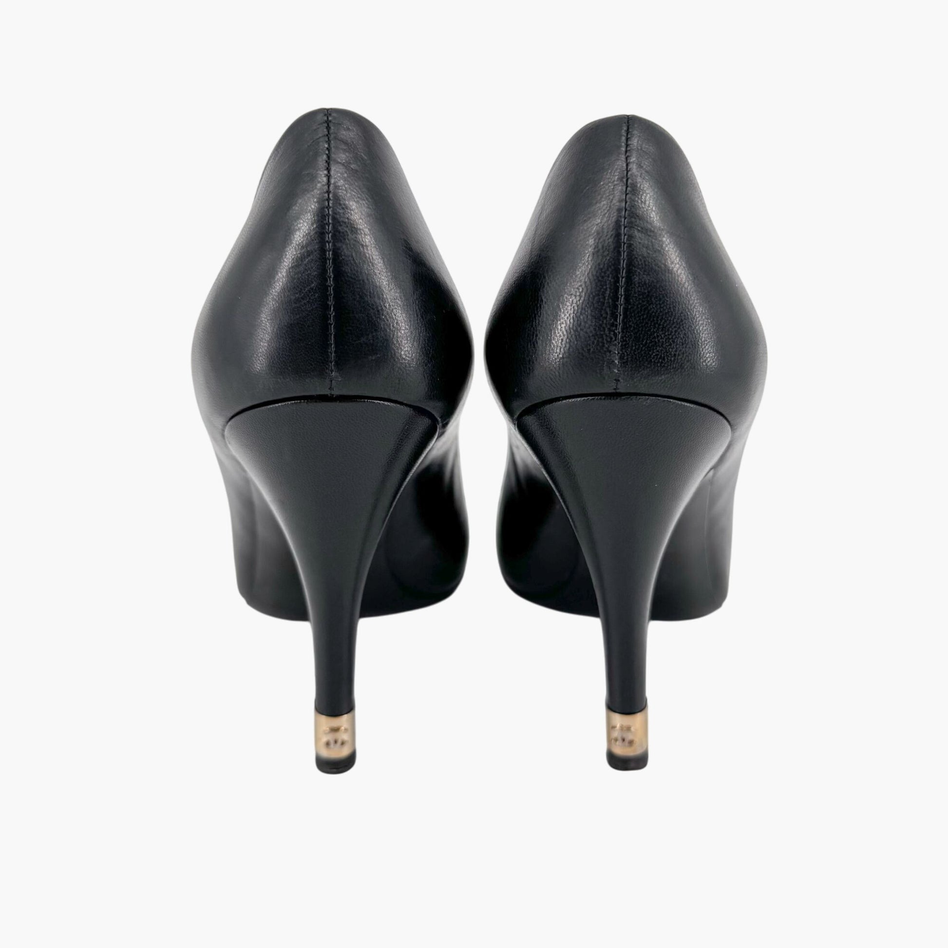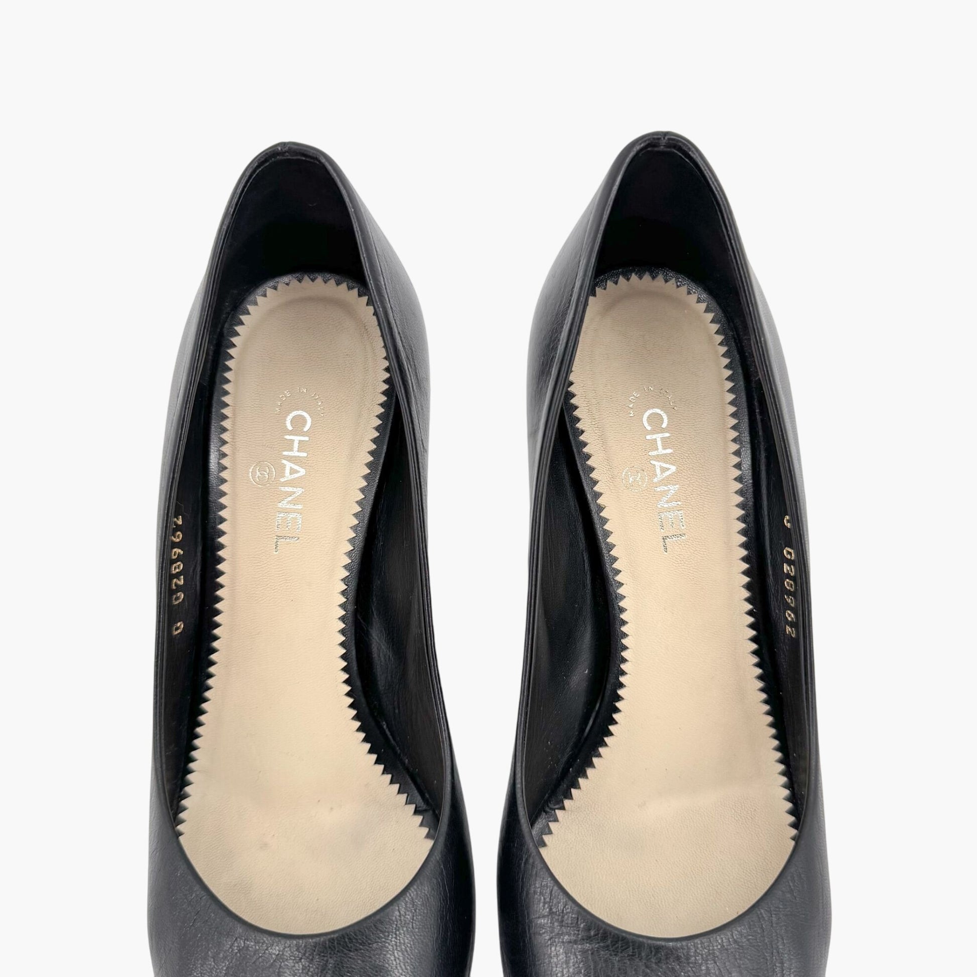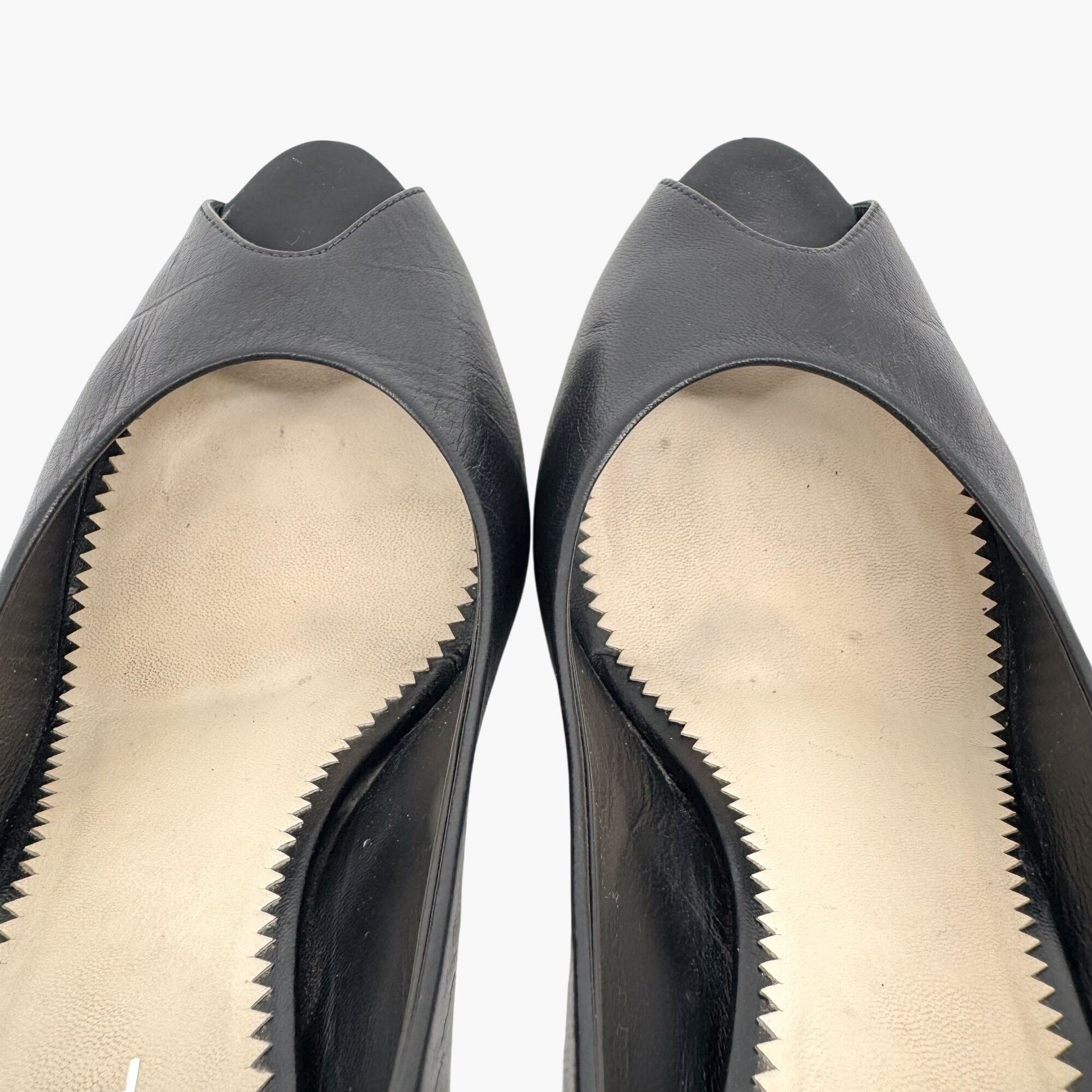 Chanel Peep Toe Pumps in Black Leather with Pearl CC Heel – Size 38.5