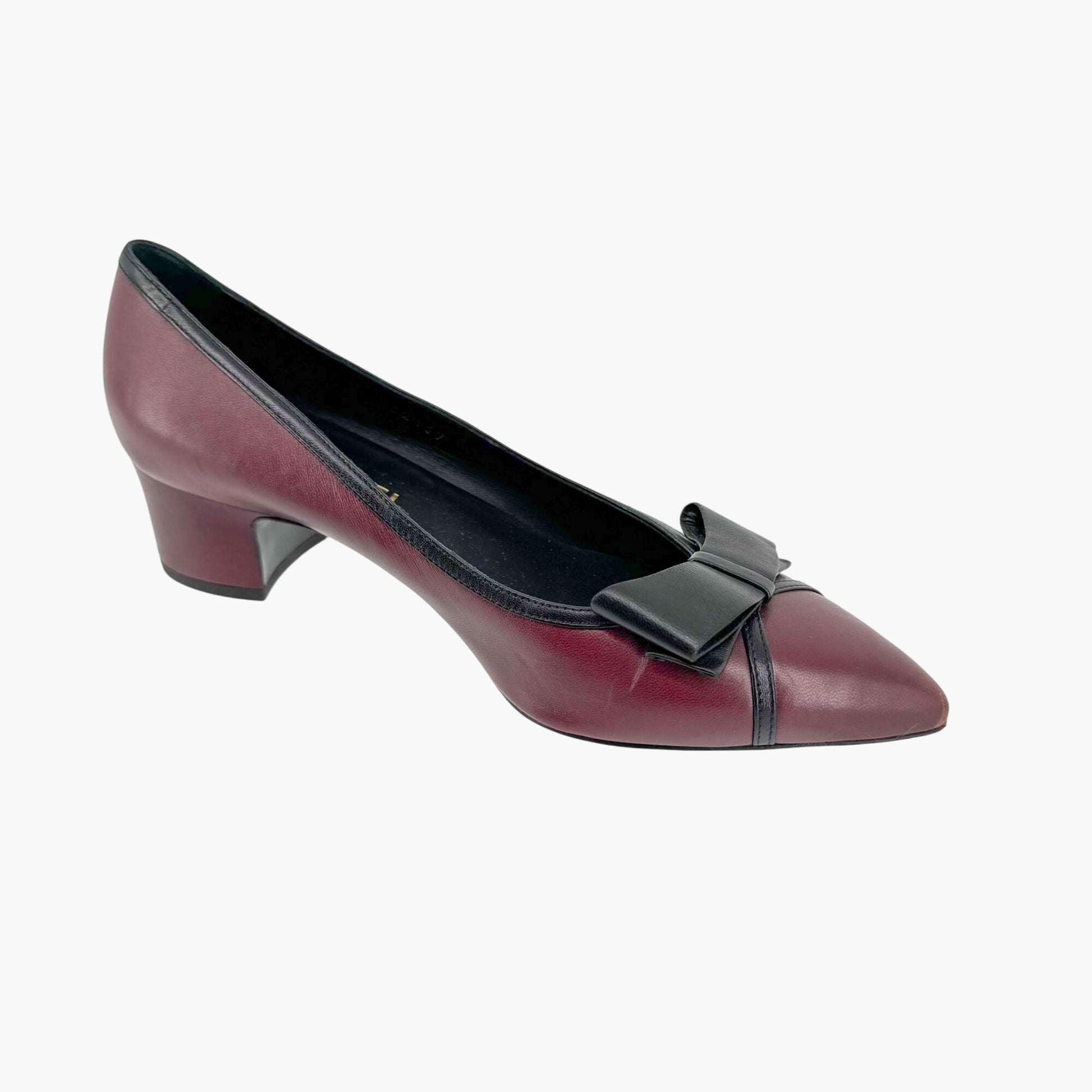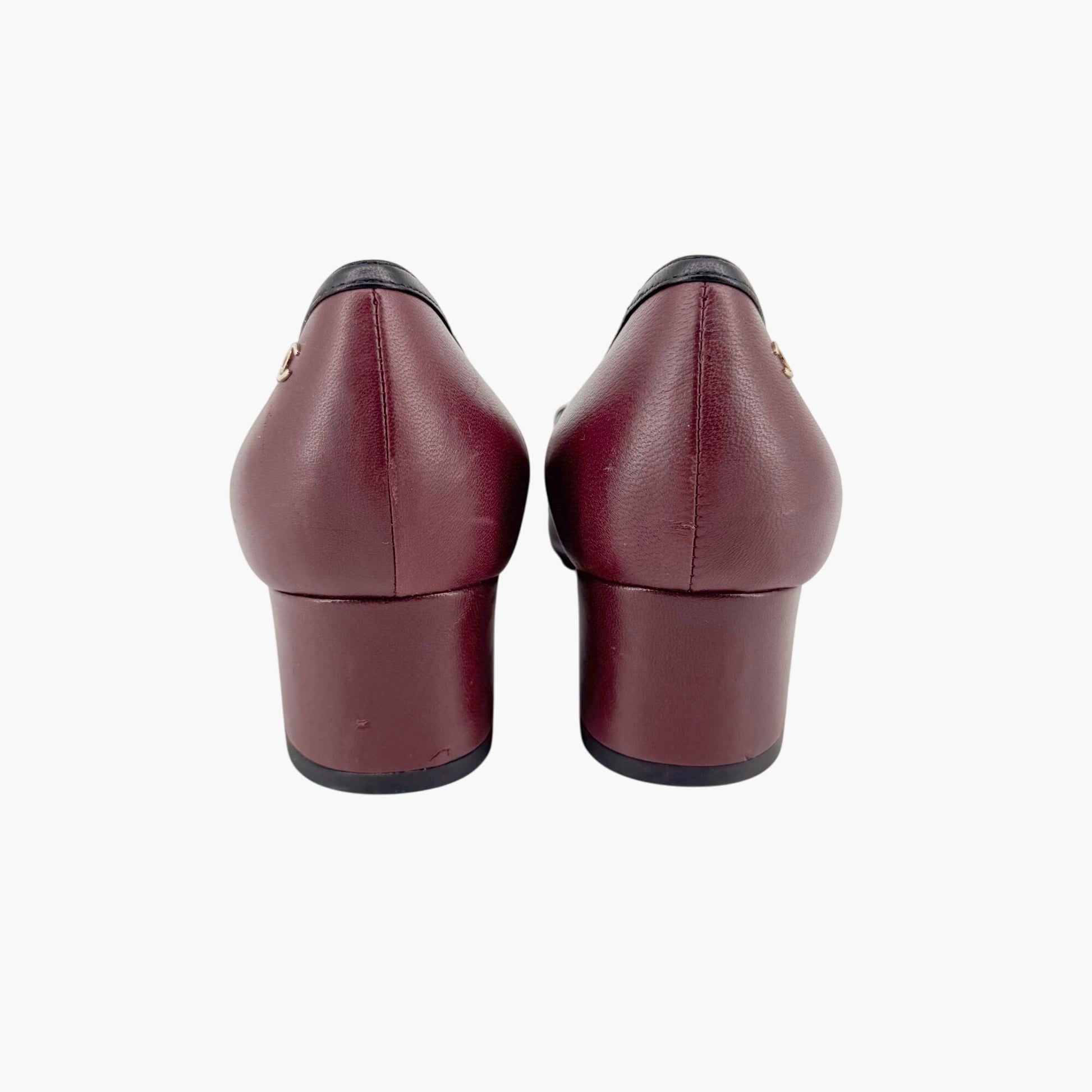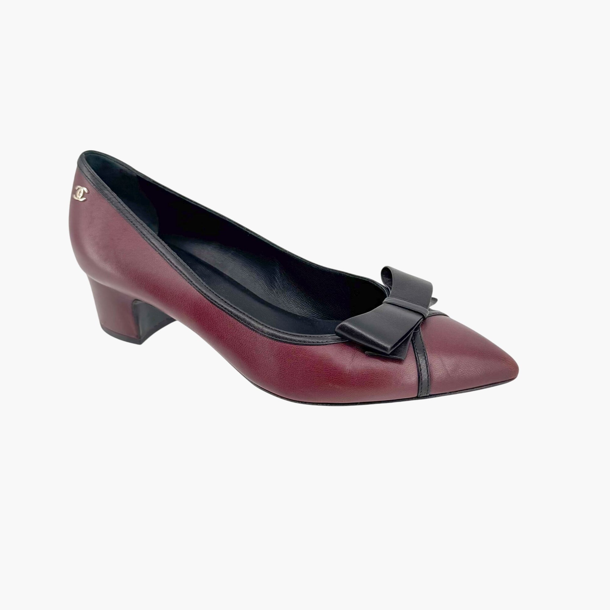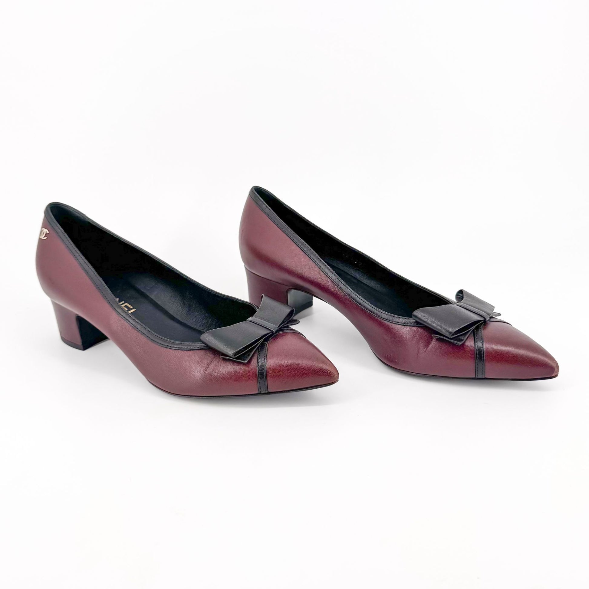 These Chanel pumps offer classic elegance with a subtle touch of contrast. Crafted from rich maroon leather, the slip-on silhouette features a pointed toe and a black leather bow detail at the vamp, adding a refined, feminine finish. A small CC logo accent at the heel provides signature Chanel flair, while the low block heel offers comfortable, all-day wear. Finished with a leather footbed, lining, and outsole, these pumps are perfect for office wear, dinner outings, or elevating tailored looks with timeless sophistication.