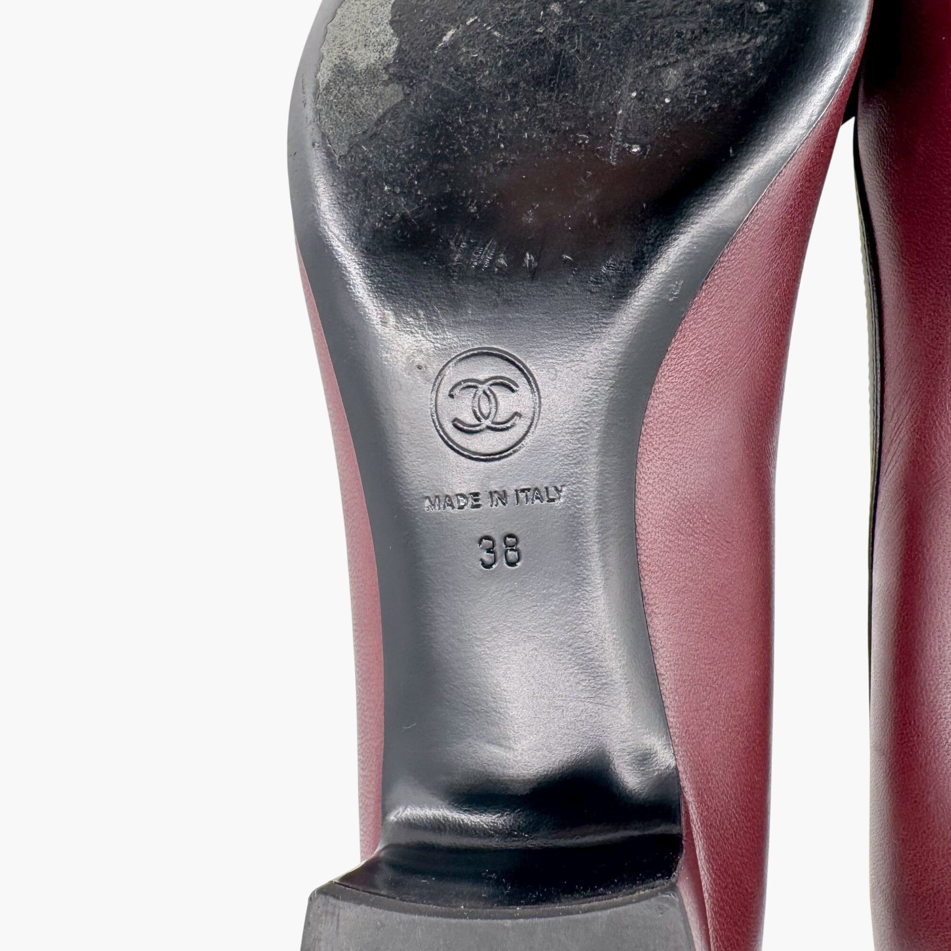 Chanel Pointed Toe Bow Pumps Size 38 US 7-7.5 Maroon Leather CC Mid Block Heel