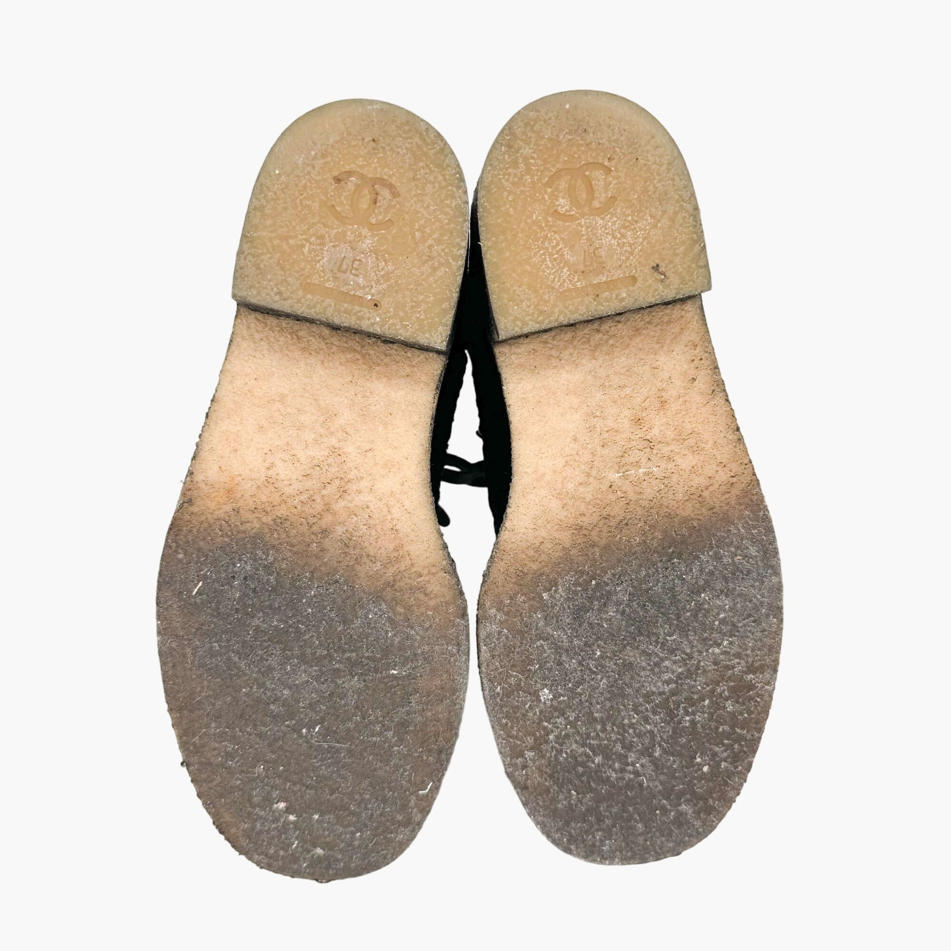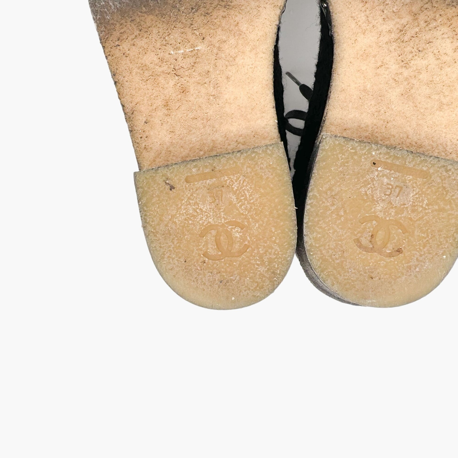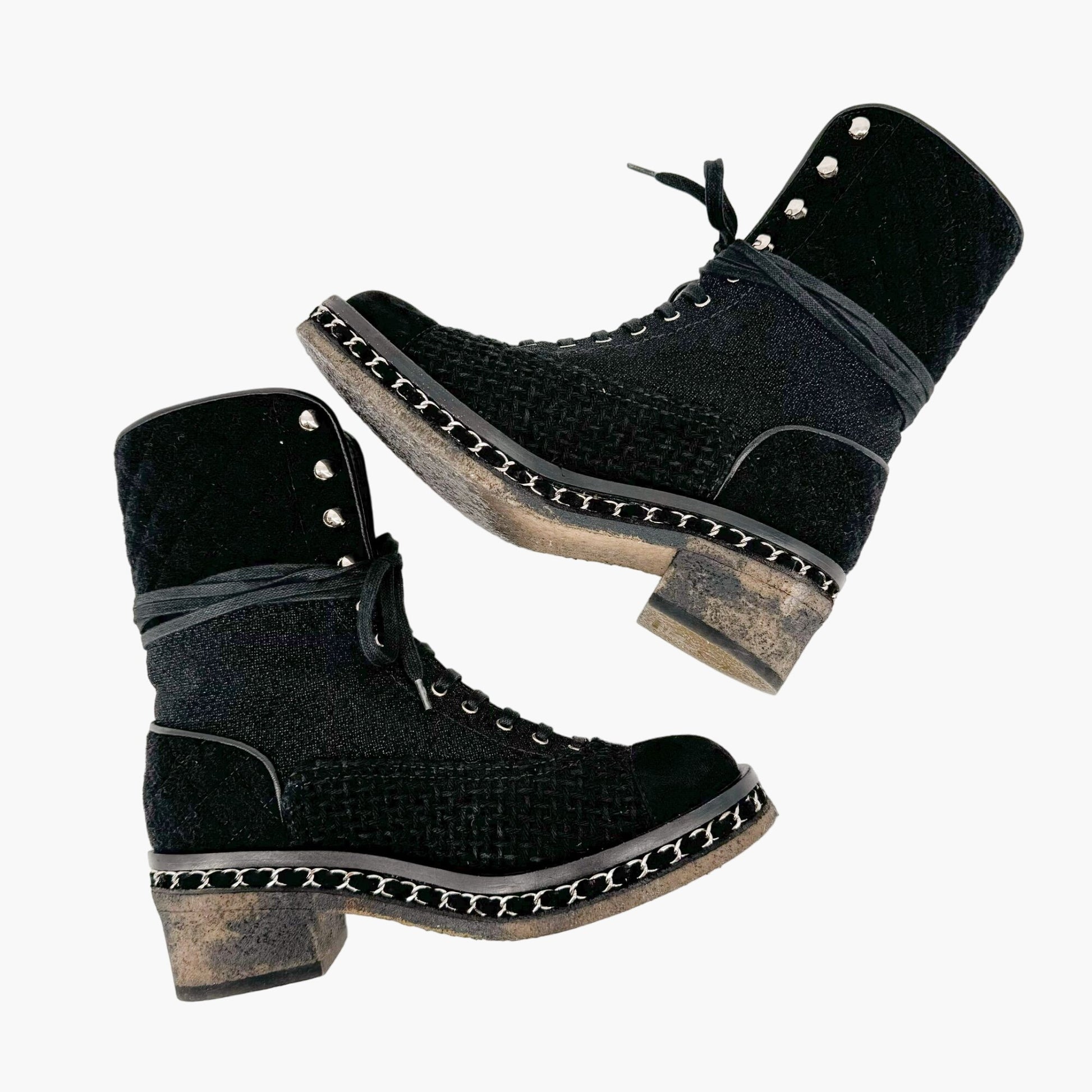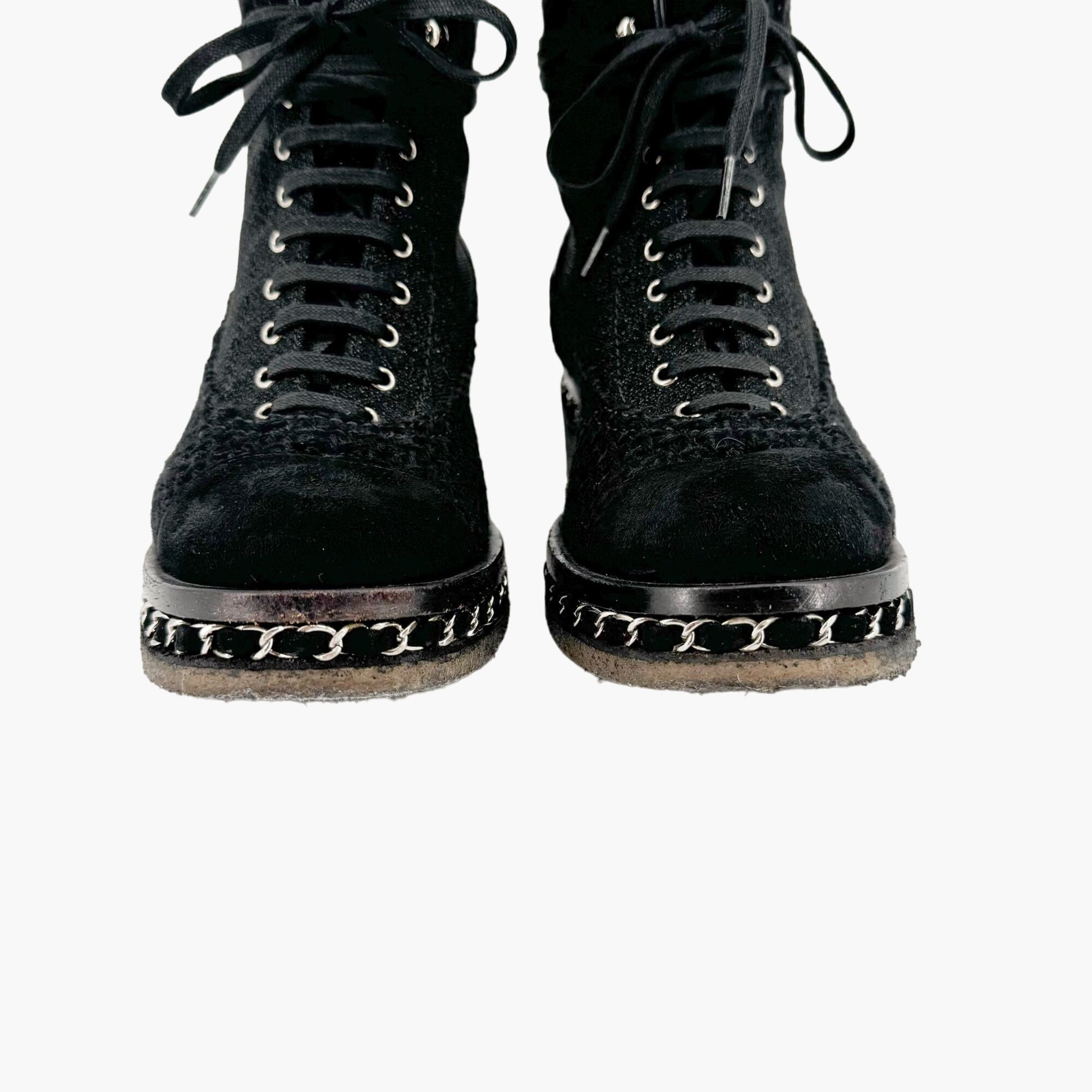 Chanel Tweed Combat Boots EU 37 US 6-6.5 Black CC Chain Quilted Lace Up Ankle