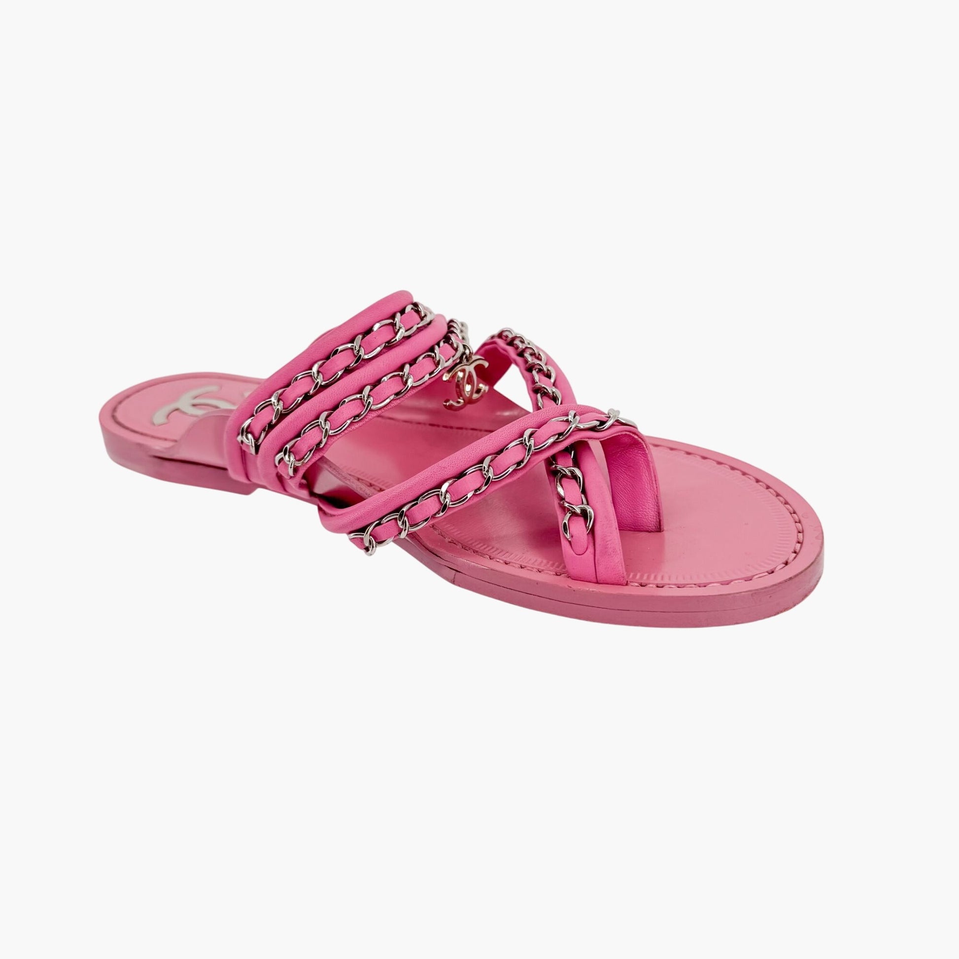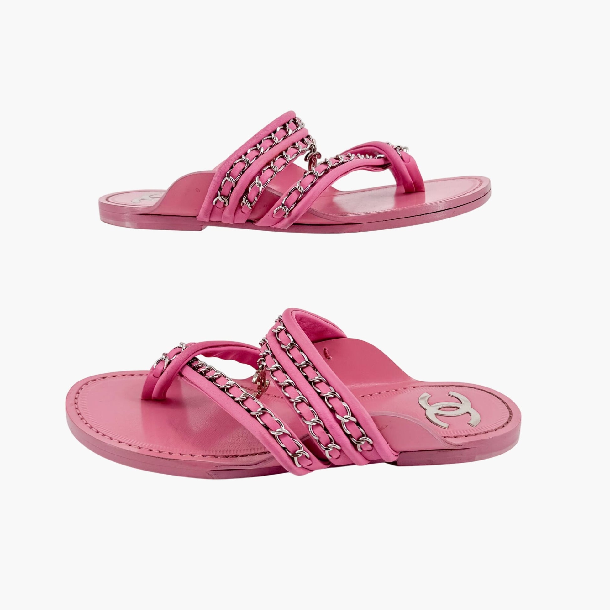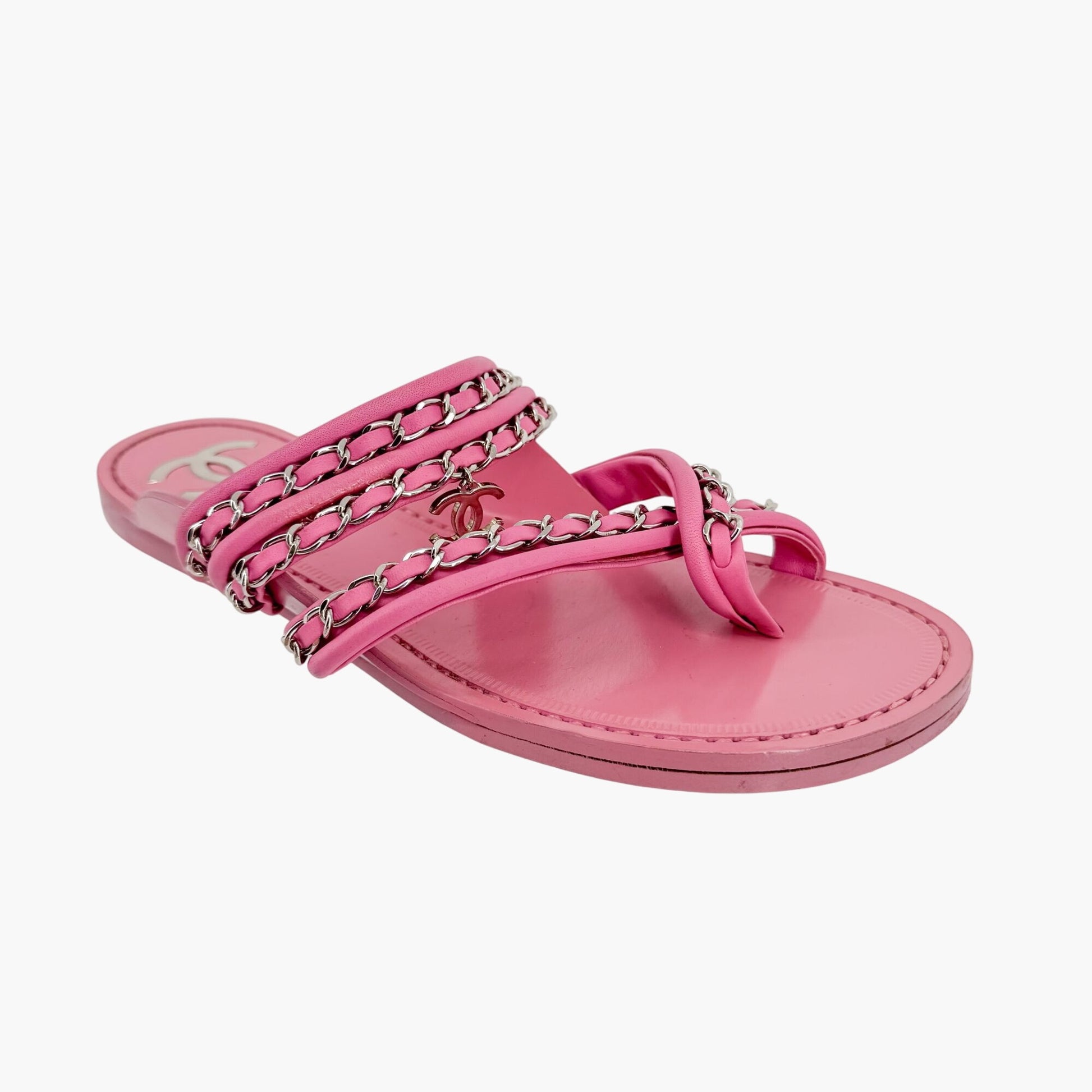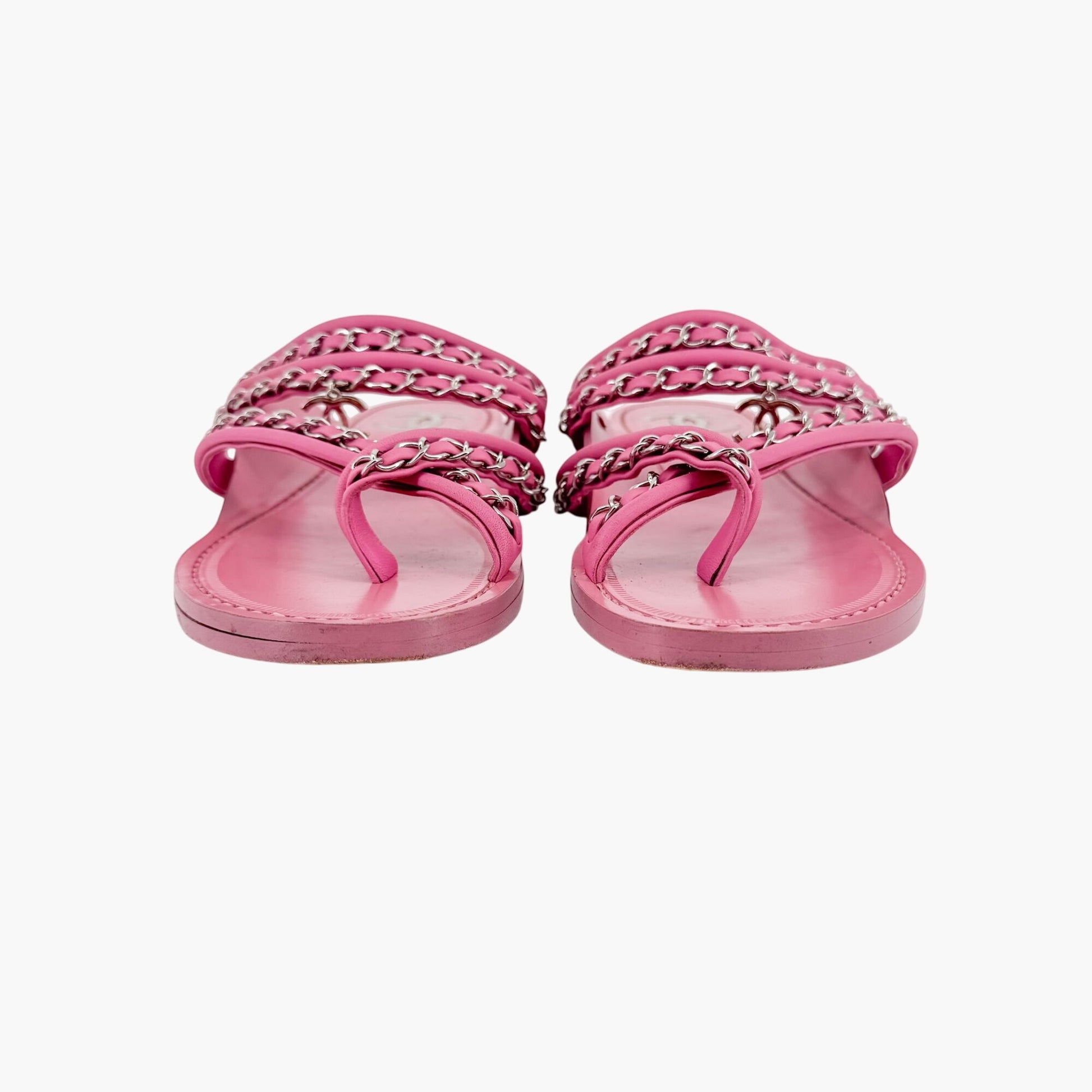 Chanel Toe Ring Chain Flat Sandals in Pink Leather Size 37
