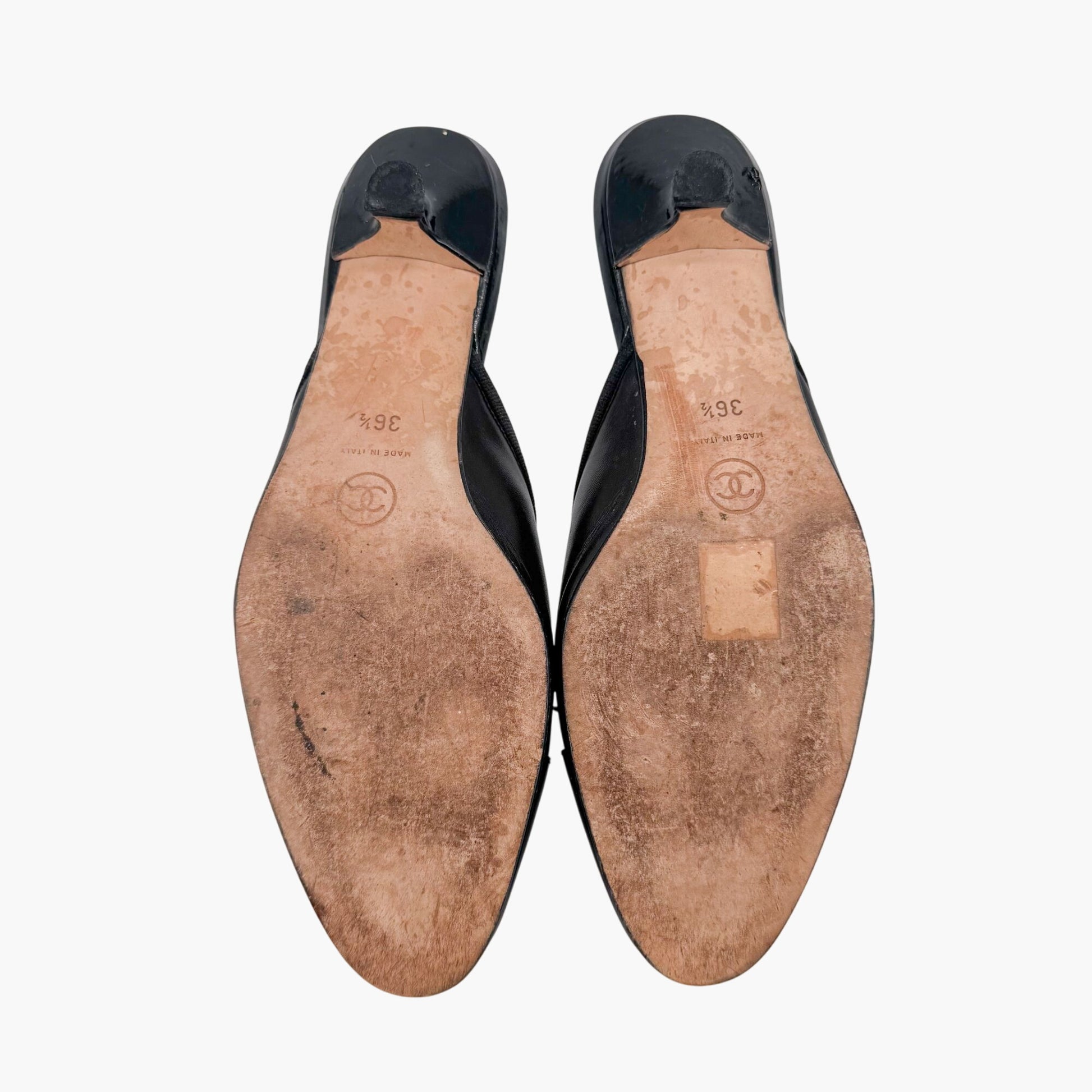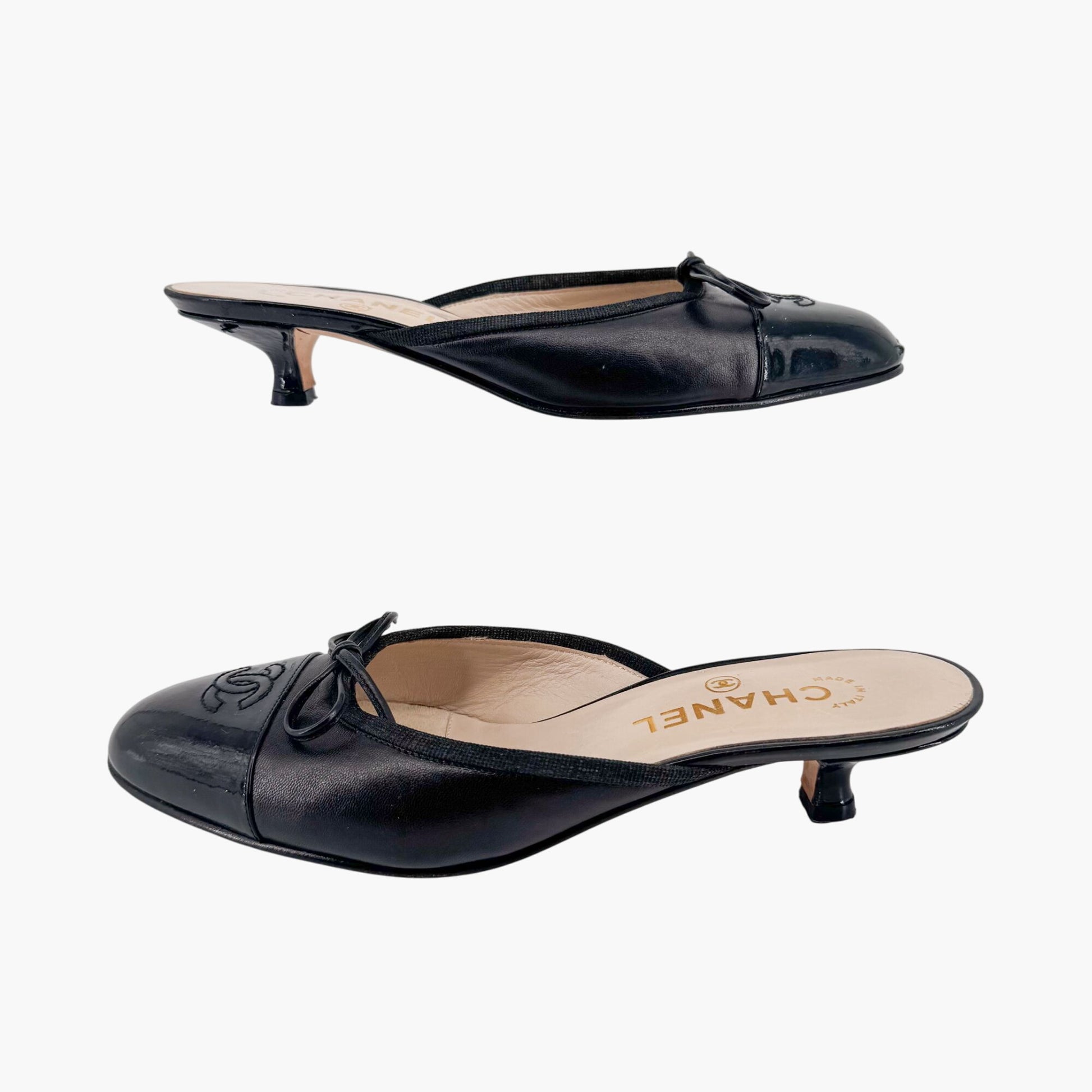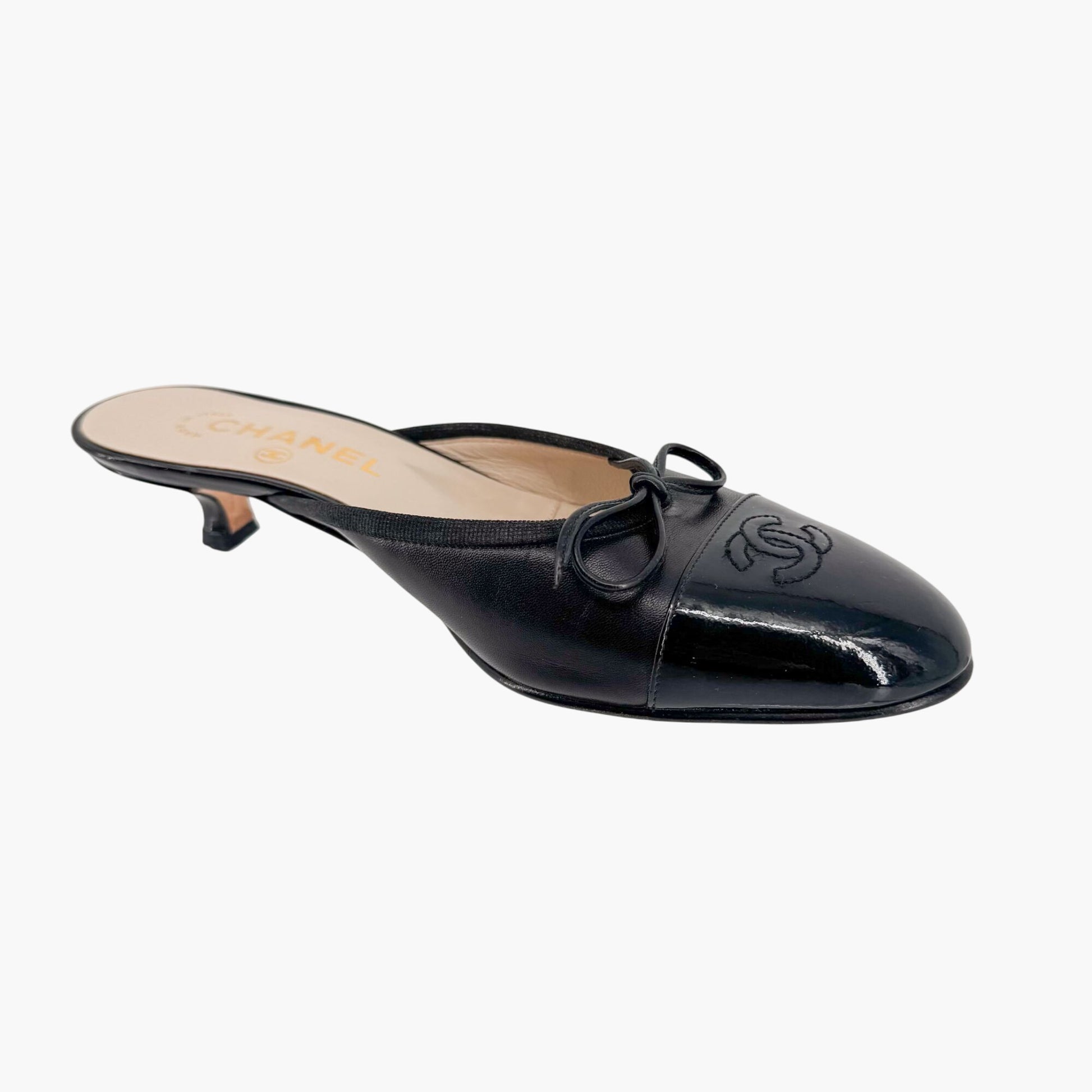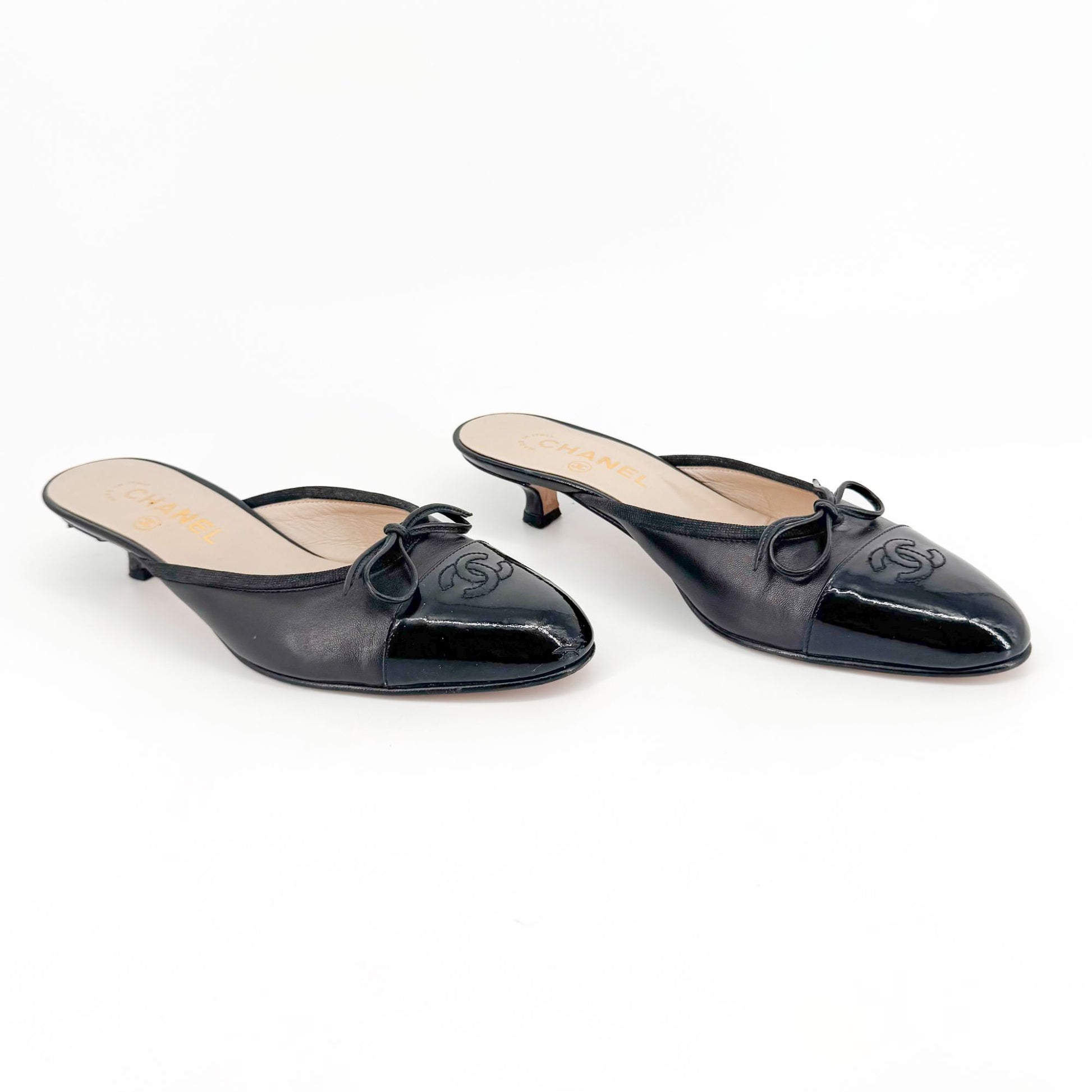 Chanel Vintage CC Cap Toe Kitten Heel Mules in Black Leather – Size 36.5
