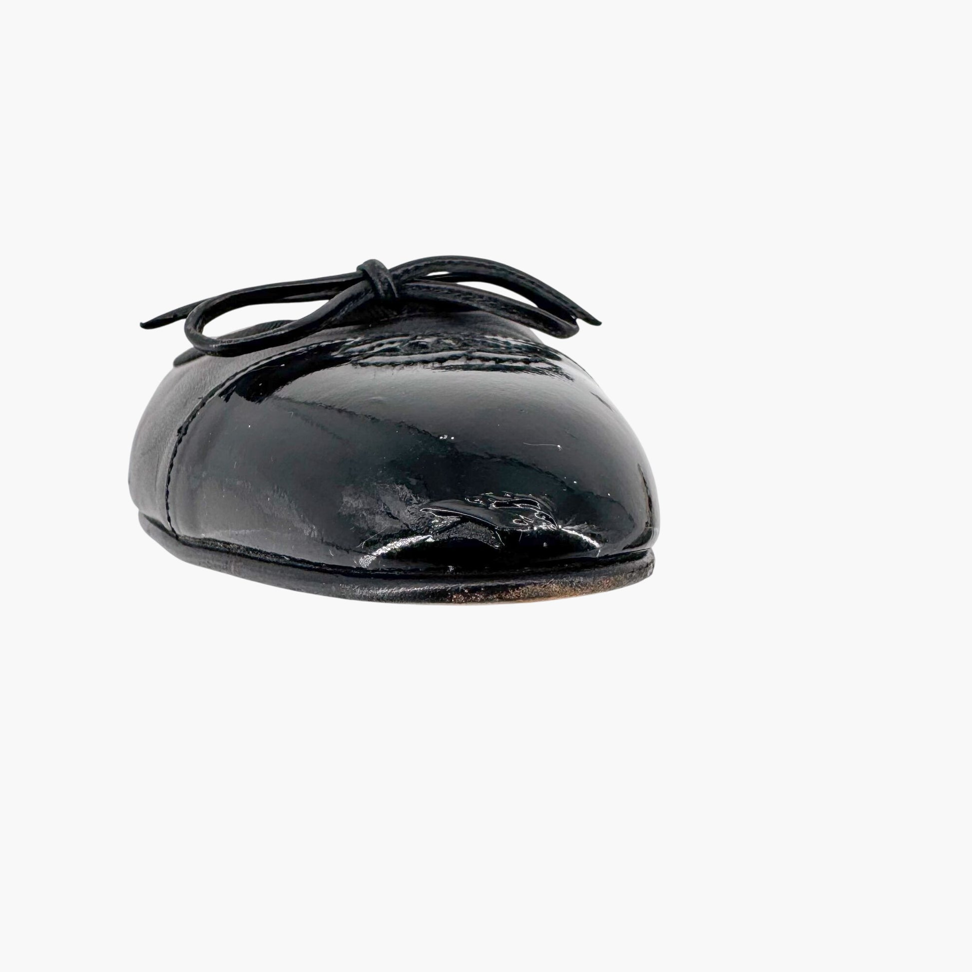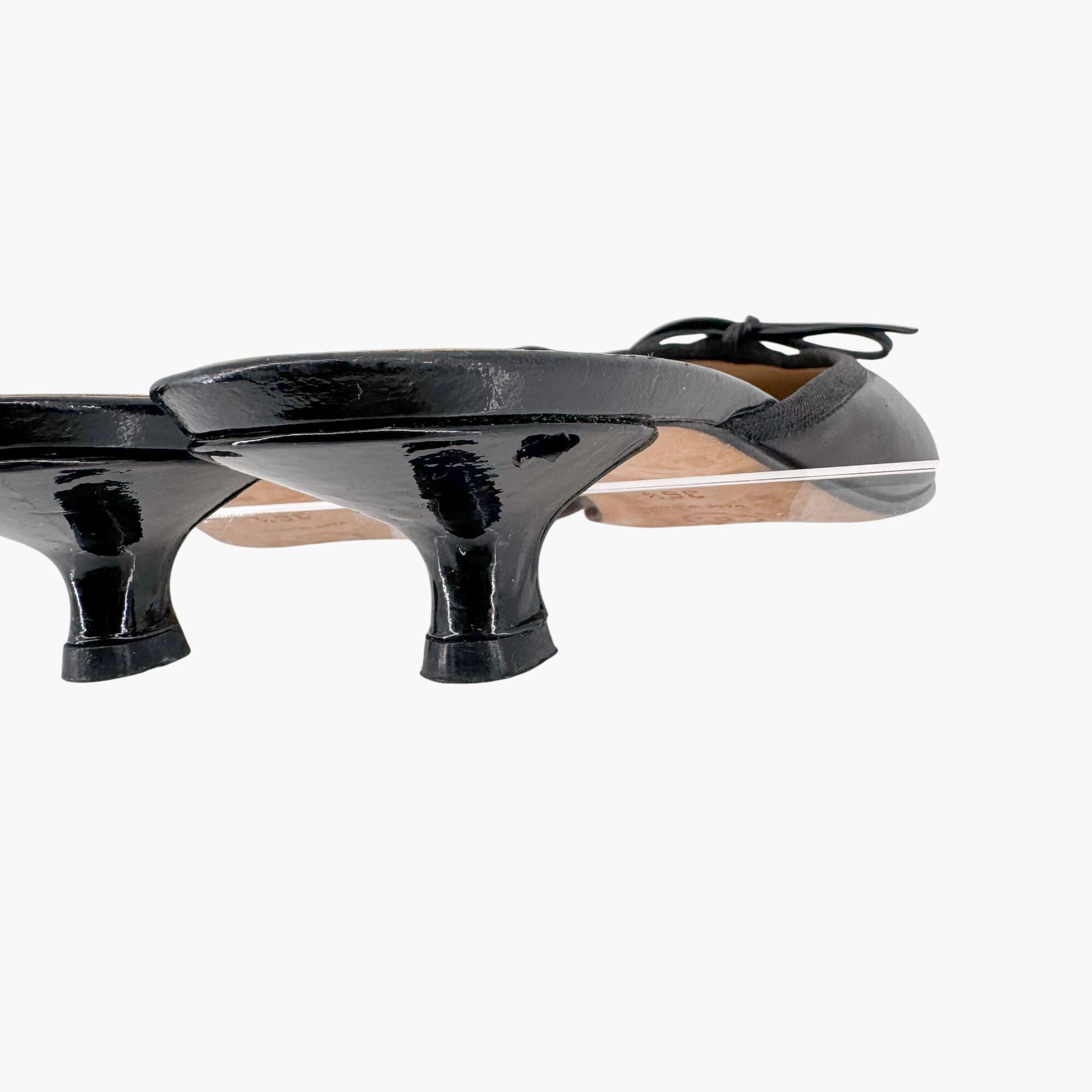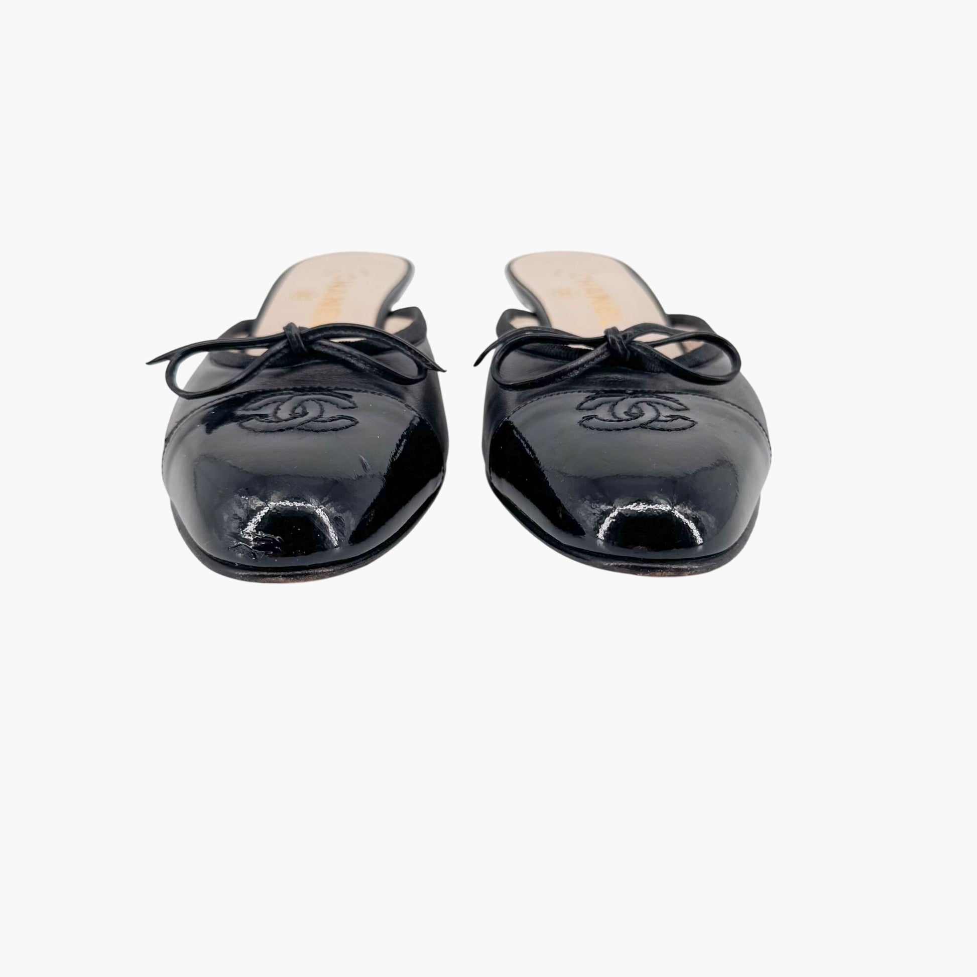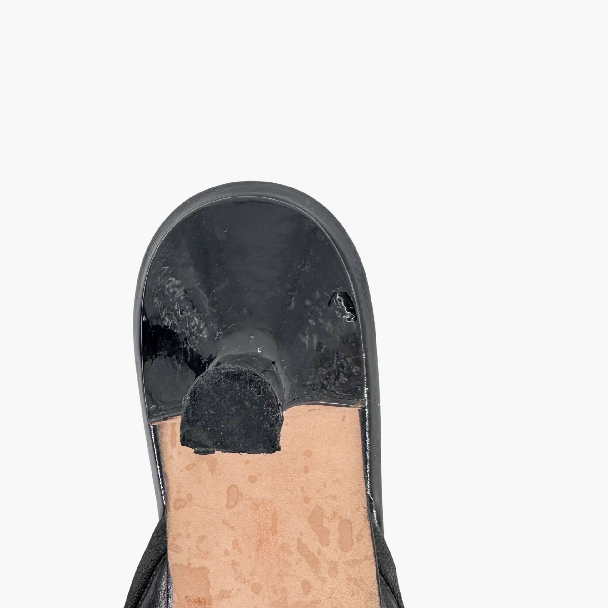 These vintage Chanel mules feature smooth black leather uppers with glossy patent cap toes and a subtle CC logo detail. The low 1.5-inch kitten heel and slip-on silhouette give them a classic profile that transitions seamlessly from polished daywear to elegant evening looks.