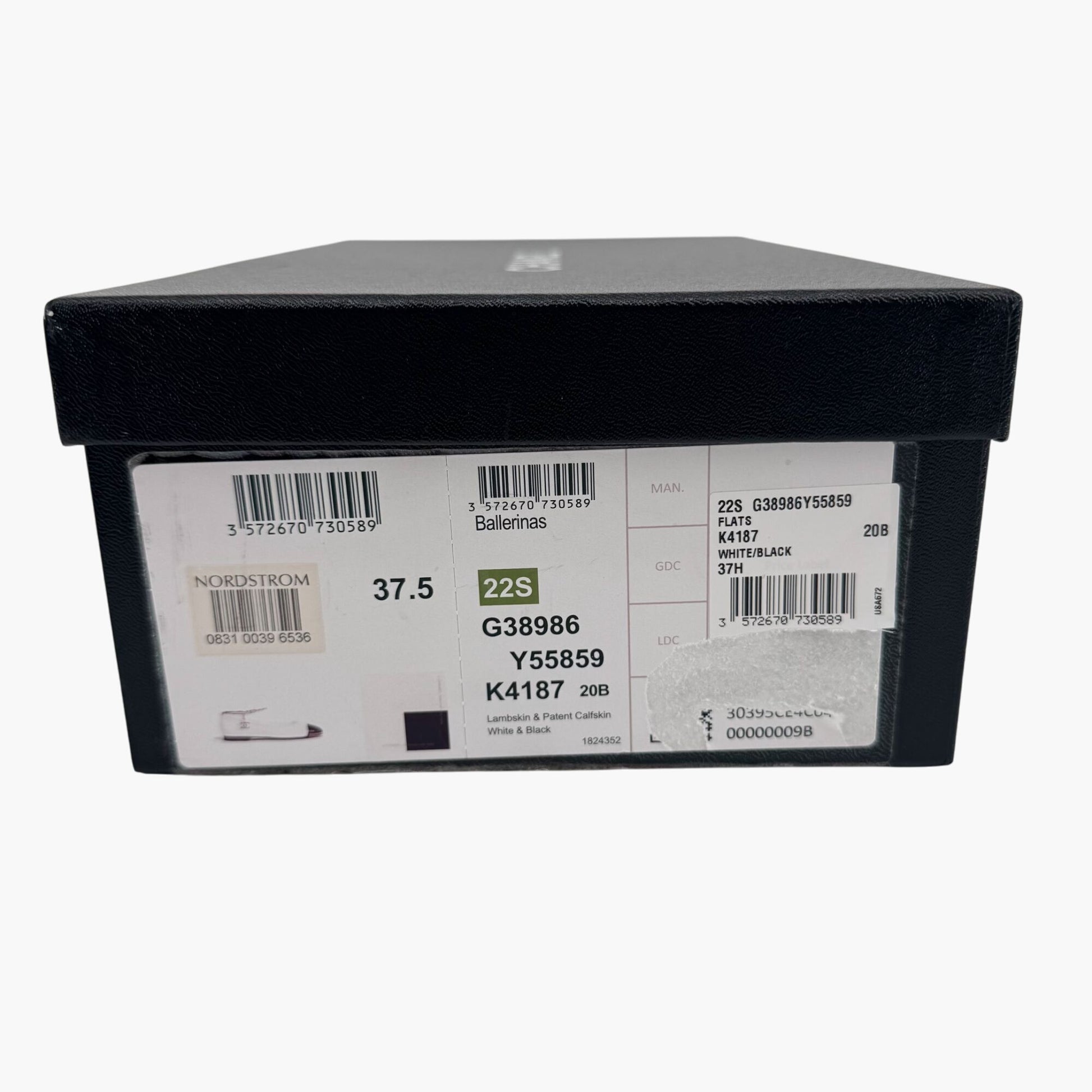 These Chanel Camellia ballet flats feature white lambskin leather uppers with glossy black patent cap toes. Designed with quilted leather footbeds, gold-tone ankle chains adorned with CC and camellia charms, and flat heels, they bring an elegant two-tone finish with signature Chanel detailing.