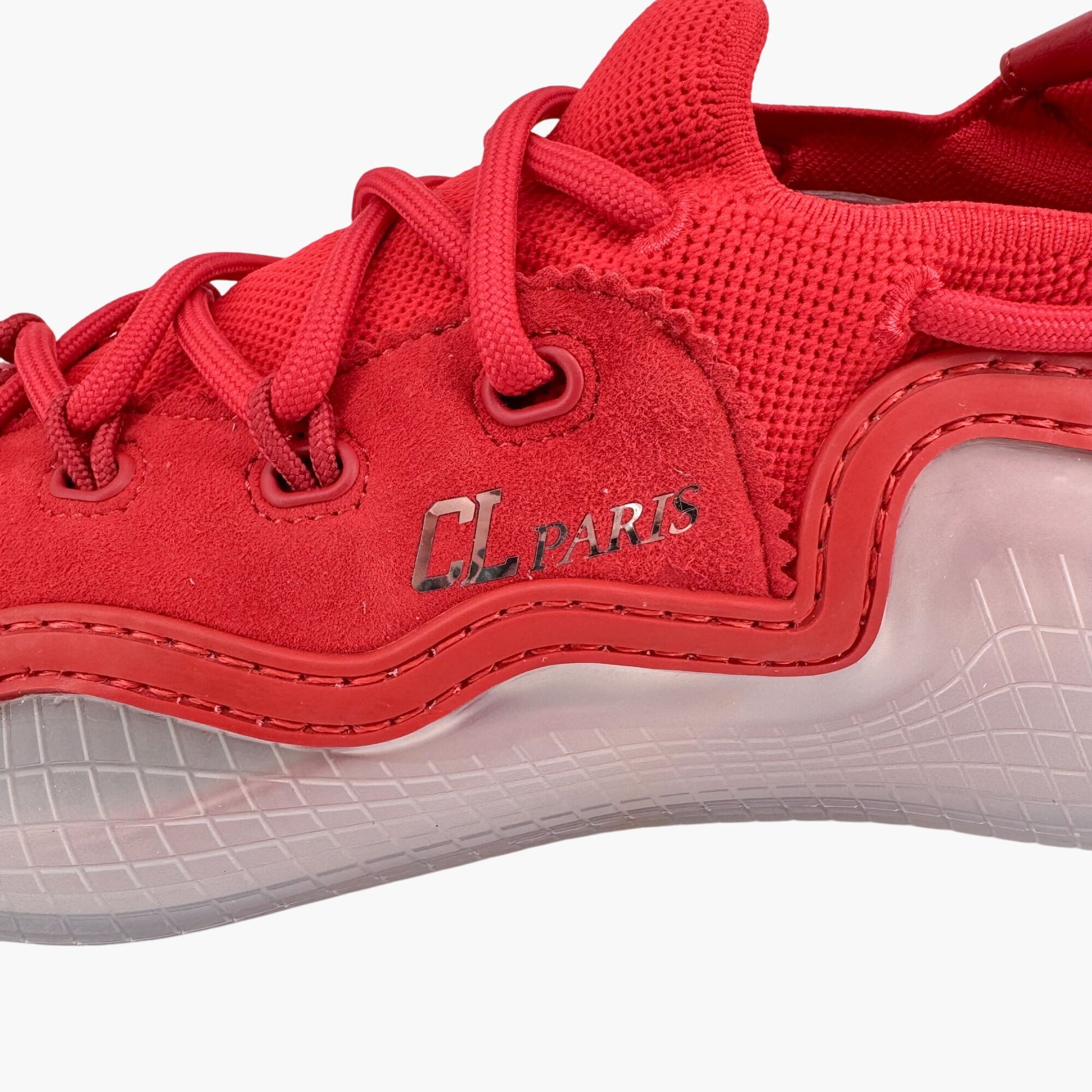 These Christian Louboutin Arpoador sneakers blend bold streetwear edge with luxury craftsmanship. The low-top silhouette features a mix of soft red suede and sporty fabric, finished with a stretchy collar and adjustable drawstring closure for a modern, sock-like fit. A metallic logo and tonal spike embellishments at the heel add signature Louboutin attitude, while the transparent rubber midsole and iconic red bottom ground the look. Ideal for off-duty days, city strolls, or travel outfits that don’t compromise on style.