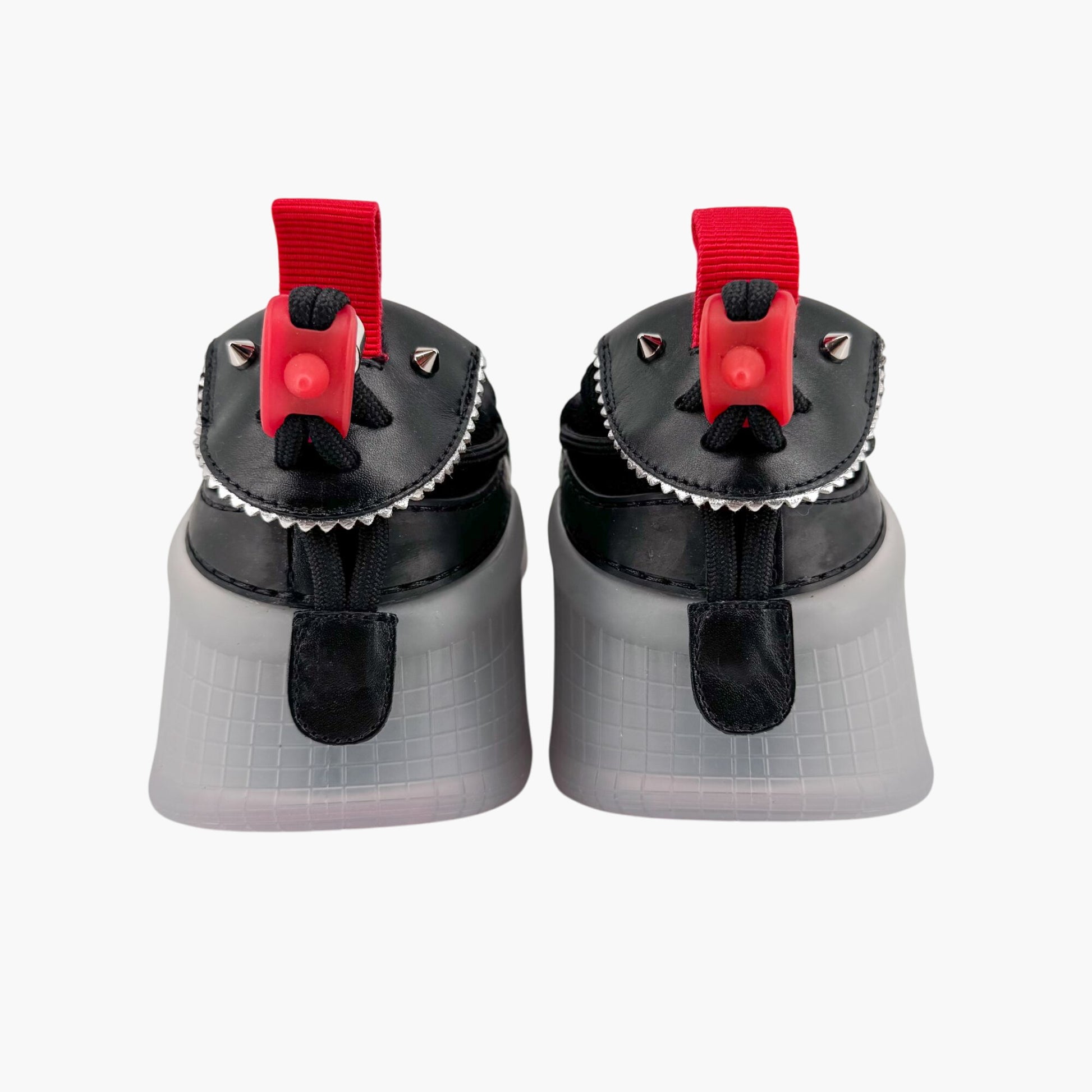 These Christian Louboutin Arpoador sneakers feature black suede and mesh uppers in a sock-style silhouette. Designed with lace-up fronts, drawstring closures at the heel, and spike accents, they’re finished with transparent rubber midsoles and the brand’s signature red outsoles for a bold statement look.