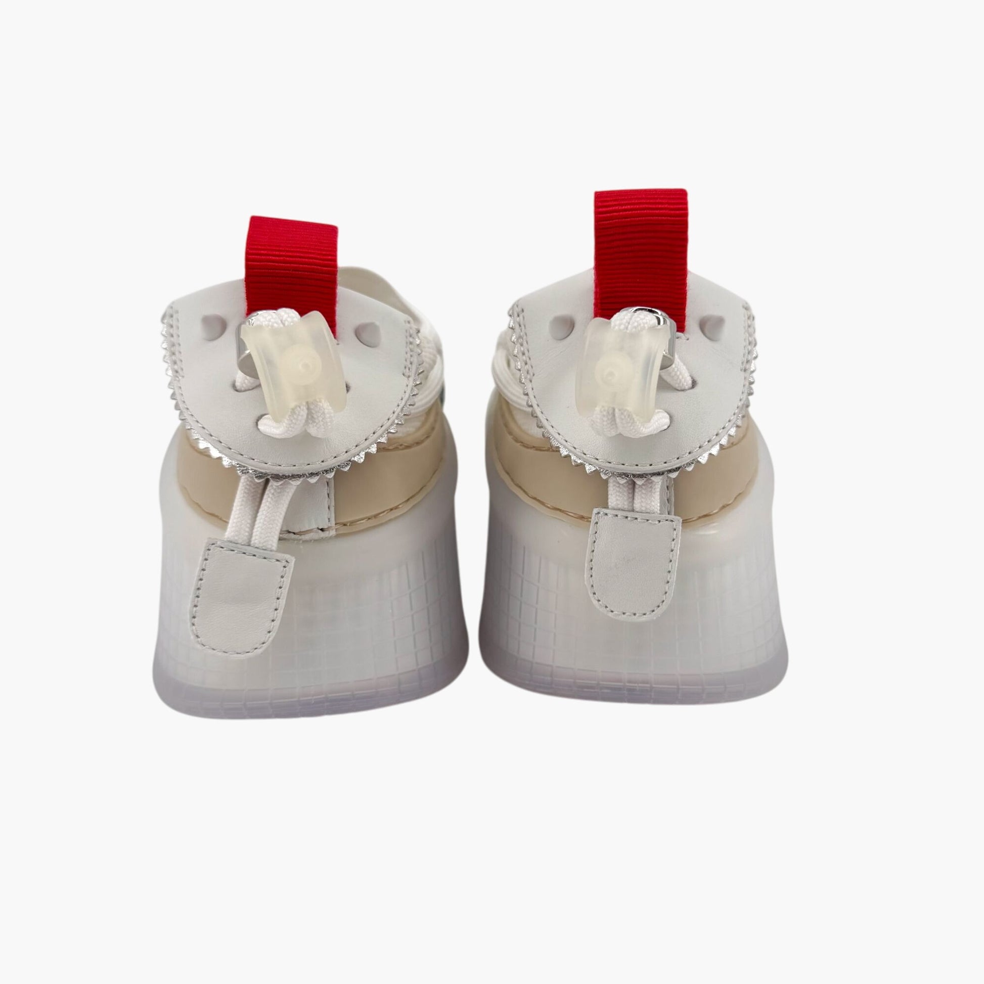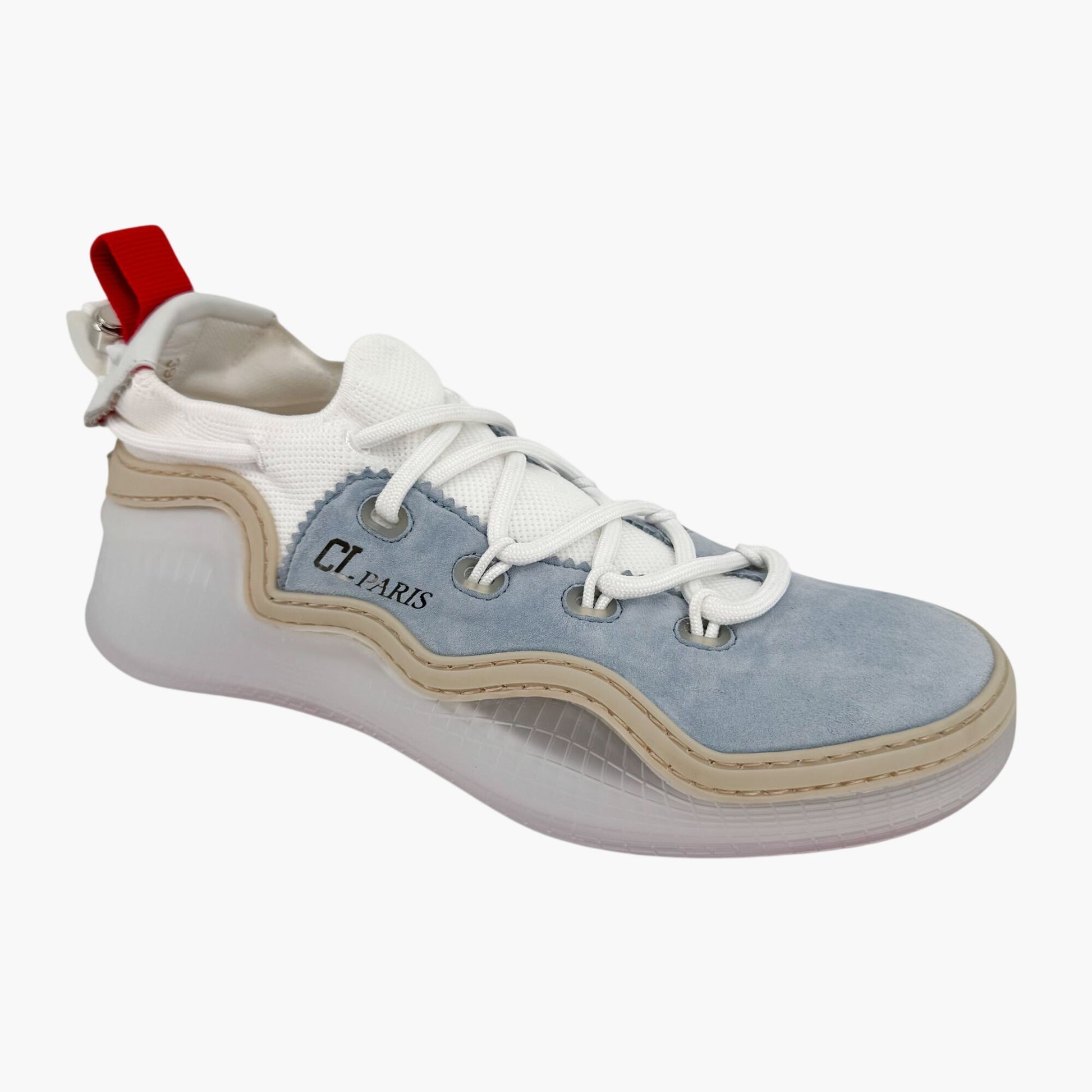 These Christian Louboutin Arpoador sneakers feature light blue suede uppers with a sock-style silhouette, lace-up front, and drawstring closure at the heel. Finished with spike accents, a transparent rubber midsole, and the brand’s signature red outsole, they deliver bold designer edge with sporty comfort.
