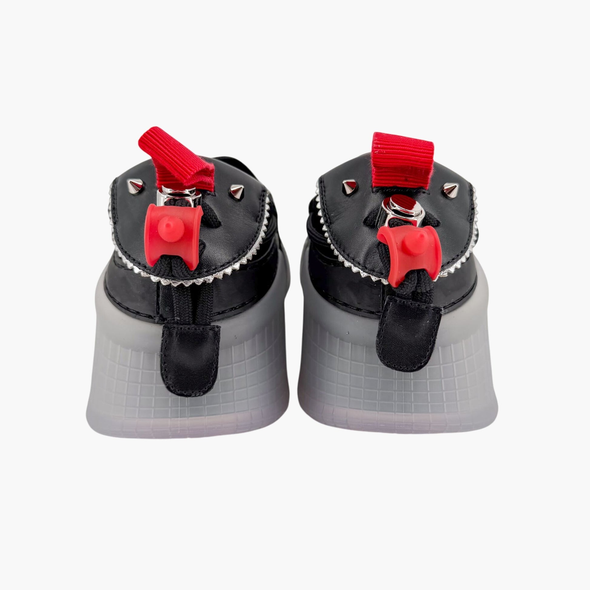 These Christian Louboutin Arpoador Donna sneakers feature black suede uppers with lace-up fronts, mesh tongues, and adjustable drawstring closures at the heels. Designed in a low-top sock-style silhouette with spike accents and CL Paris logo details, they’re finished with transparent rubber midsoles, leather footbeds, and signature red rubber outsoles.