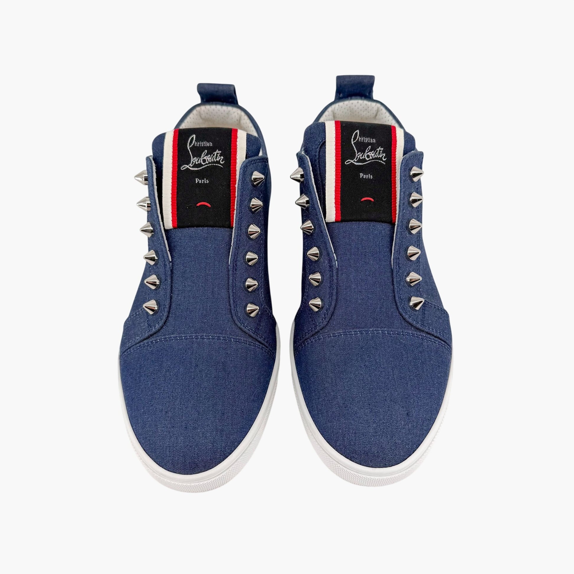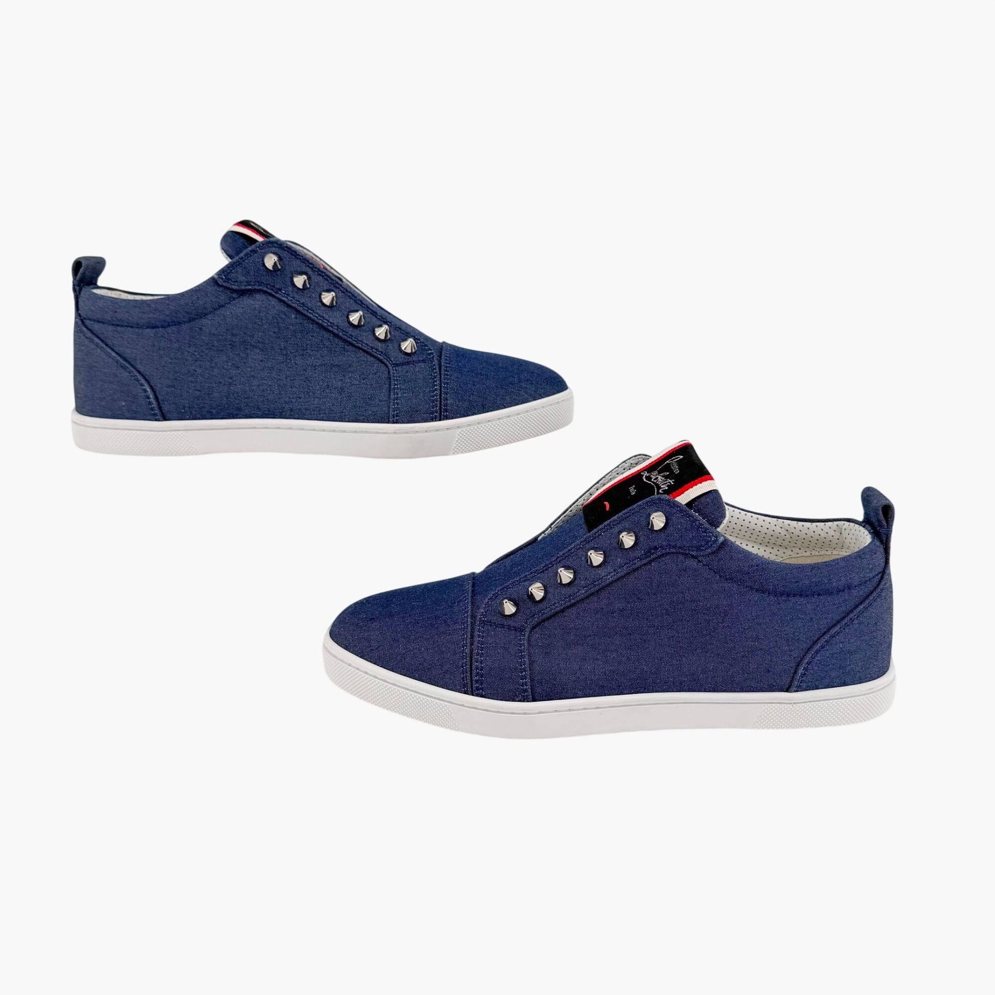 These Christian Louboutin F.A.V. (Fique A Vontade) slip-on sneakers feature a dark blue denim chambray upper accented with signature spike details and a structured cap toe. Designed with a round toe silhouette, embroidered logo tongue detail, leather footbed and lining, and flat rubber outsole with iconic red bottoms, this casual luxury sneaker blends comfort with bold edge. Ideal for everyday wear, travel, street style outfits, and elevated casual looks.