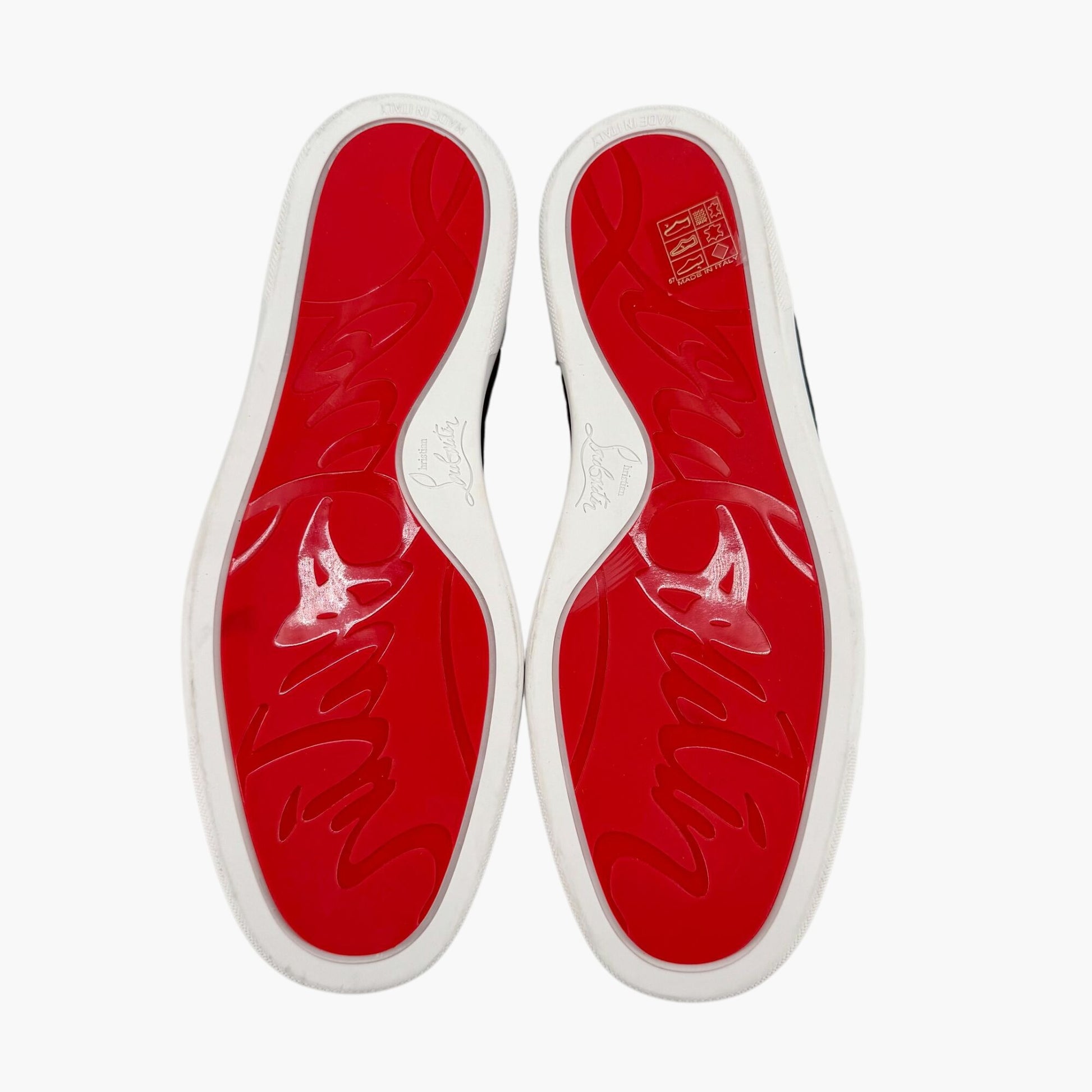 These Christian Louboutin Louis Orlato high-top sneakers feature black mesh uppers with pink suede trim, black patent cap toes, and tonal laces. With their iconic red soles and sporty silhouette, they’re a bold, breathable option for elevated everyday wear.