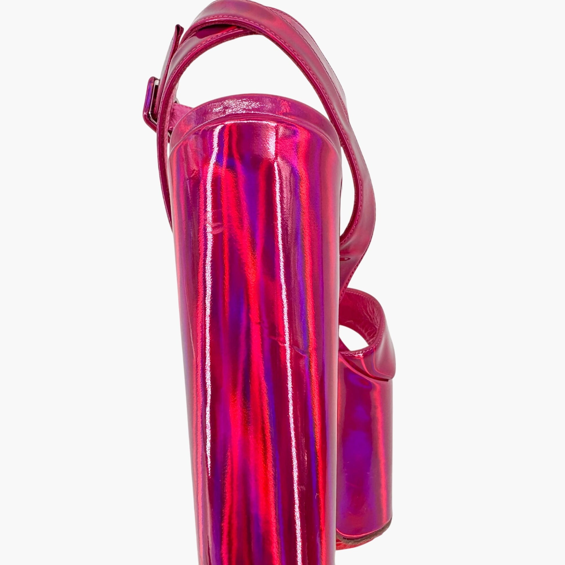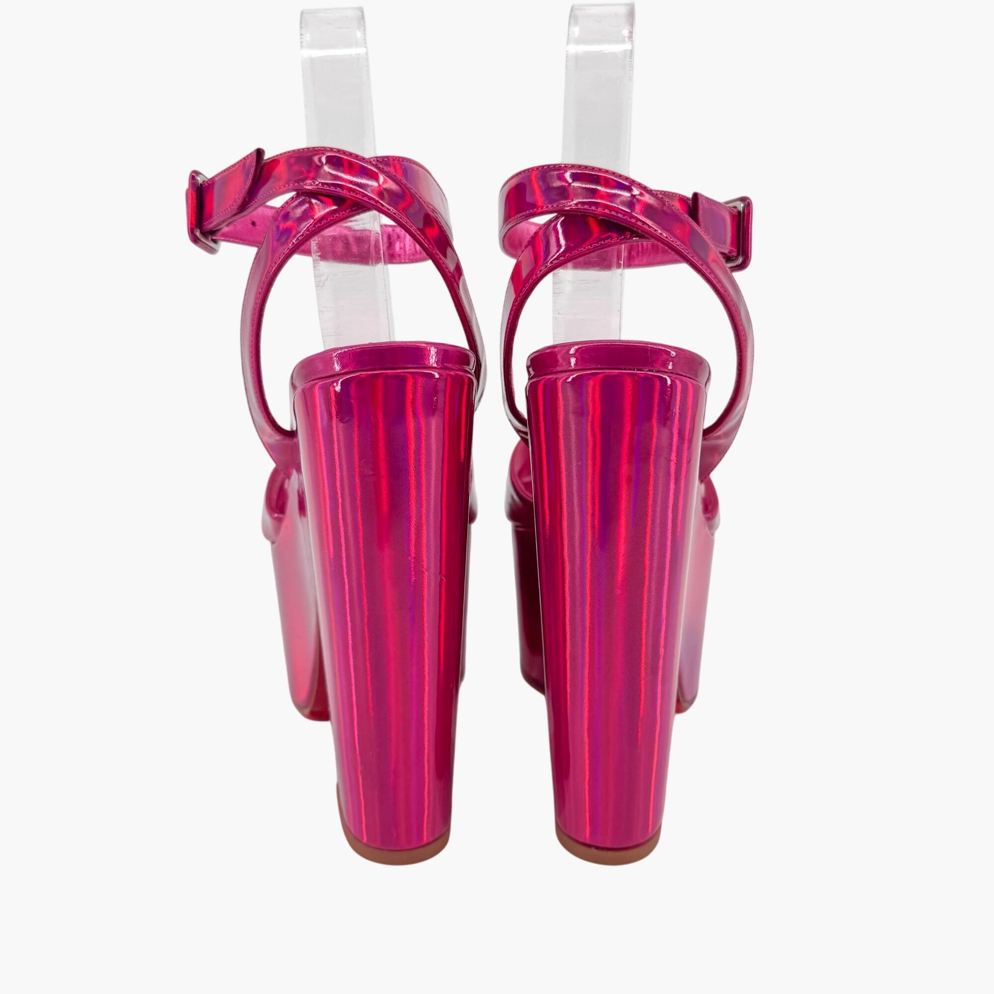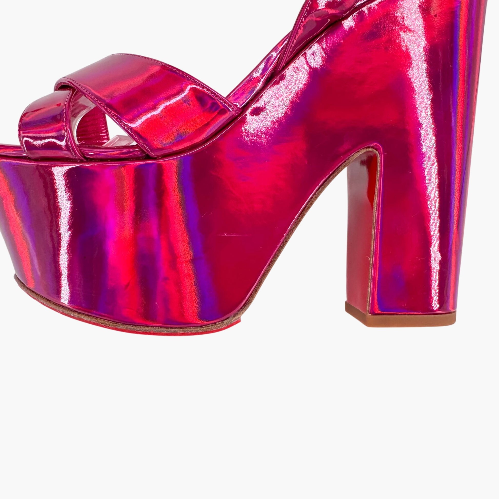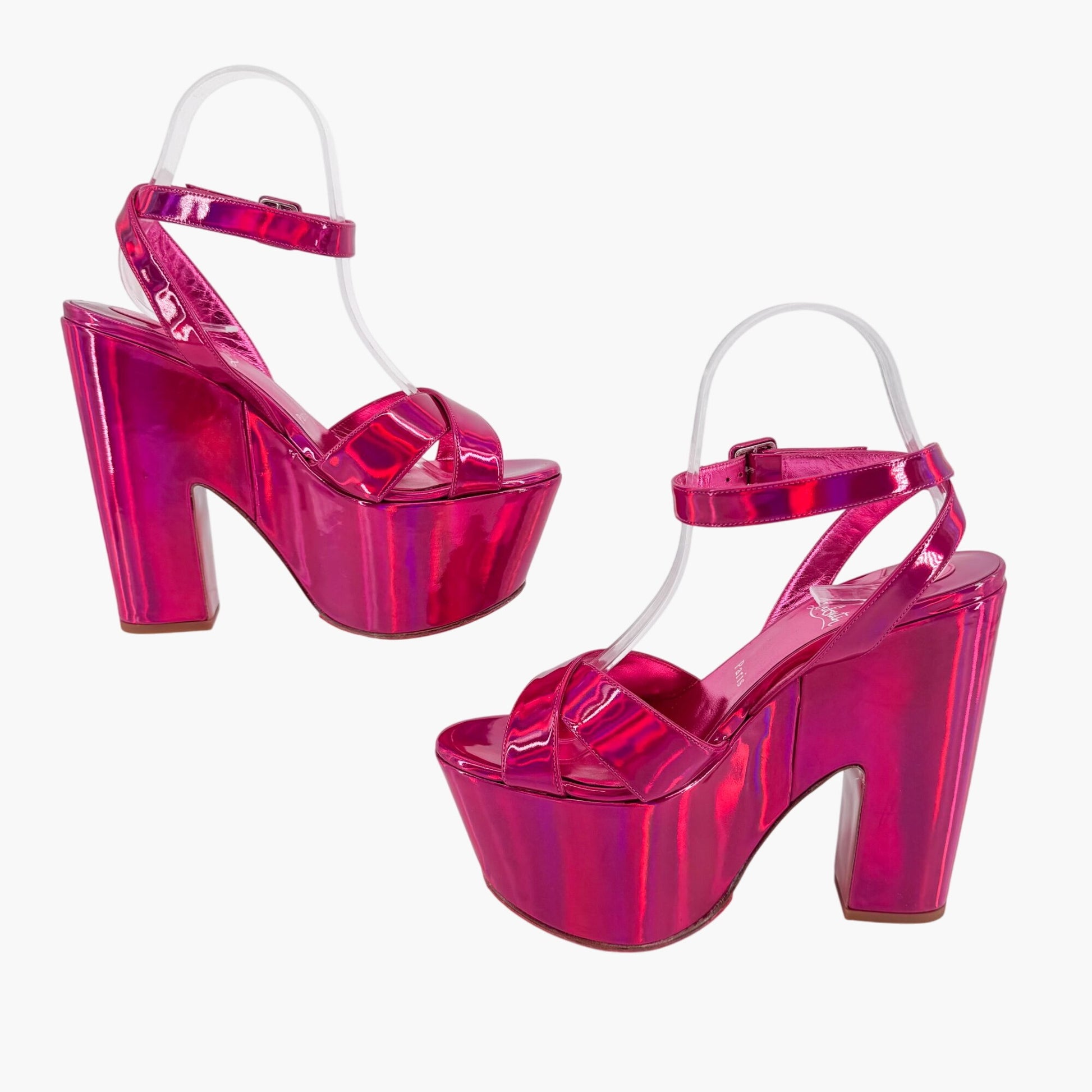 These Christian Louboutin Superyaz 160 platform sandals feature iridescent pink patent leather uppers with cross straps and open almond toes. Designed with ankle straps, adjustable buckle closures, chunky block heels, and finished with the brand’s signature red soles, they deliver bold height and glamorous shine.