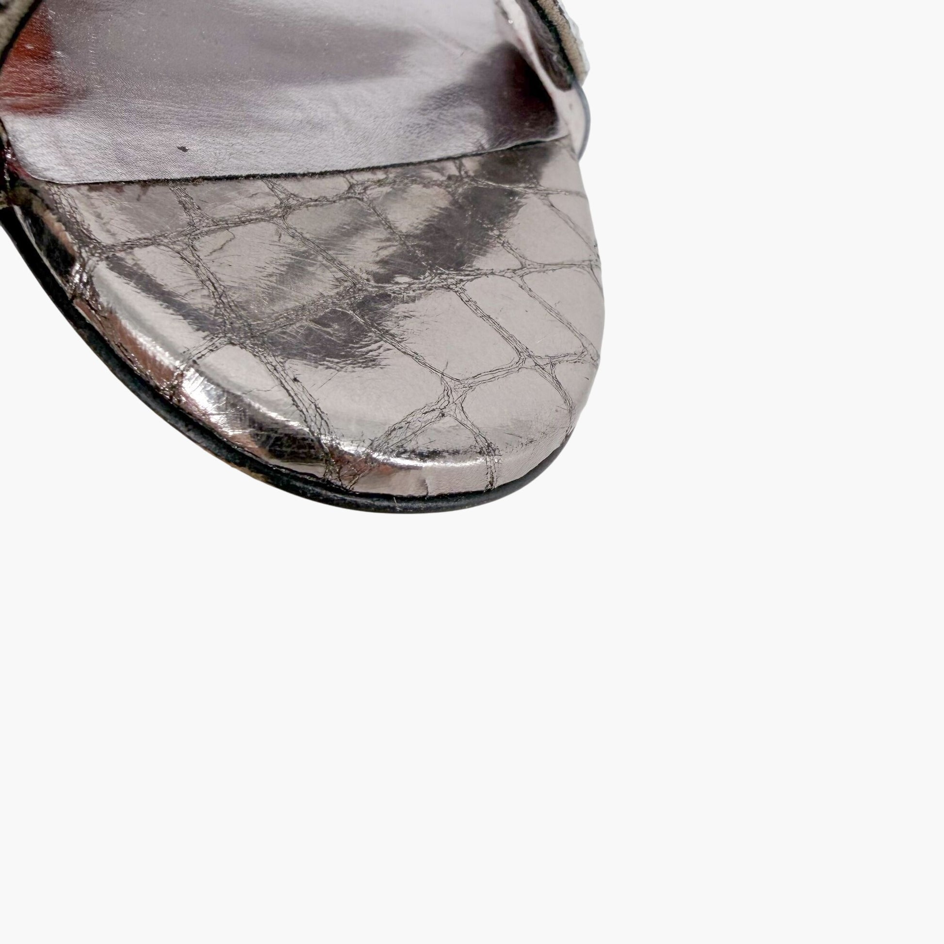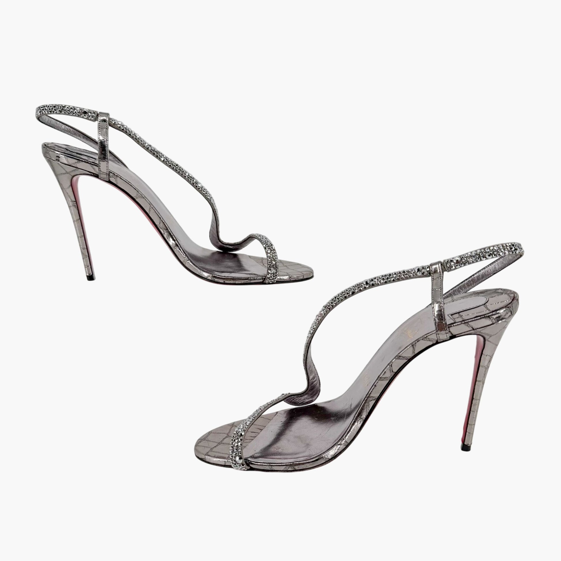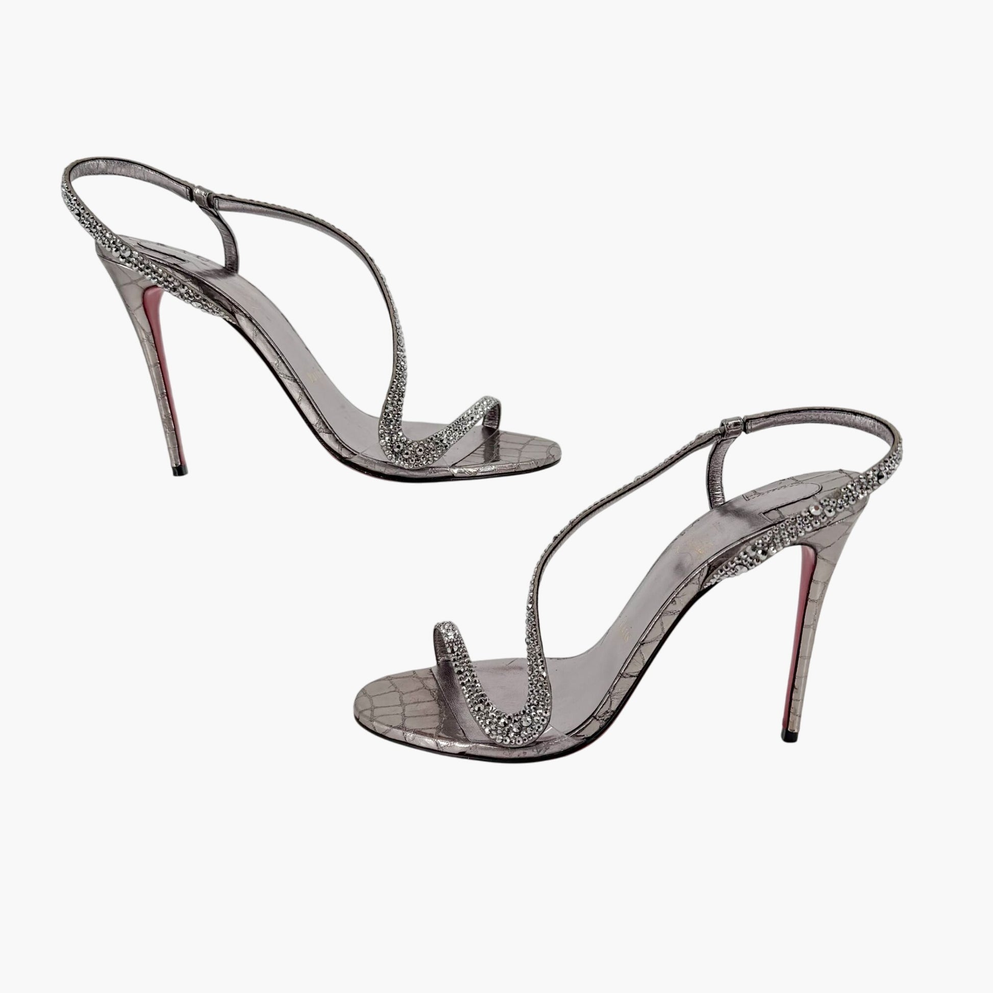 These Christian Louboutin Rosalie Strass 100 heels feature chrome silver croc-embossed leather uppers with sparkling crystal-embellished straps and open round toes. Designed with slender stiletto heels and signature red lacquered soles, they bring statement glamour to eveningwear or wedding looks.