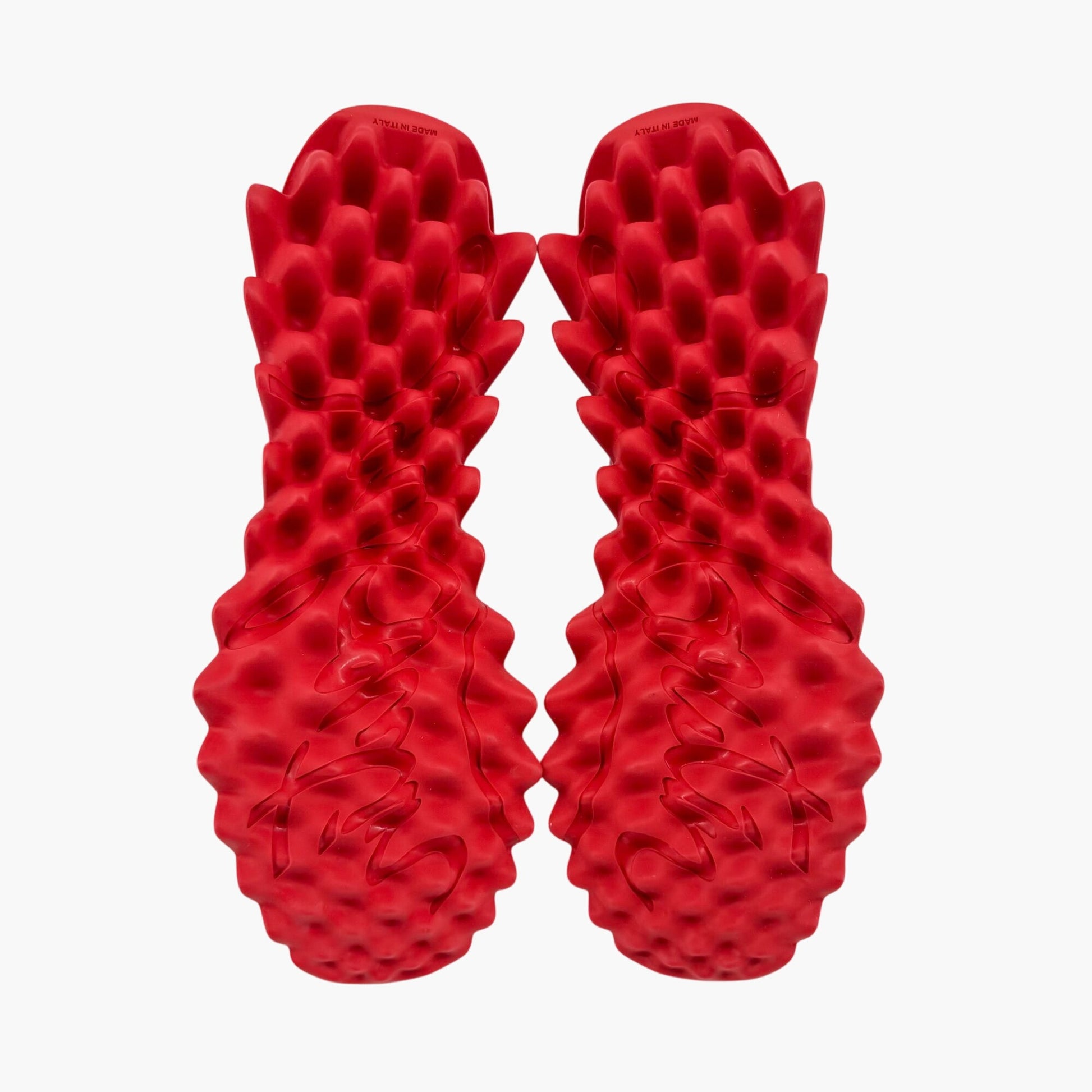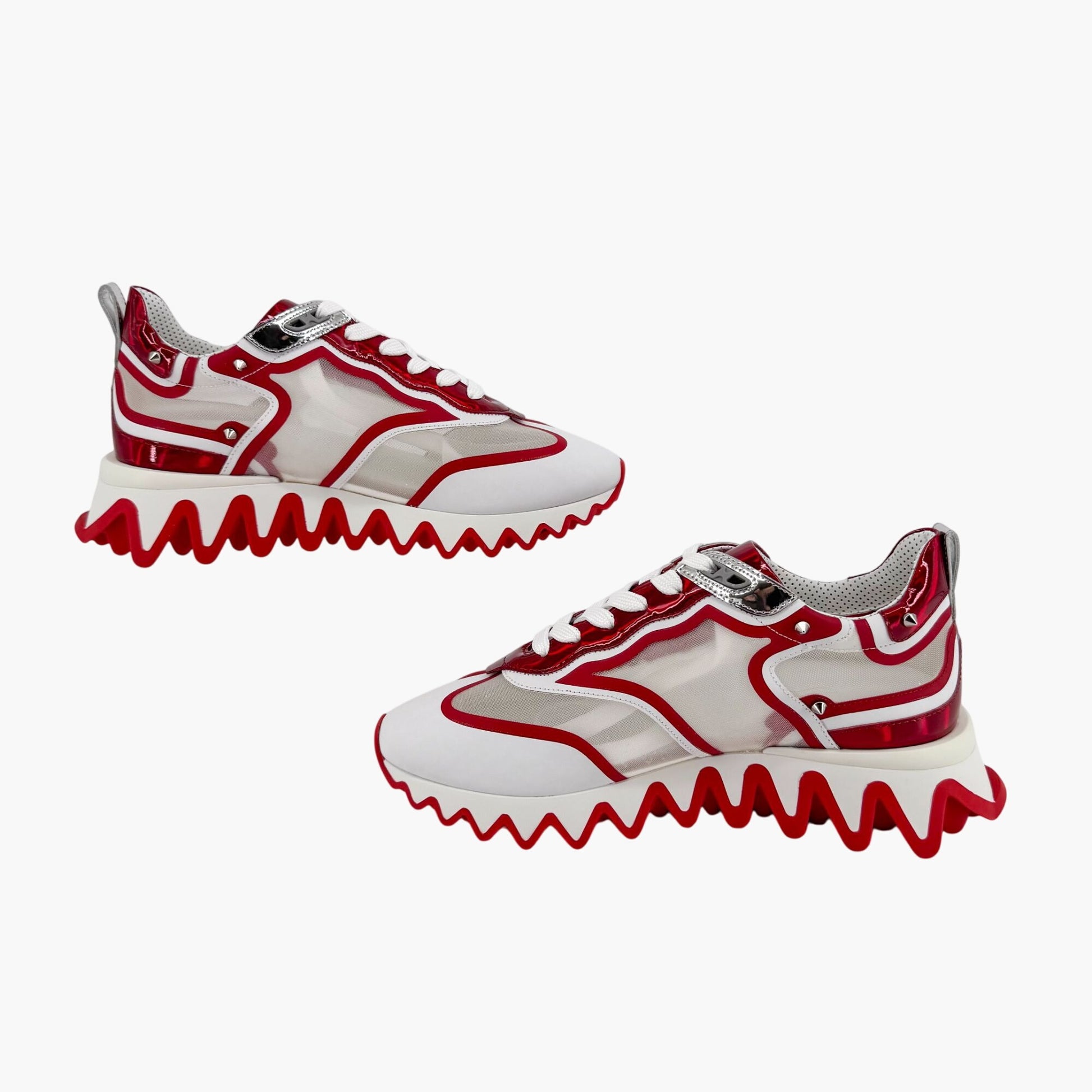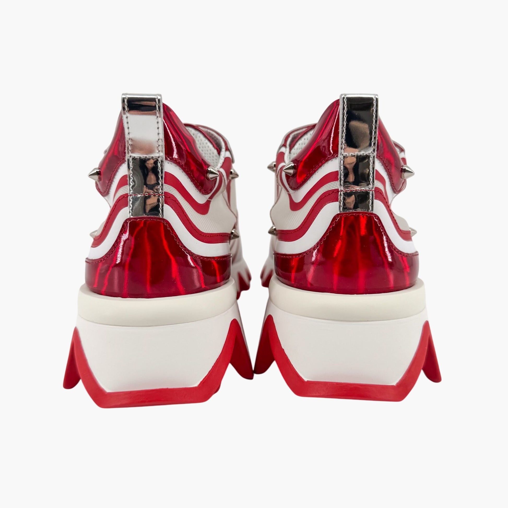 These Christian Louboutin Sharkina sneakers feature a white sheer mesh upper with iridescent red Psychic patent leather accents, silver-tone spikes at the heel, and the brand’s signature red sole. Designed in a low-top silhouette with lace-up closure, leather footbed, and shark tooth outsole, they combine bold detailing with everyday wearability.