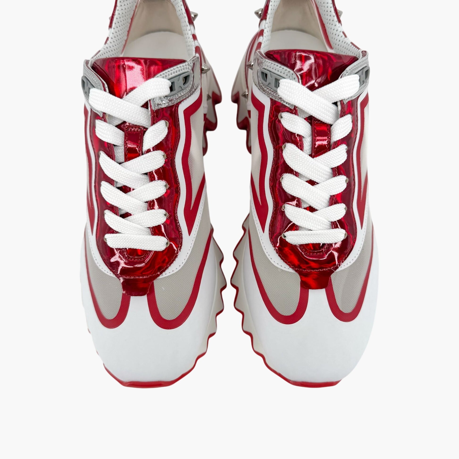 These Christian Louboutin Sharkina sneakers feature white mesh uppers with red and white trim and an iridescent red Psychic patent leather tongue. Designed with lace-up styling, round toes, spike accents, leather footbeds, and shark tooth midsoles, they’re finished with the brand’s signature red rubber outsoles.