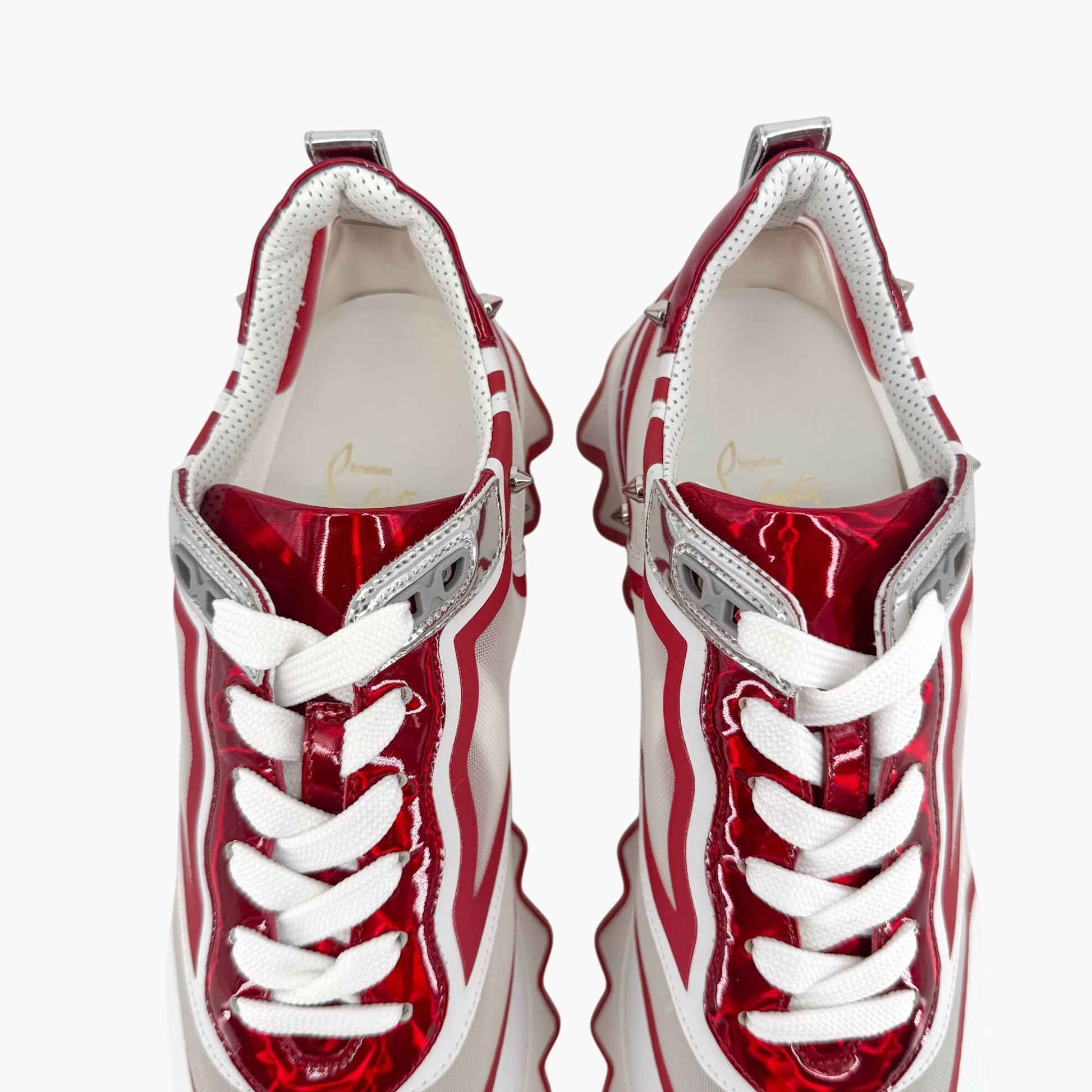 These Christian Louboutin Sharkina sneakers feature sheer white mesh uppers trimmed with iridescent red patent leather and finished with silver-tone spike accents. Designed with a lace-up low-top silhouette, shark midsole, and signature red rubber outsole, they combine bold designer detail with sporty wearability.