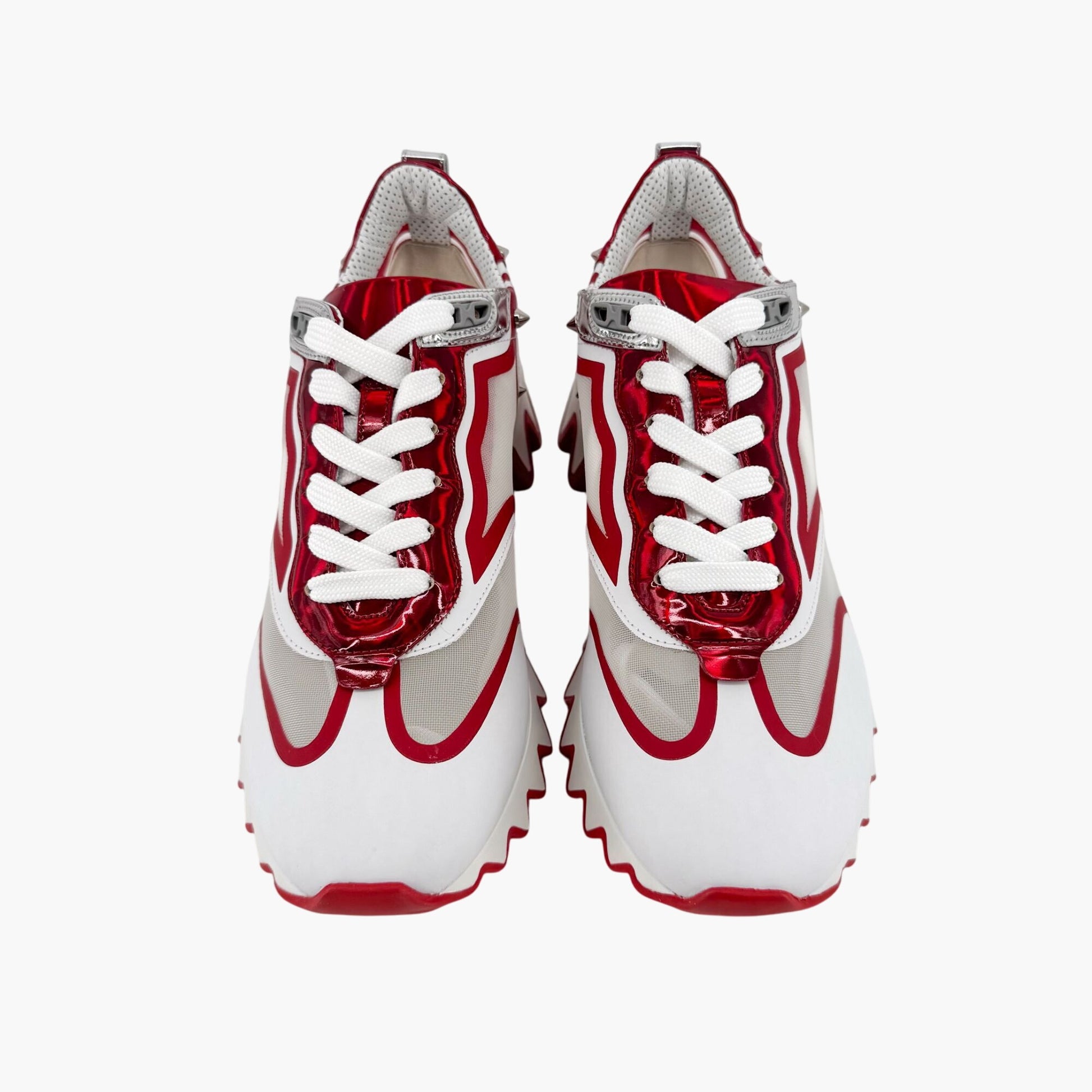 These Christian Louboutin Sharkina sneakers feature sheer white mesh uppers trimmed with iridescent red patent leather and finished with silver-tone spike accents. Designed with a lace-up low-top silhouette, shark midsole, and signature red rubber outsole, they combine bold designer detail with sporty wearability.