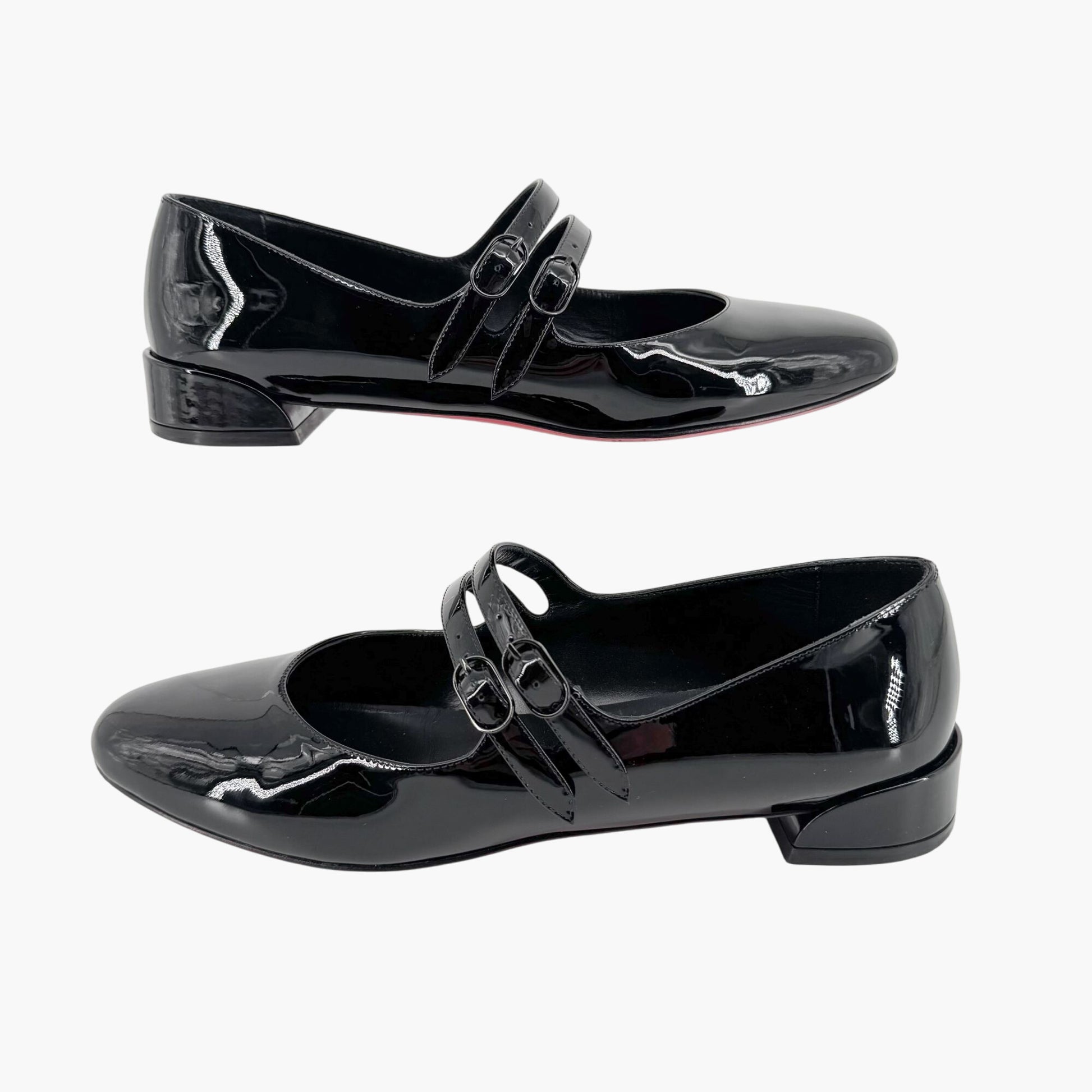 These Christian Louboutin Sweet Jane Flats bring a polished, playful touch to a timeless silhouette. The glossy black leather upper features classic double Mary Jane straps with adjustable buckle closure, combining elegance with a hint of vintage charm. Designed with a round toe and low block heel, these flats offer comfort and sophistication in equal measure. A leather footbed and lining provide a luxe feel, while the signature red sole adds an unmistakable Louboutin finish. Perfect for daytime events, office wear, or adding a refined twist to everyday looks.
