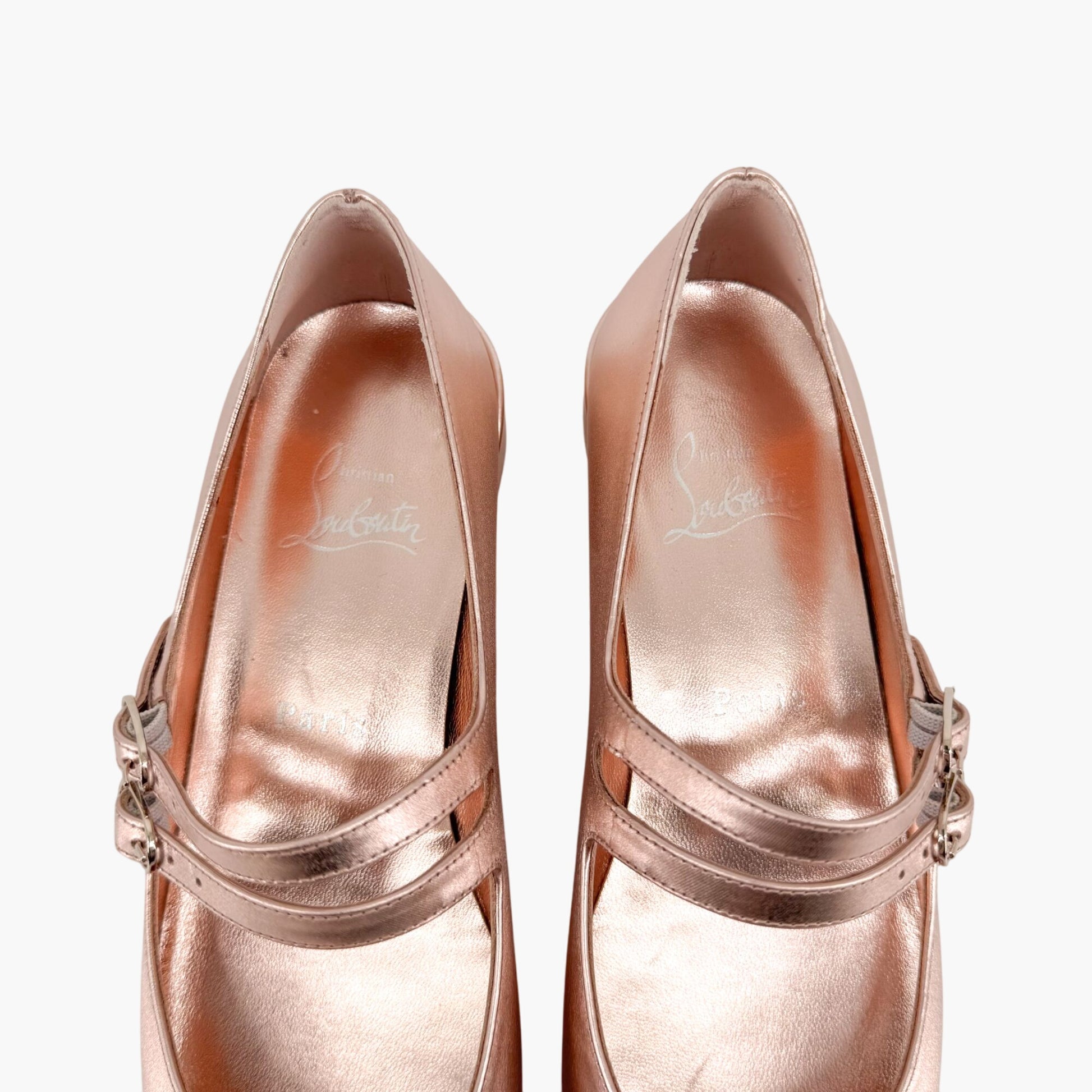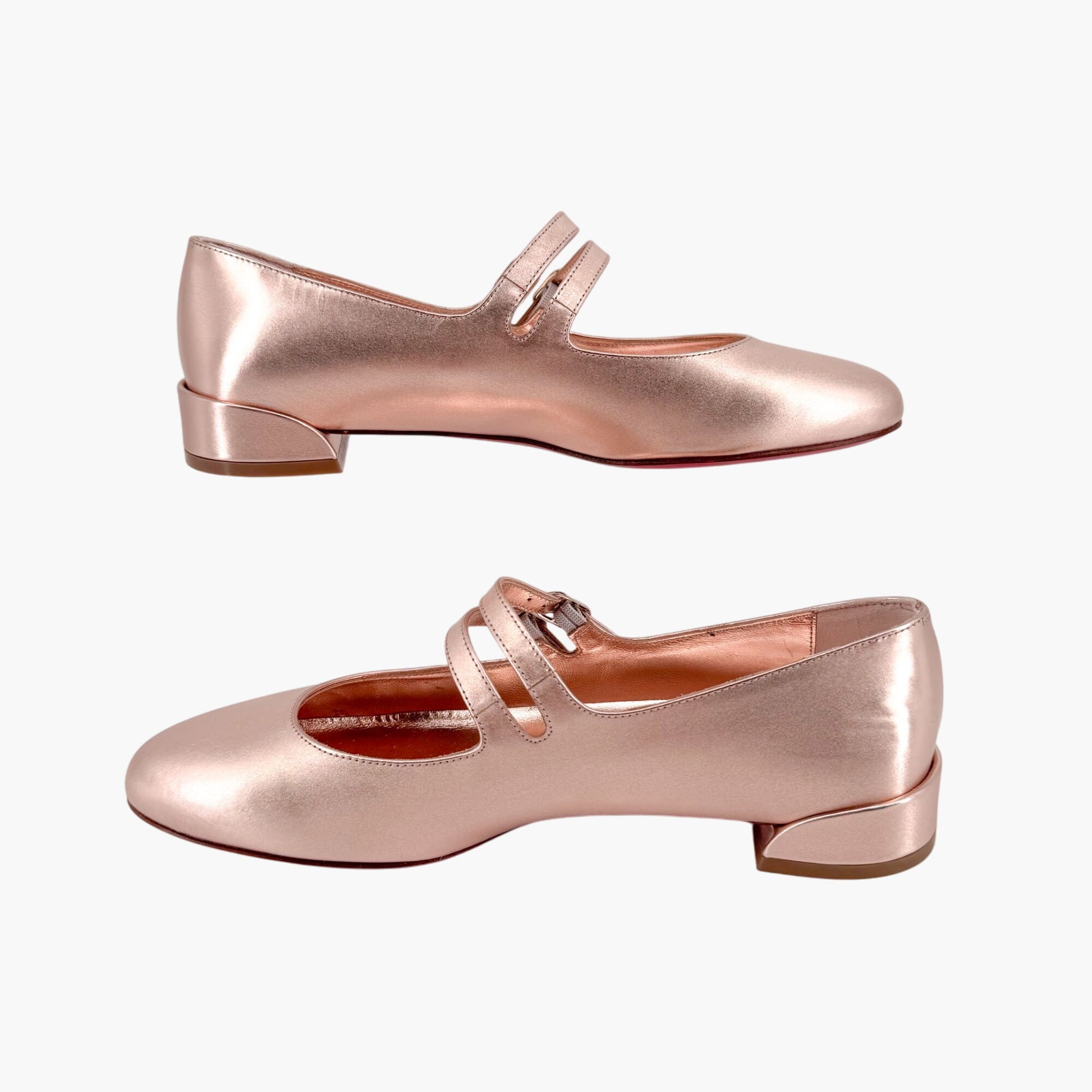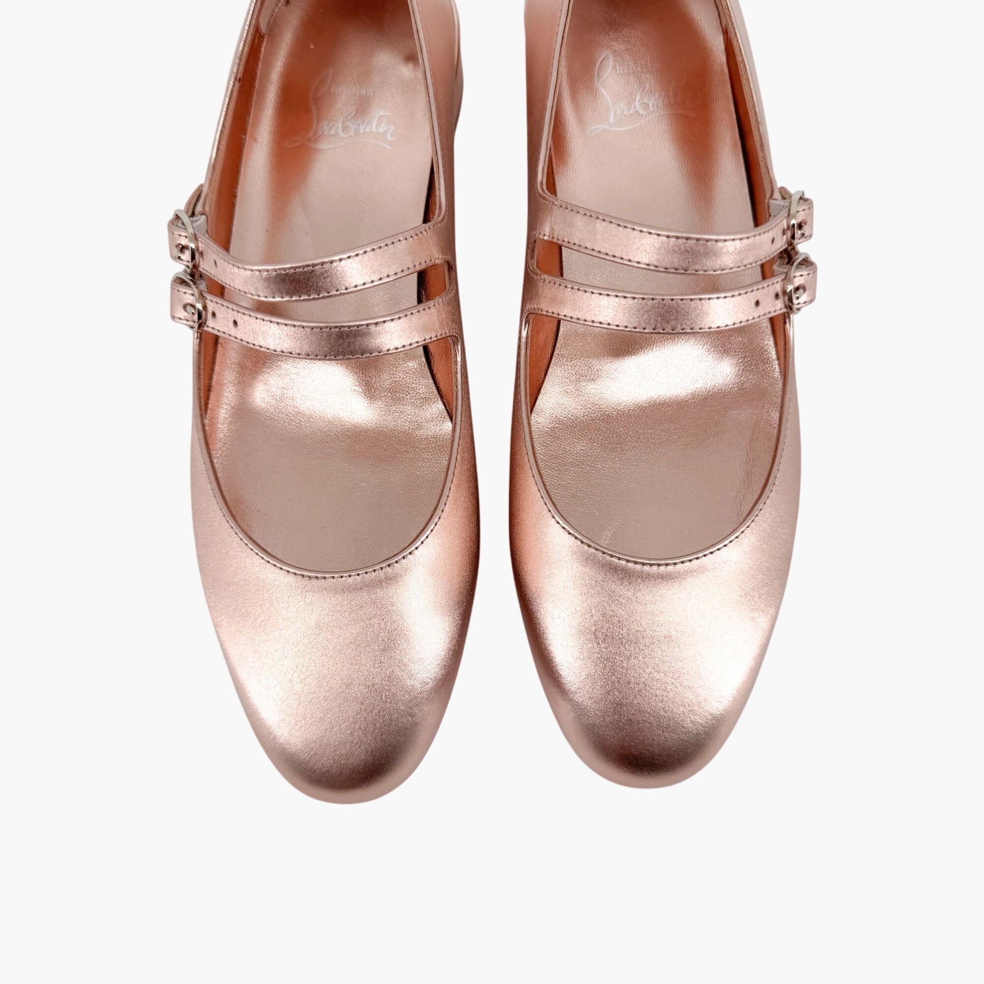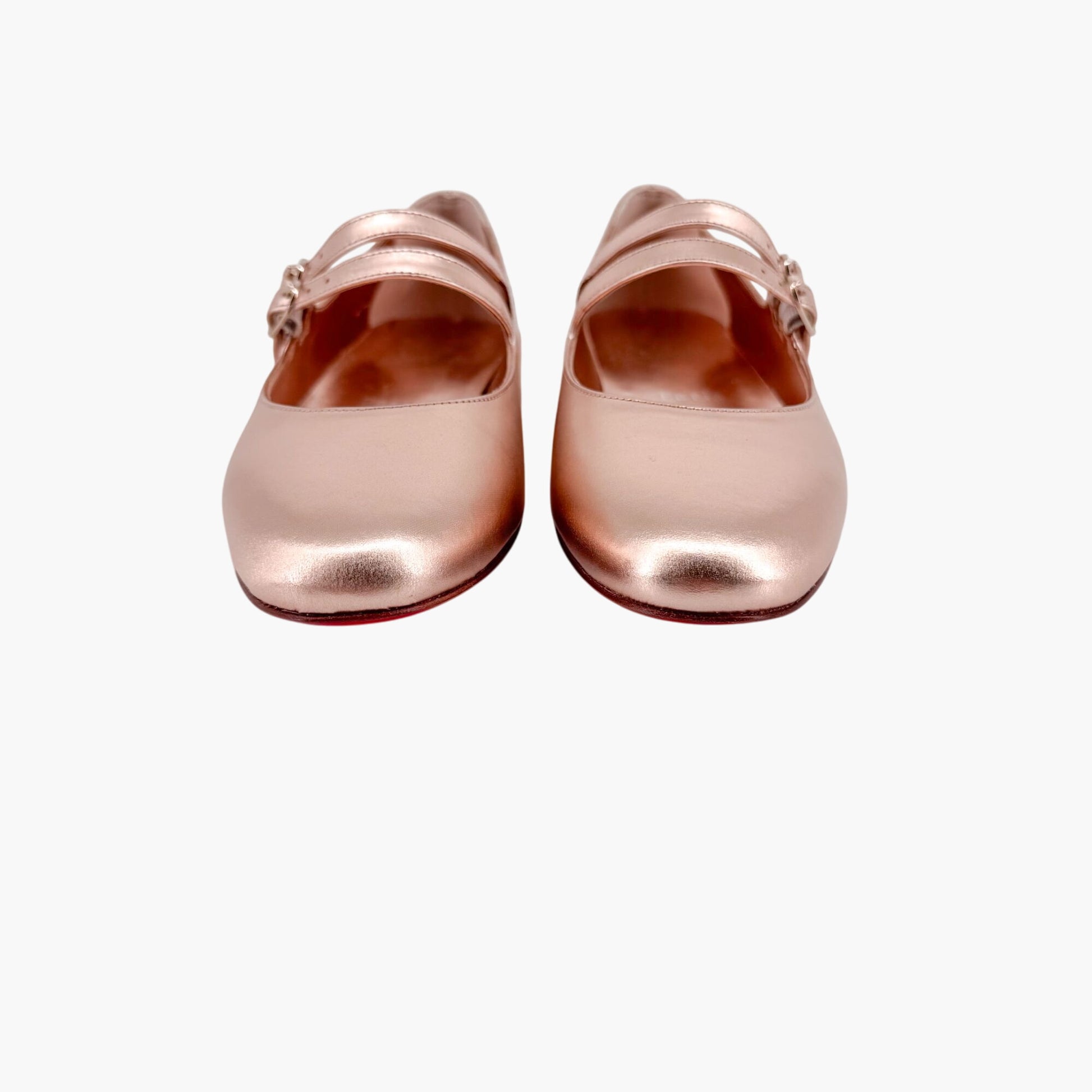 These Christian Louboutin Sweet Jane Flats bring a romantic shimmer to a timeless silhouette. Crafted in a Mary Jane ballet flat style, the metallic rose gold upper features double straps with adjustable buckles for a vintage-style touch. Designed with a classic round toe and low block heel, these flats offer elegance with everyday comfort. The leather footbed and lining provide a luxurious feel, while the signature red sole and leather outsole complete the look. Perfect for weddings, special occasions, or adding a soft glow to polished daytime outfits.