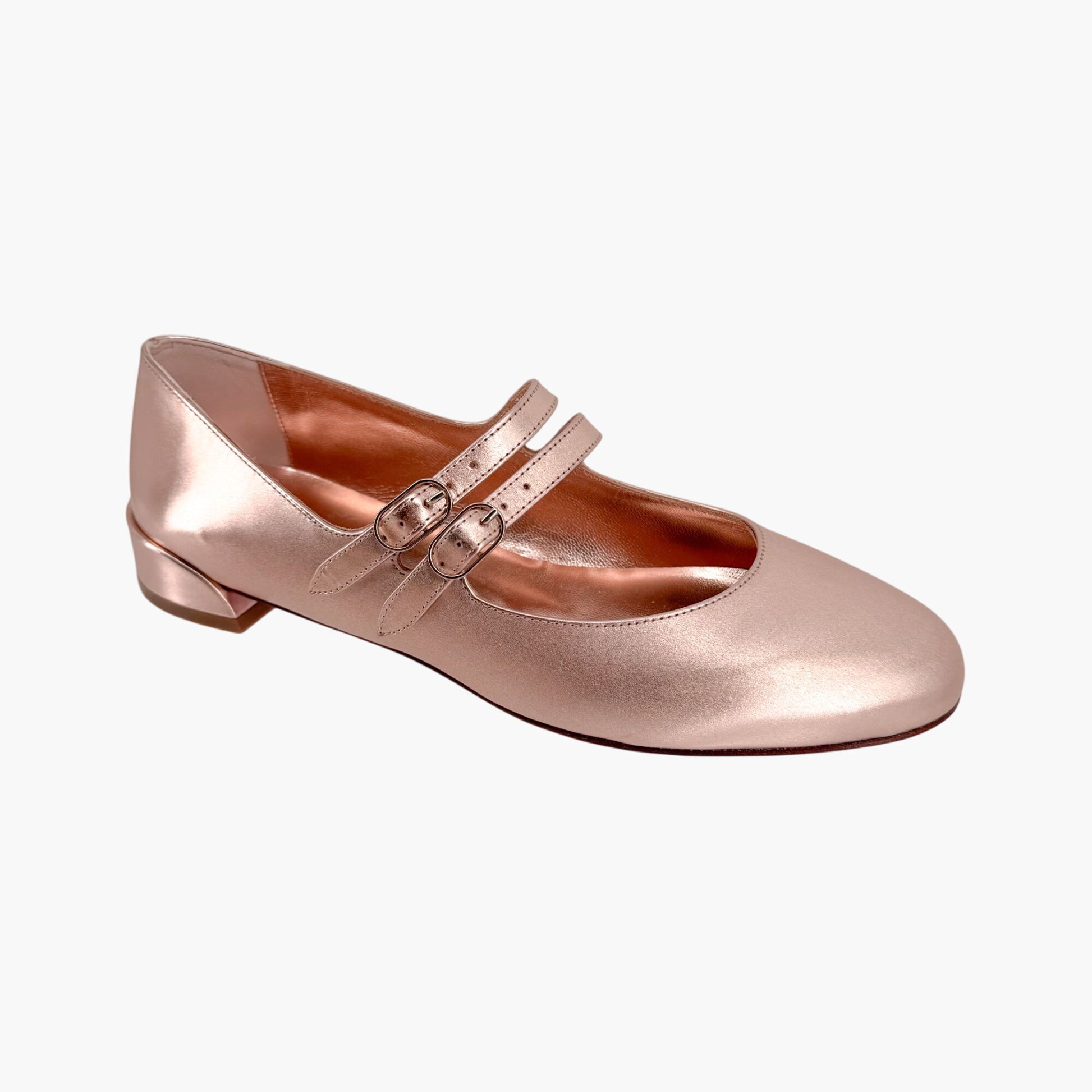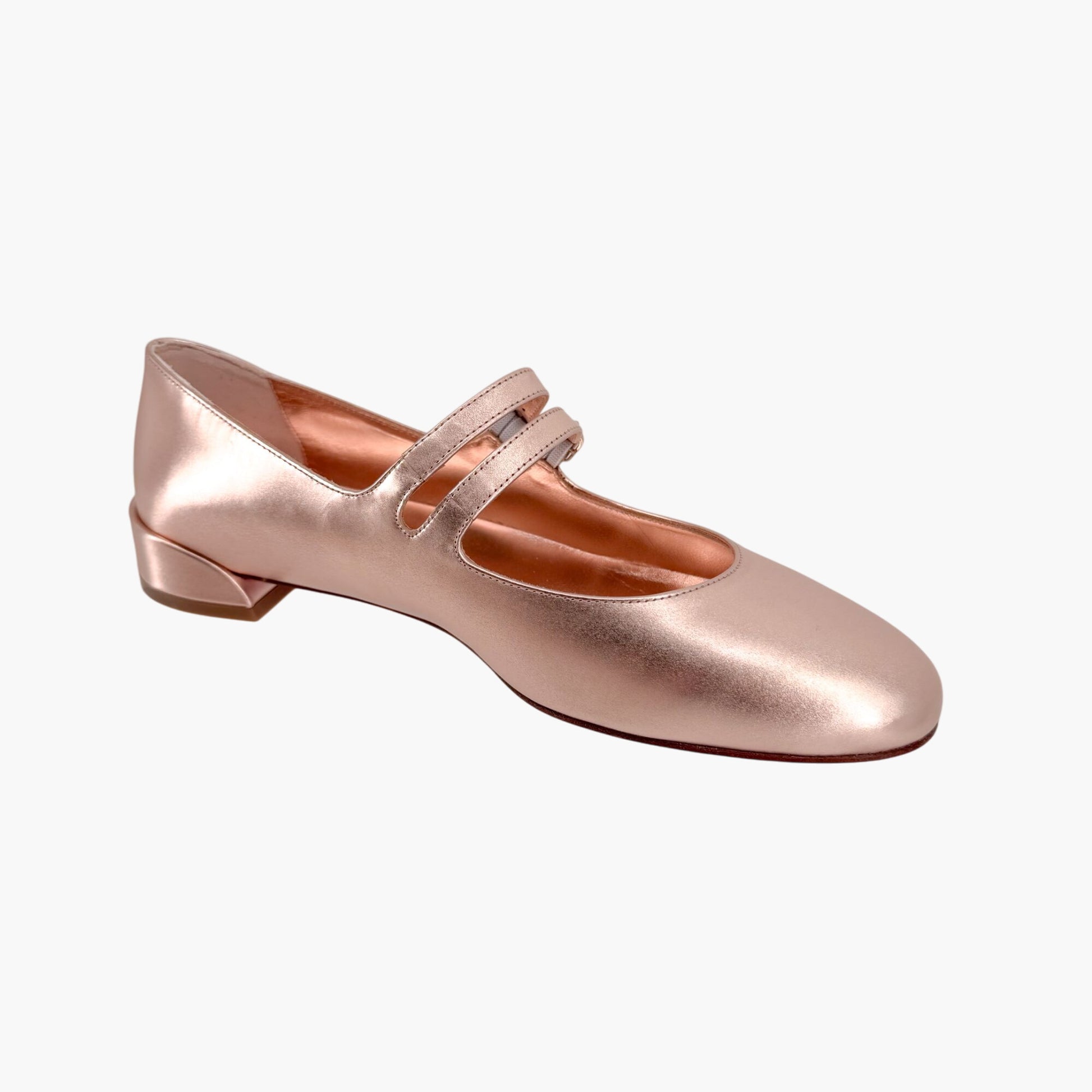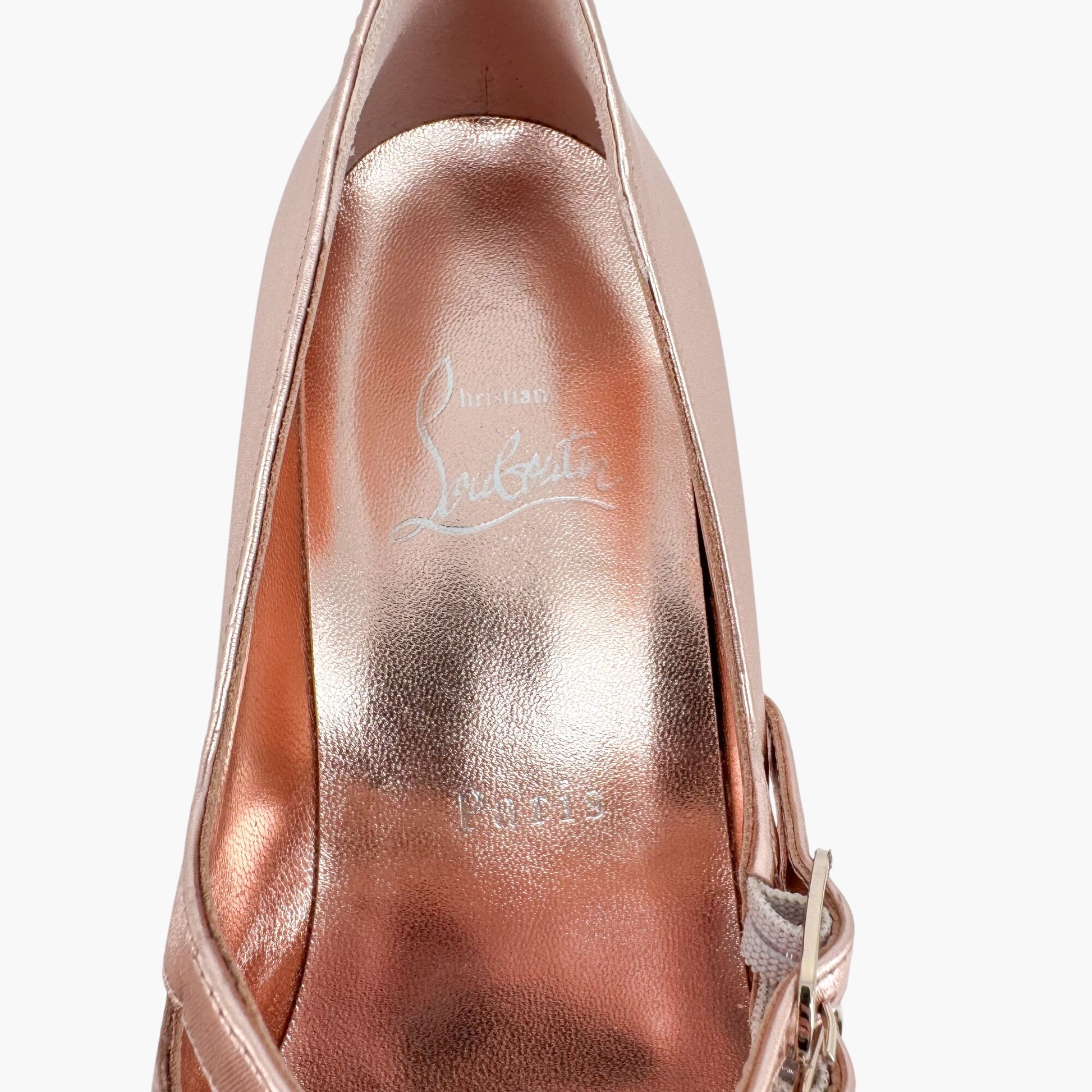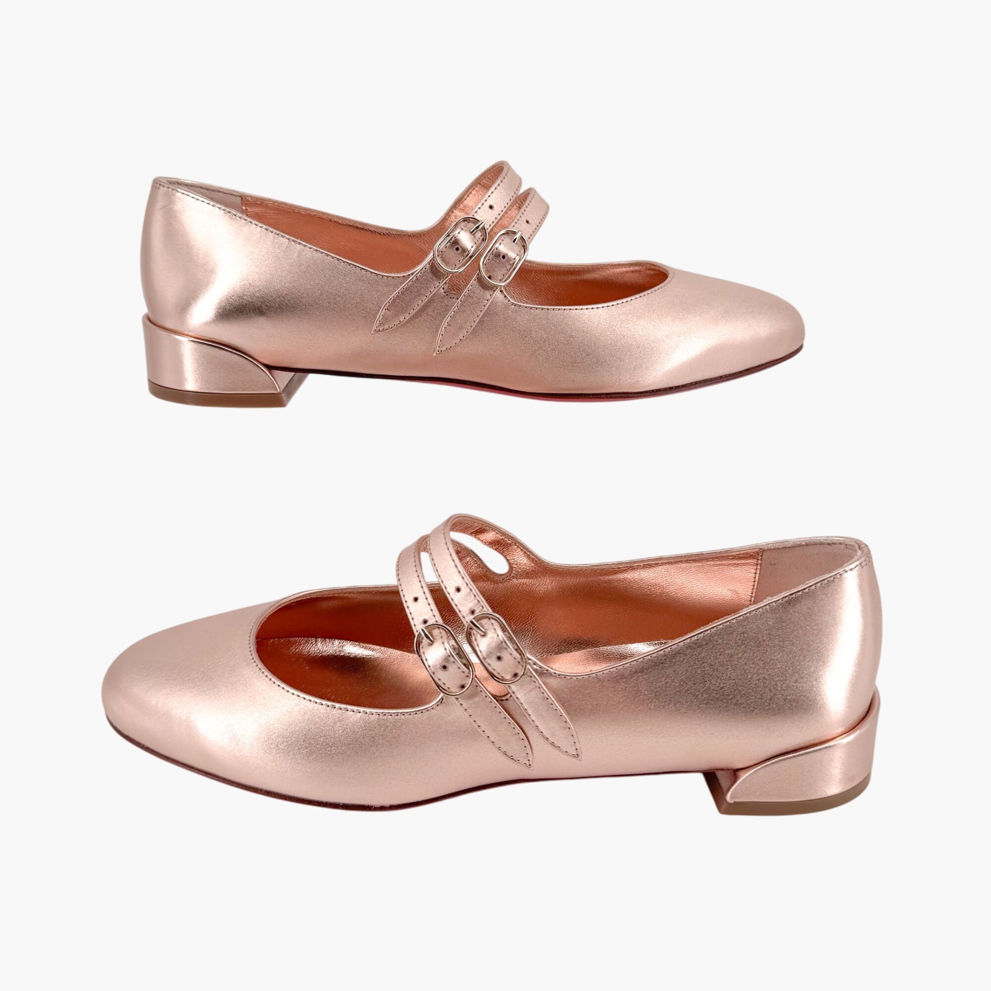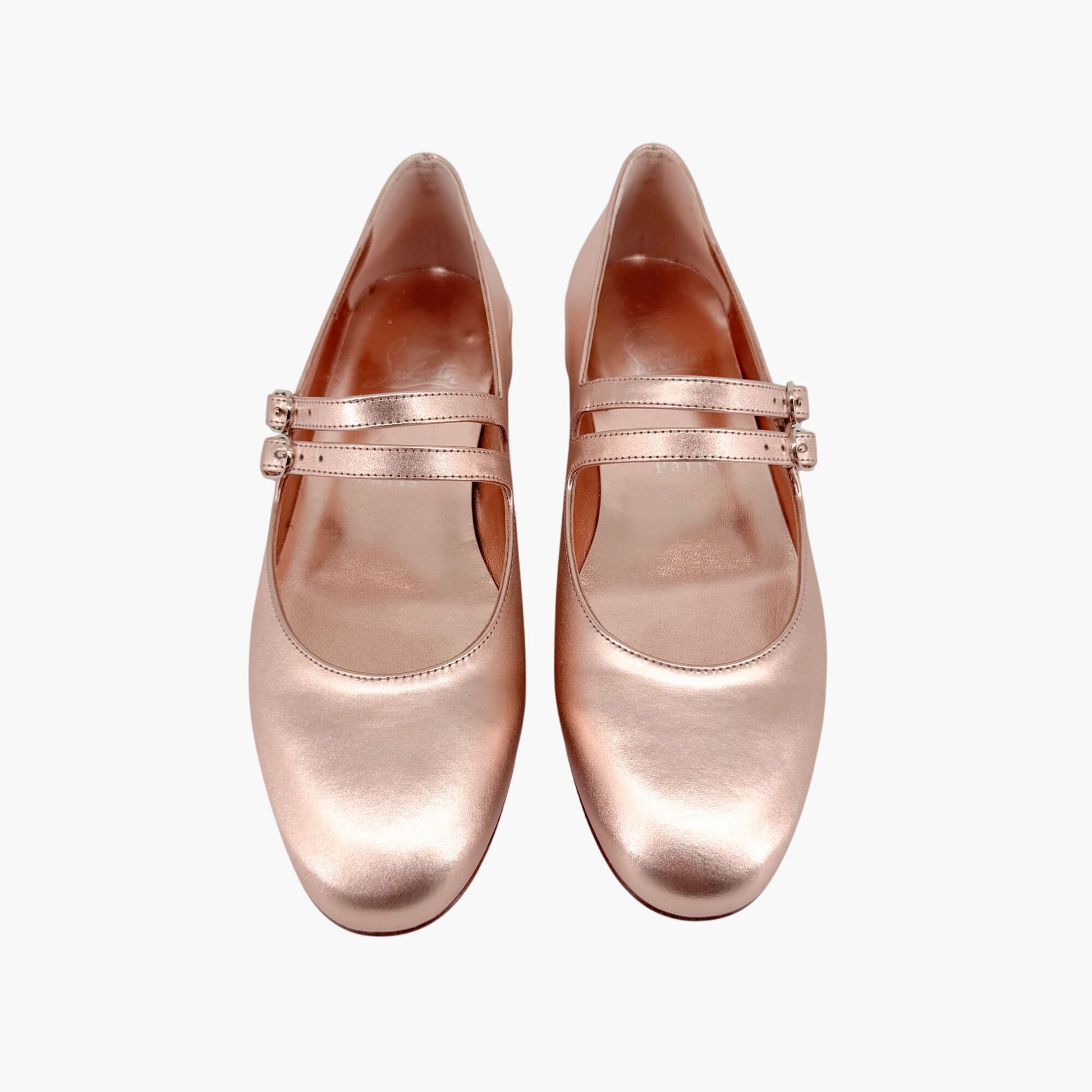 These Christian Louboutin Sweet Jane Flats bring a romantic shimmer to a timeless silhouette. Crafted in a Mary Jane ballet flat style, the metallic rose gold upper features double straps with adjustable buckles for a vintage-style touch. Designed with a classic round toe and low block heel, these flats offer elegance with everyday comfort. The leather footbed and lining provide a luxurious feel, while the signature red sole and leather outsole complete the look. Perfect for weddings, special occasions, or adding a soft glow to polished daytime outfits.