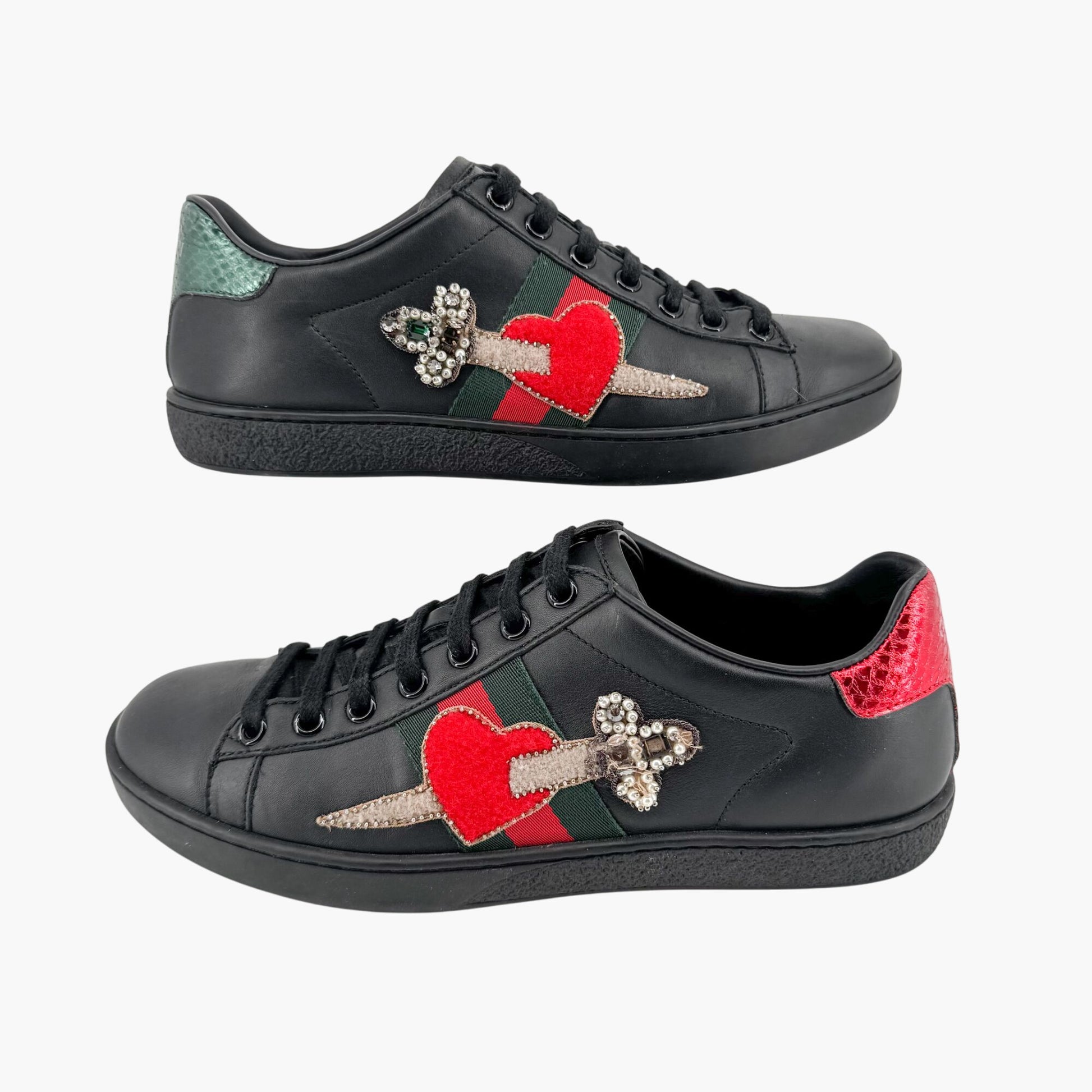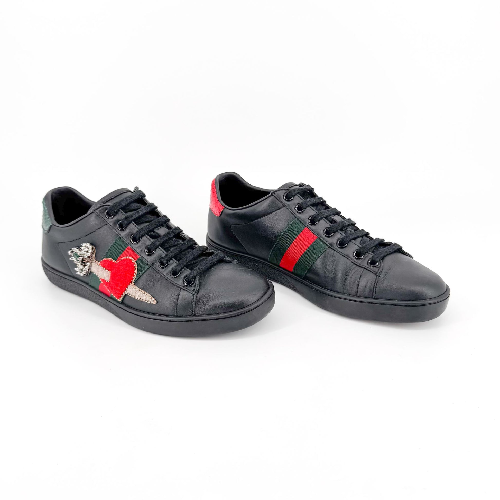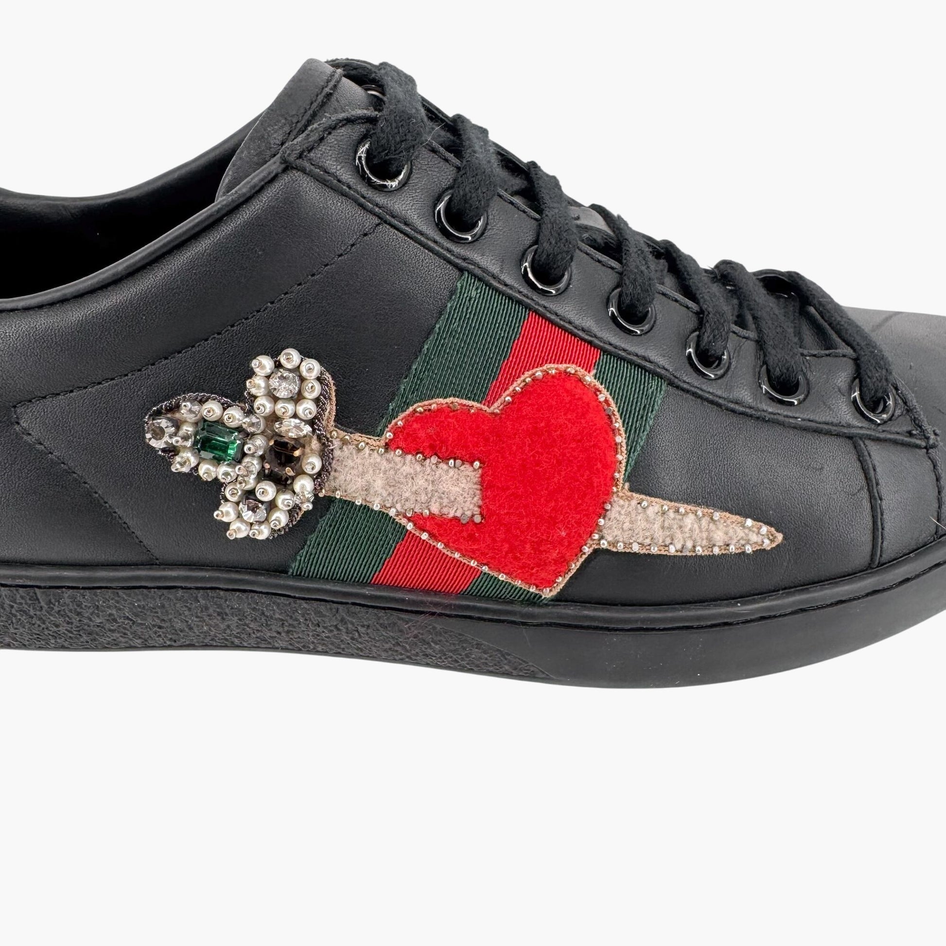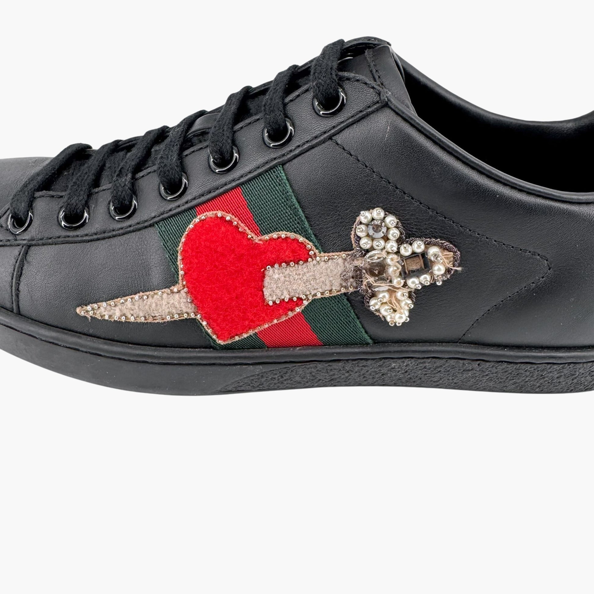 Gucci Ace Embellished Heart & Dagger Sneakers in Black Leather Size 36.5