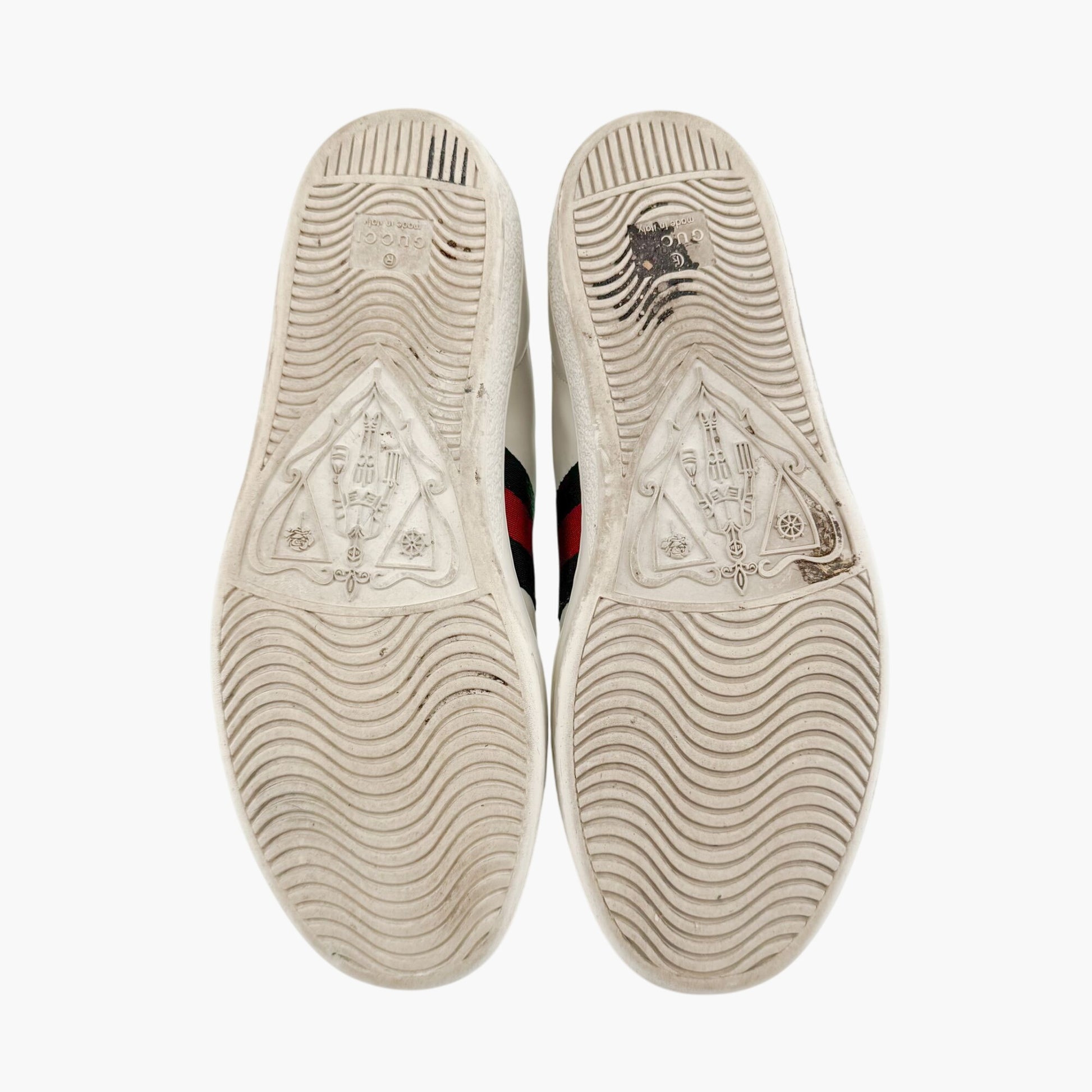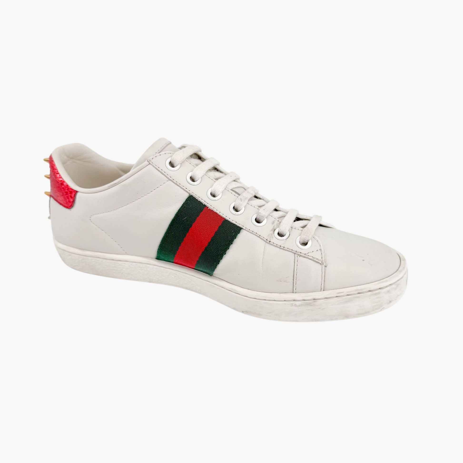 These Gucci Ace sneakers add a bold twist to a classic low-top silhouette. Crafted from smooth white leather, they feature Gucci’s signature green and red Web Stripe on the sides, embellished with elegant pearls and gold-tone studs for a luxe, eye-catching finish. A row of spike accents at the back of the heel adds edgy contrast, while the round toe and flat sole keep the look grounded and versatile. Finished with a leather footbed, soft lining, and durable rubber outsole, these sneakers are perfect for adding statement style to casual outfits, streetwear looks, or off-duty days with a designer edge.