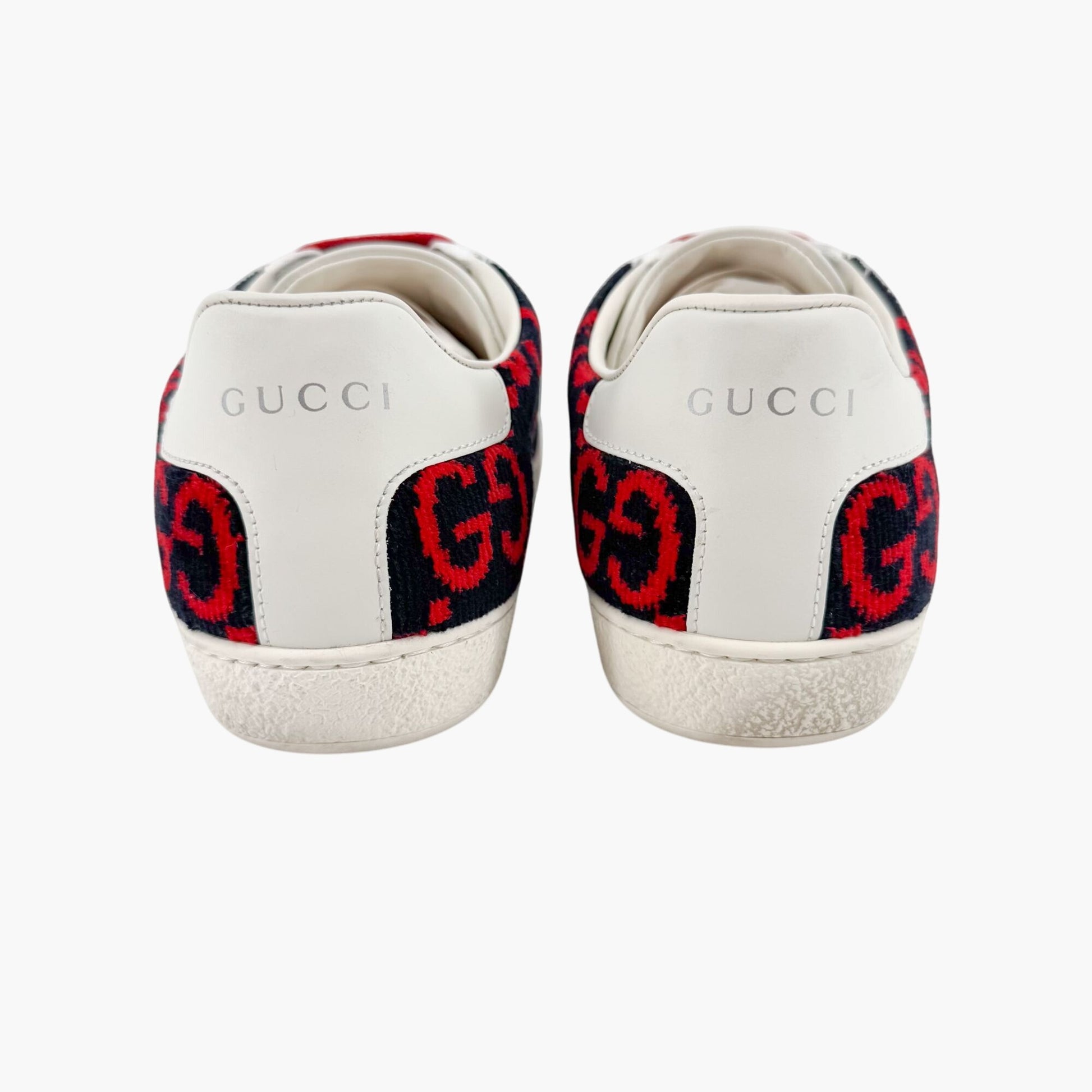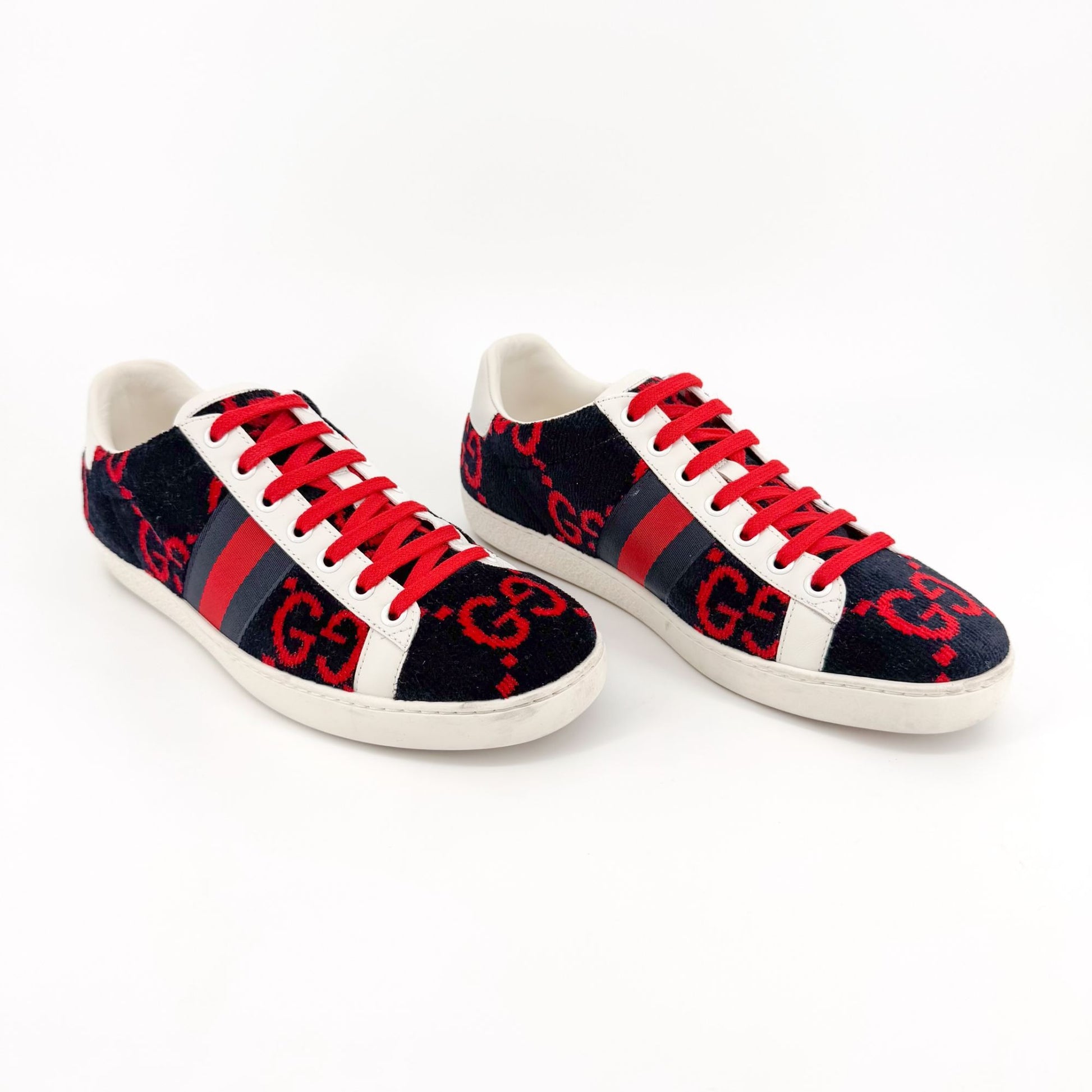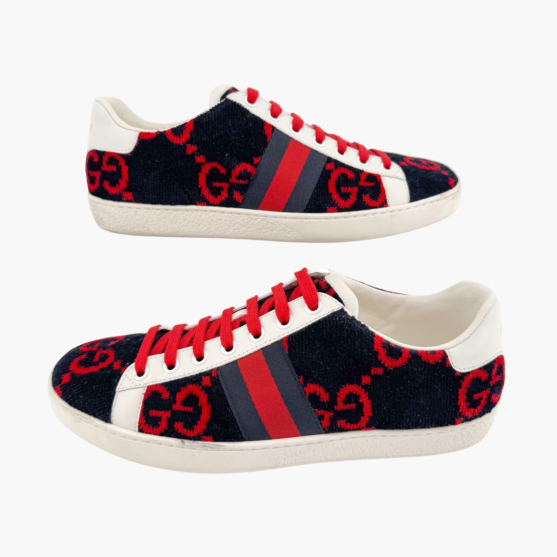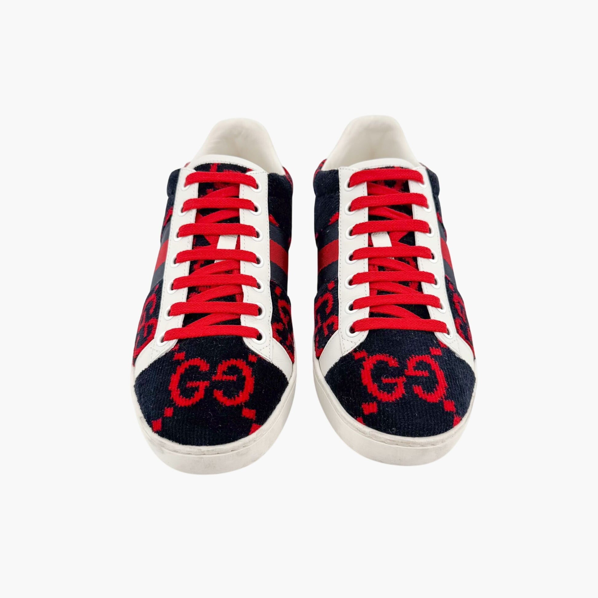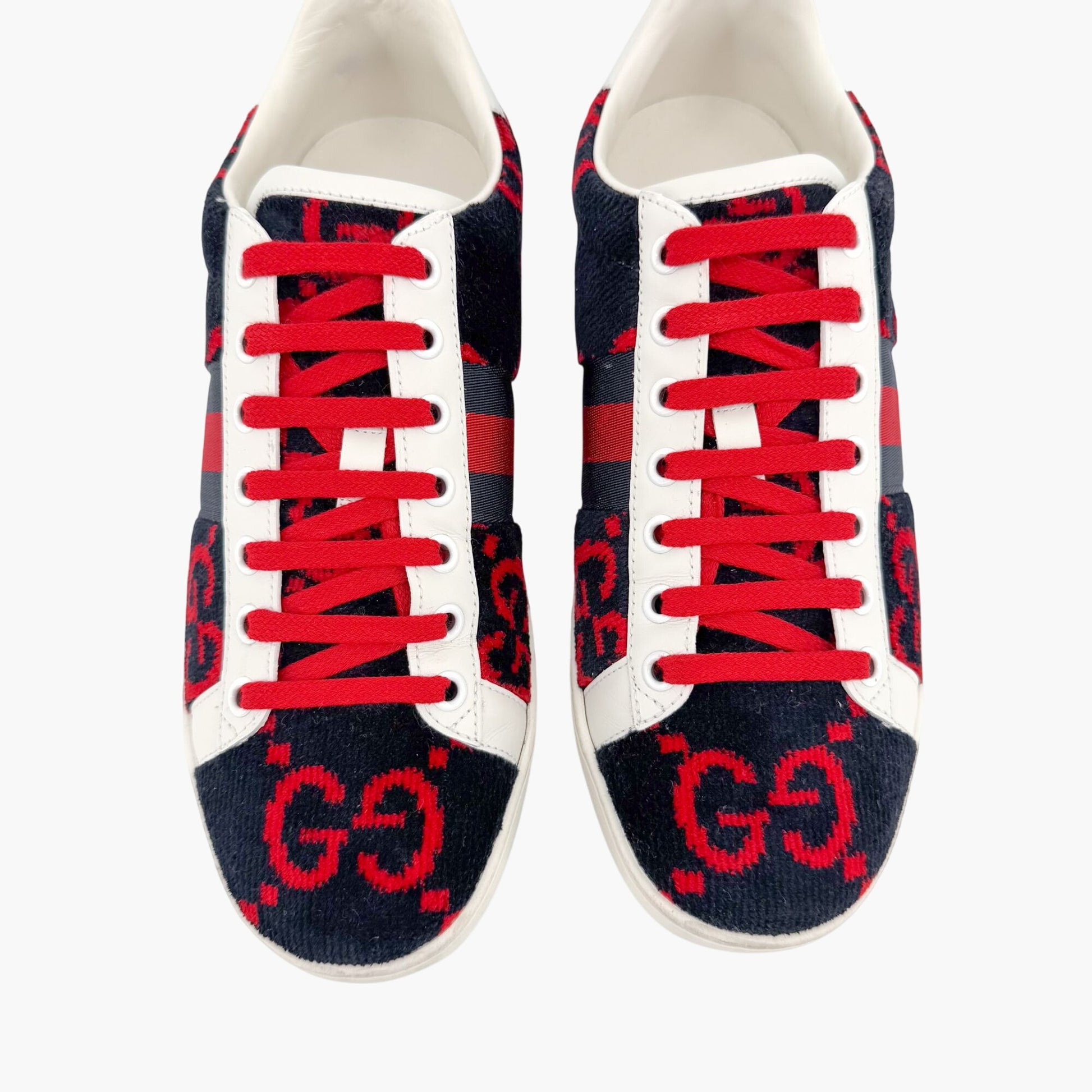Gucci Ace Sneakers in Navy & Red GG Monogram Corduroy Fabric Size 38