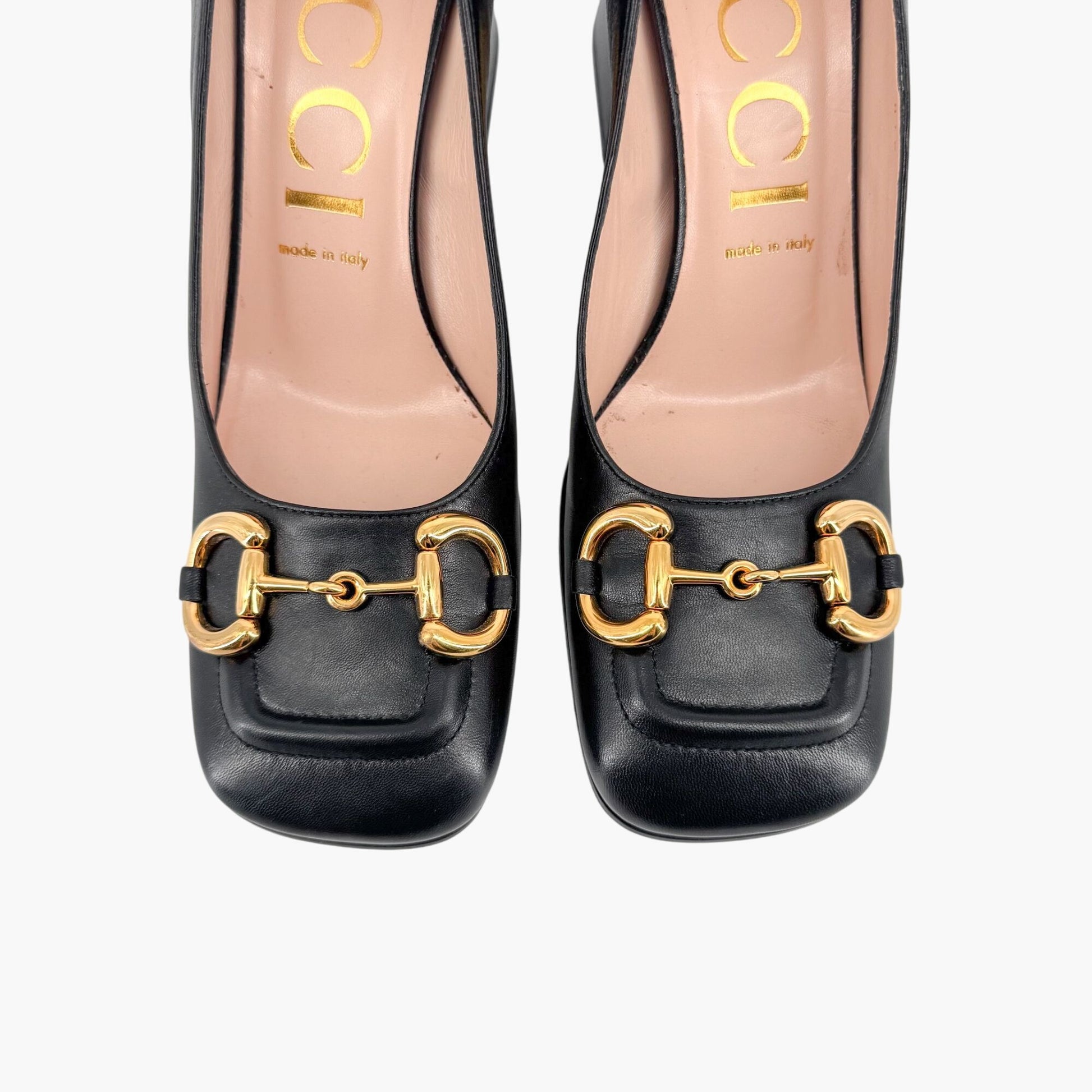 These Gucci Baby Horsebit pumps feature black leather uppers with oversized gold-tone Horsebit buckle accents. Designed with square toes, slip-on styling, and chunky block heels with mirrored undersides, they bring bold sophistication to both professional and evening wear.