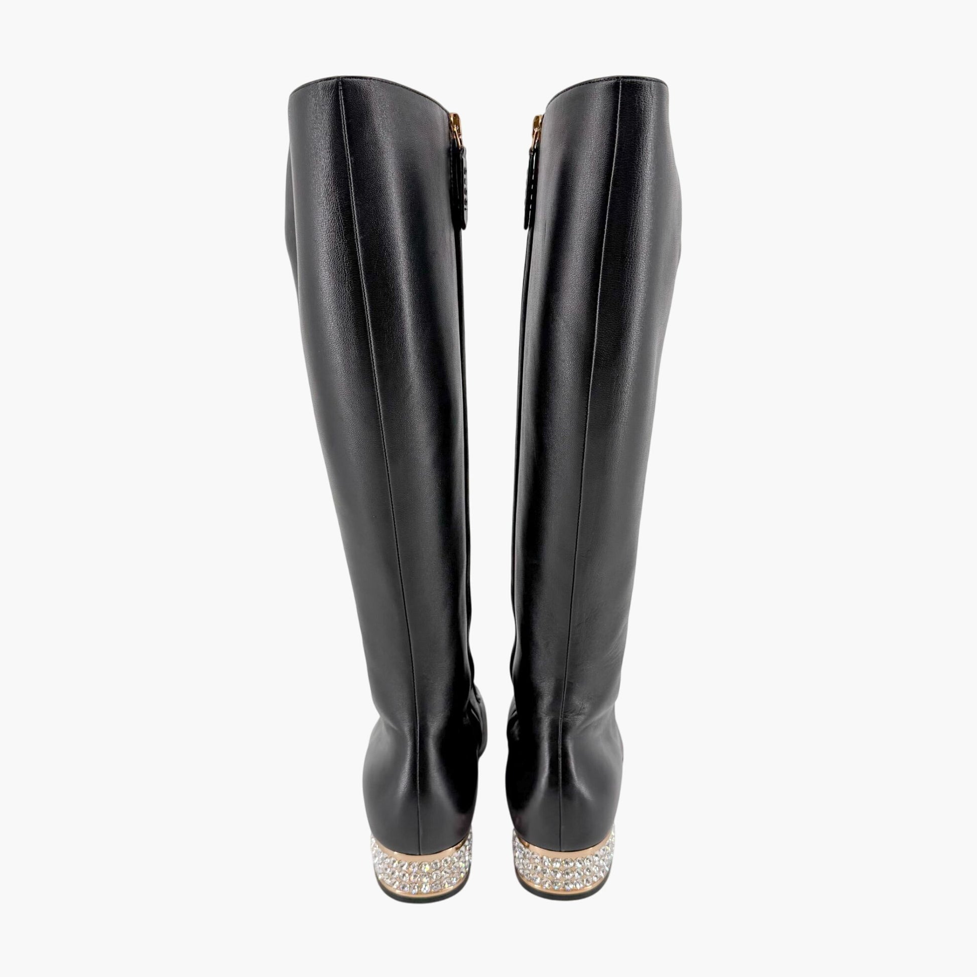 These Gucci Mister knee-high boots feature smooth black leather uppers with side zip closures, round toes, and gold-tone Horsebit buckle accents. Designed with leather lining, leather footbeds, and low metallic gold block heels detailed with crystal embellishments, they bring timeless equestrian elegance to modern styling.